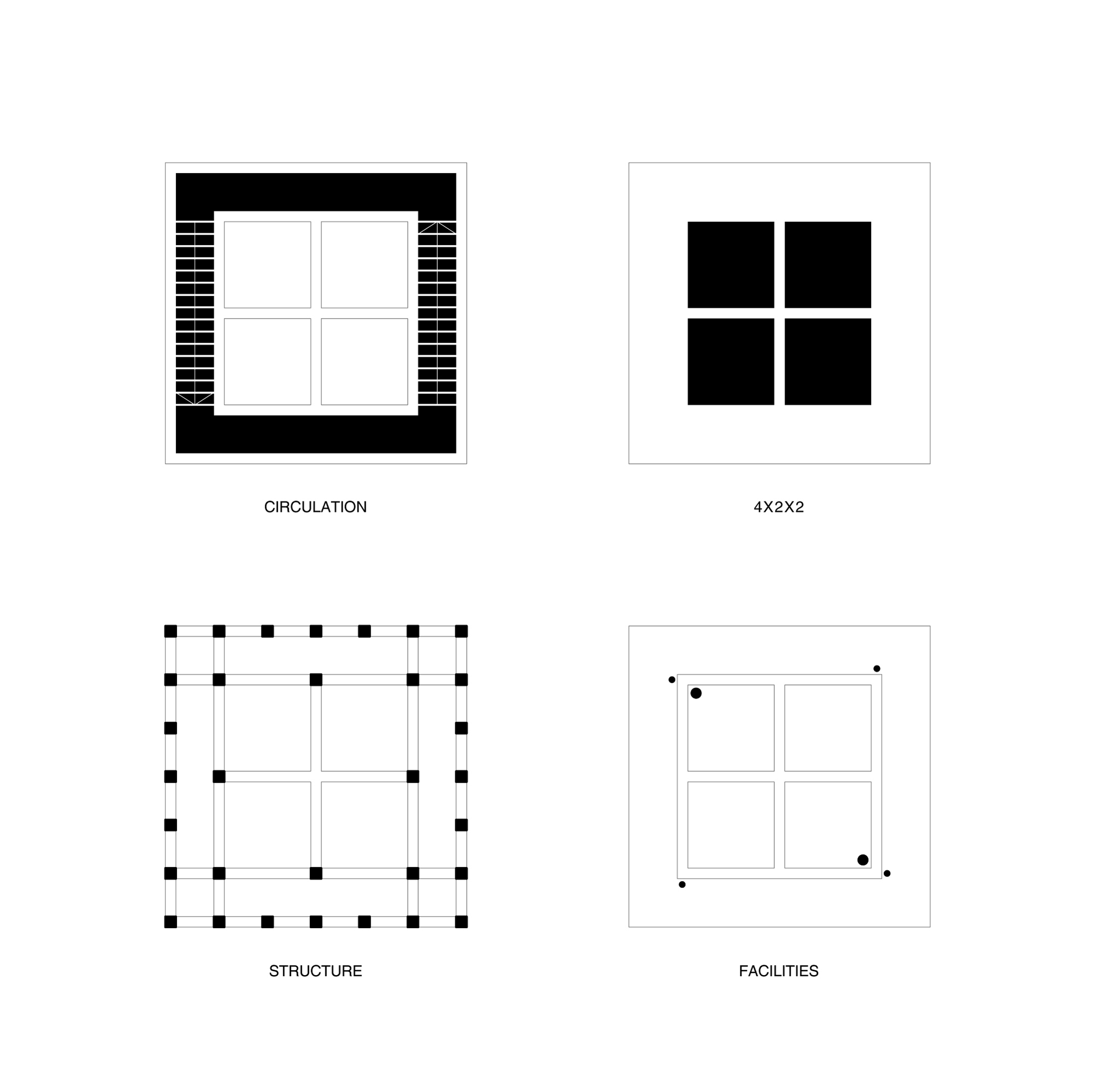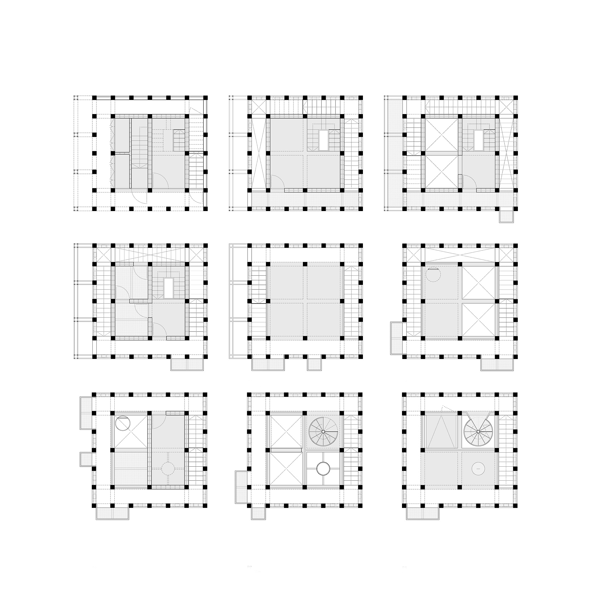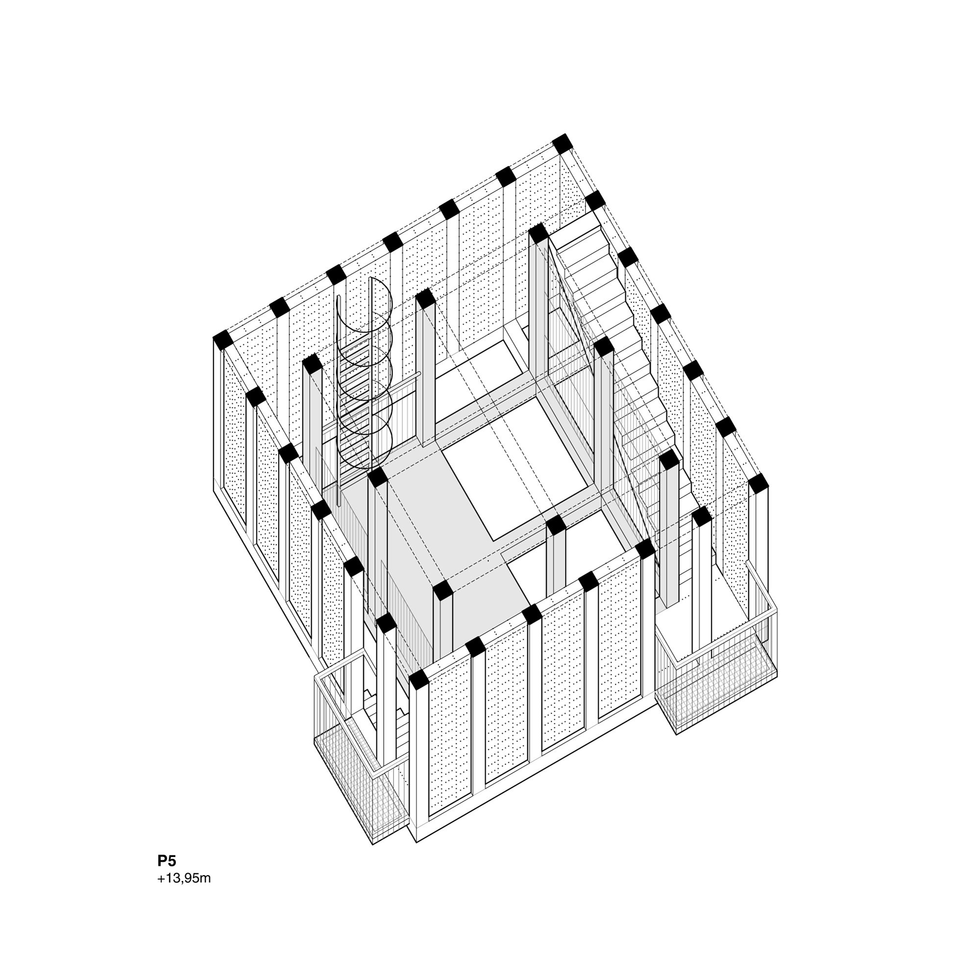 The tower is proposed as an open system that allows great flexibility and functional adaptation to accommodate current programmatic requirements and anticipate future changes in use. A 7.15 m square floor plan is proposed based on a grid of concrete pillars and girders that generate a three-dimensional mesh from which 4 empty spaces of 2 x 2 m are obtained on each floor in order to accommodate a multiplicity of spatial situations with maximum adaptability. to the program. The interior spaces recreate extreme building situations to allow firefighters to develop their practices (double and triple spaces, spiral staircases, cat ladders, wells, doors, windows, etc.) while on the outside there are balconies in different positions to enhance rappelling and vertical rescue practices.
