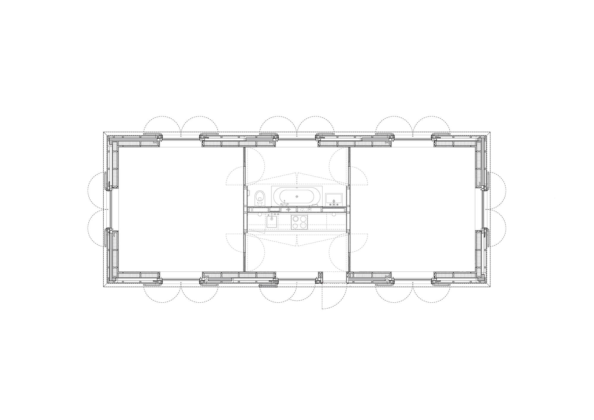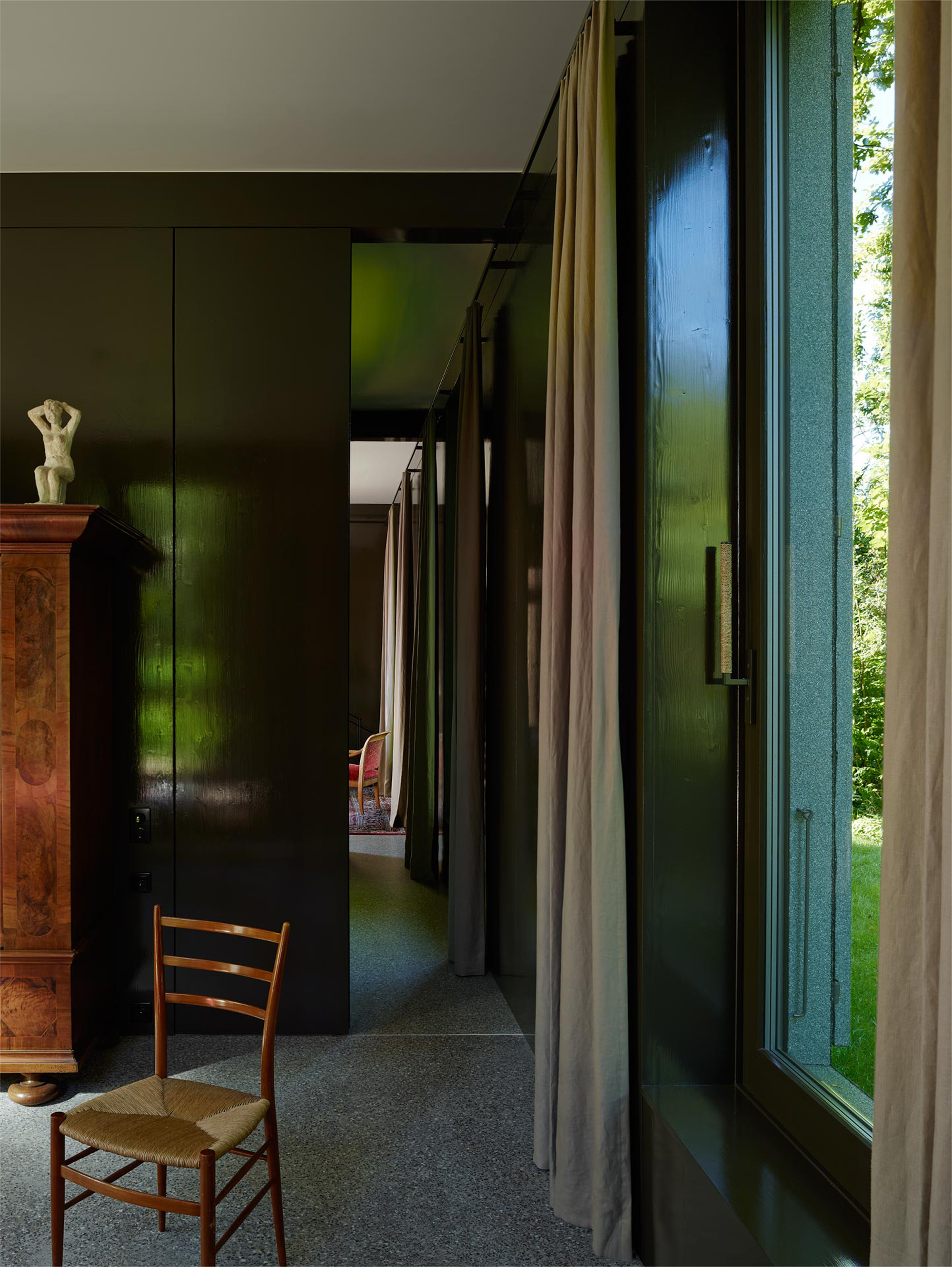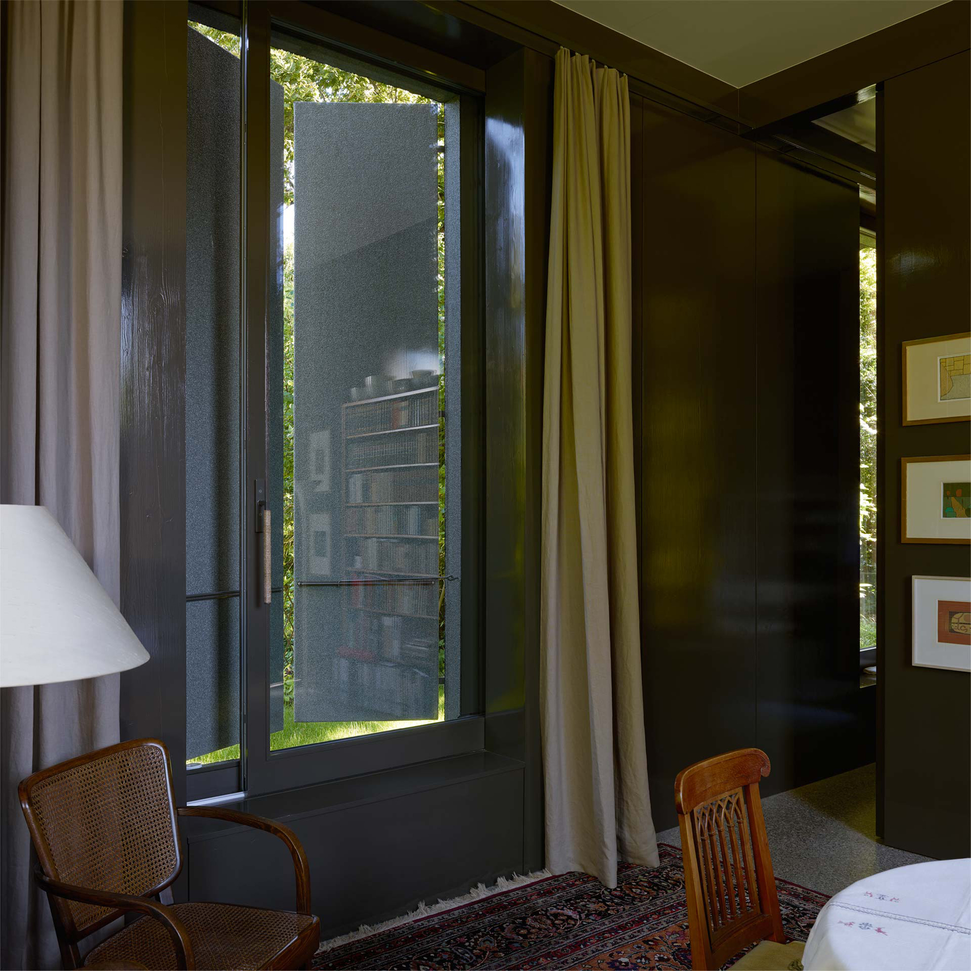 The cladding design hints at a classical composition of base, shaft, and crown, giving the volume an unexpected formal stance. Large shutters completely obscure the pavilion’s interior and recompose the unity of the outer walls. Inside, an enfilade of three main spaces is reminiscent of a bourgeois interior. Two square living spaces are symmetrically arranged on each side of the core, where big movable panes hide a bathroom and a kitchen. The wood cladding the interior walls is painted in an opulent olive green that reflects onto a cold light-sanded concrete floor, a material palette once again closer to a villa than a backyard barn. Through generous windows, the surrounding garden acquires a dominant presence in the rarefied space of the pavilion.