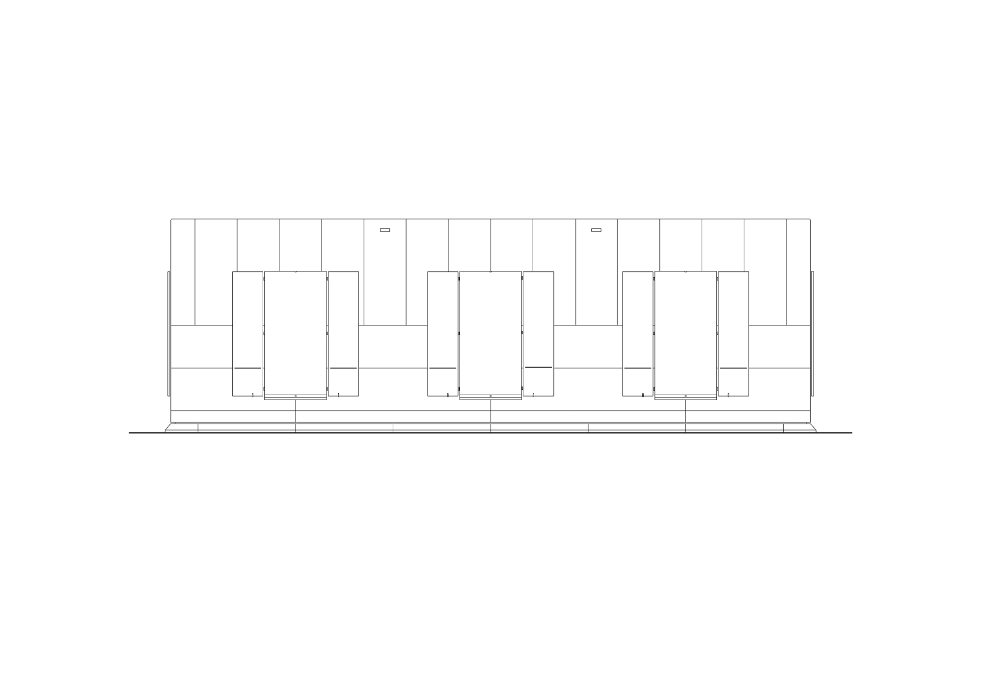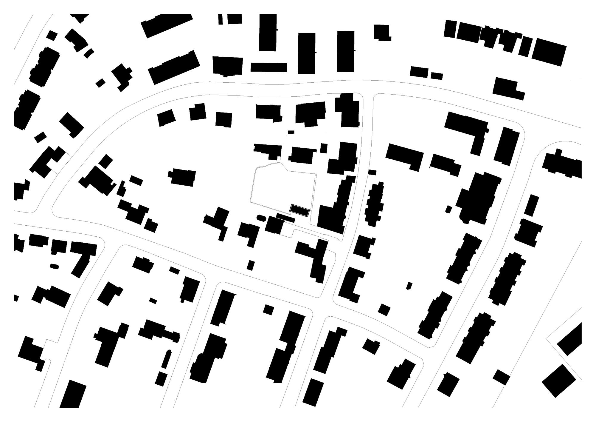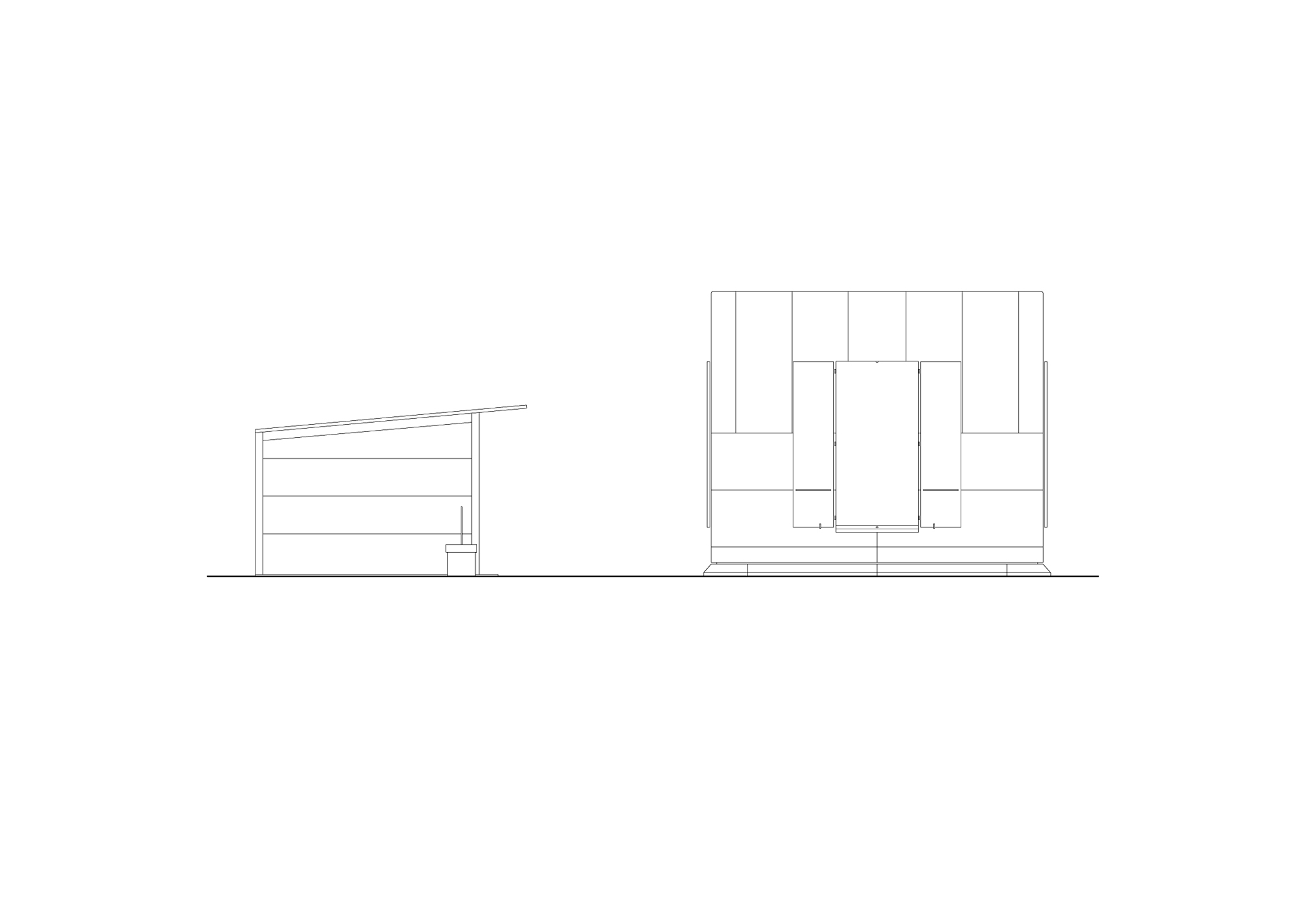 Immersed in the extensive garden of a 1930s villa in a residential neighborhood, a small wooden structure stands as a contemporary interpretation of the backyard barn. The facade’s rough and inexpensive material suggests the building might not be finished or might receive an additional floor. Resembling the fragment of a palazzo, its flat facade is articulated by a row of large vertical windows punching the roofing-paper cladding.