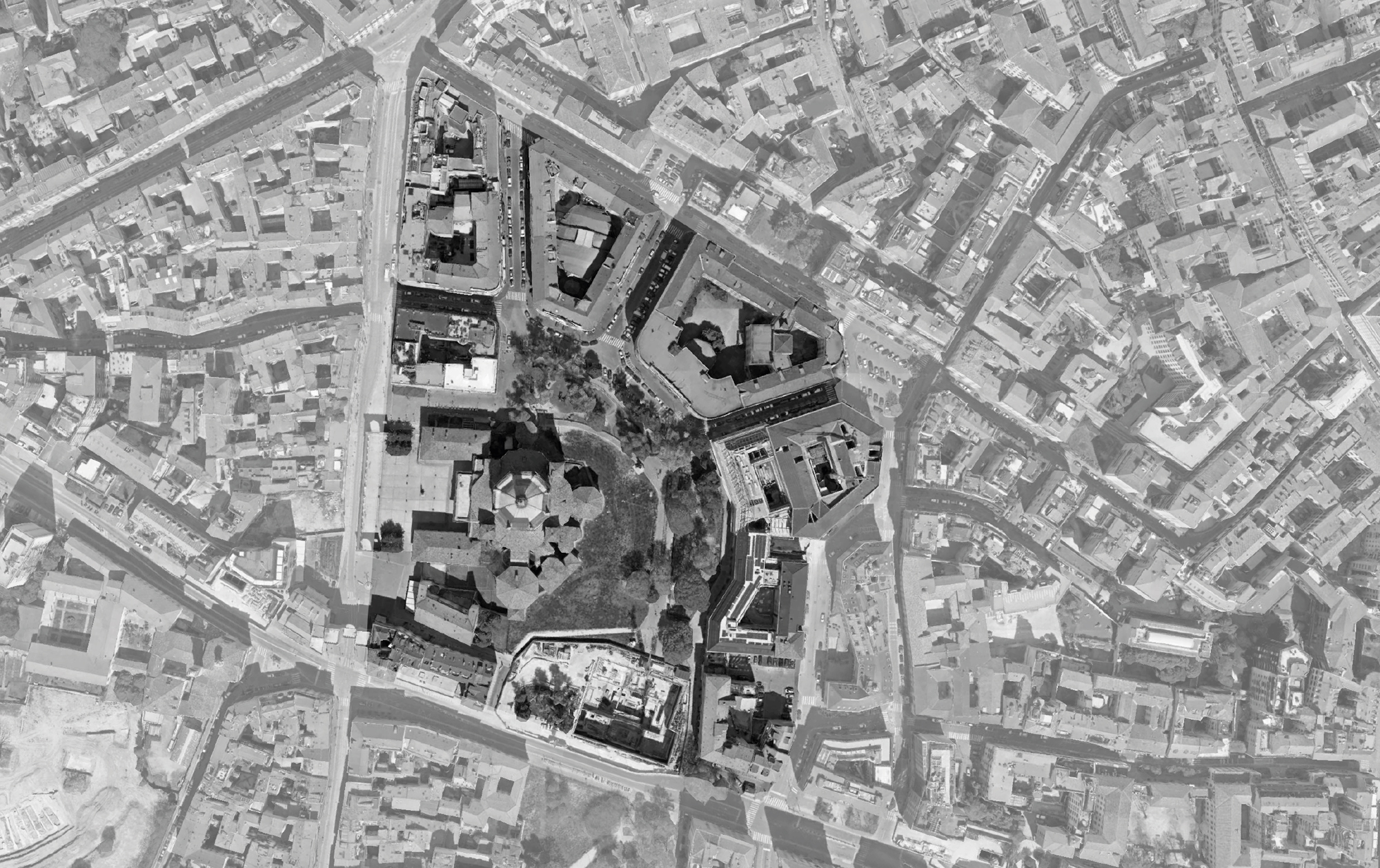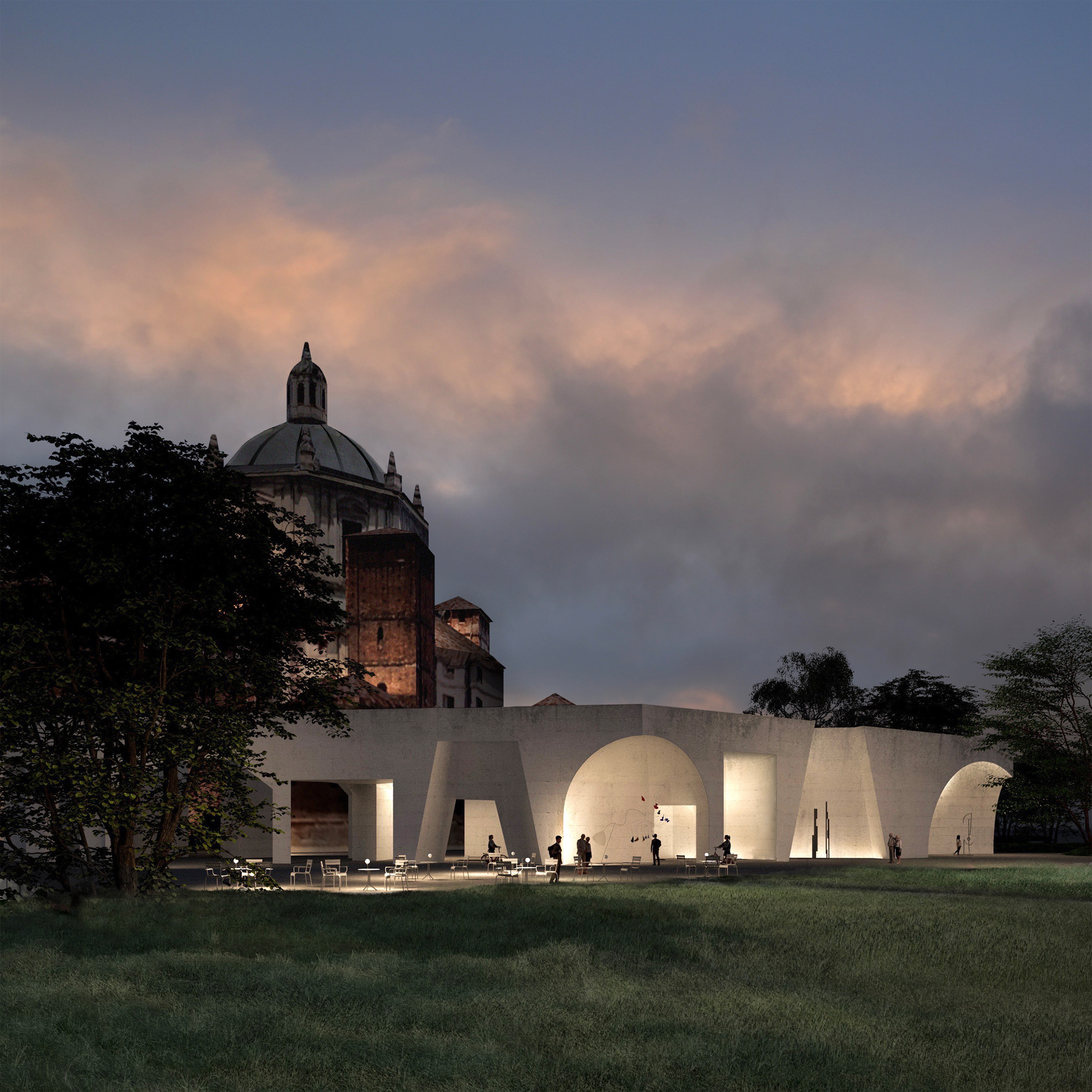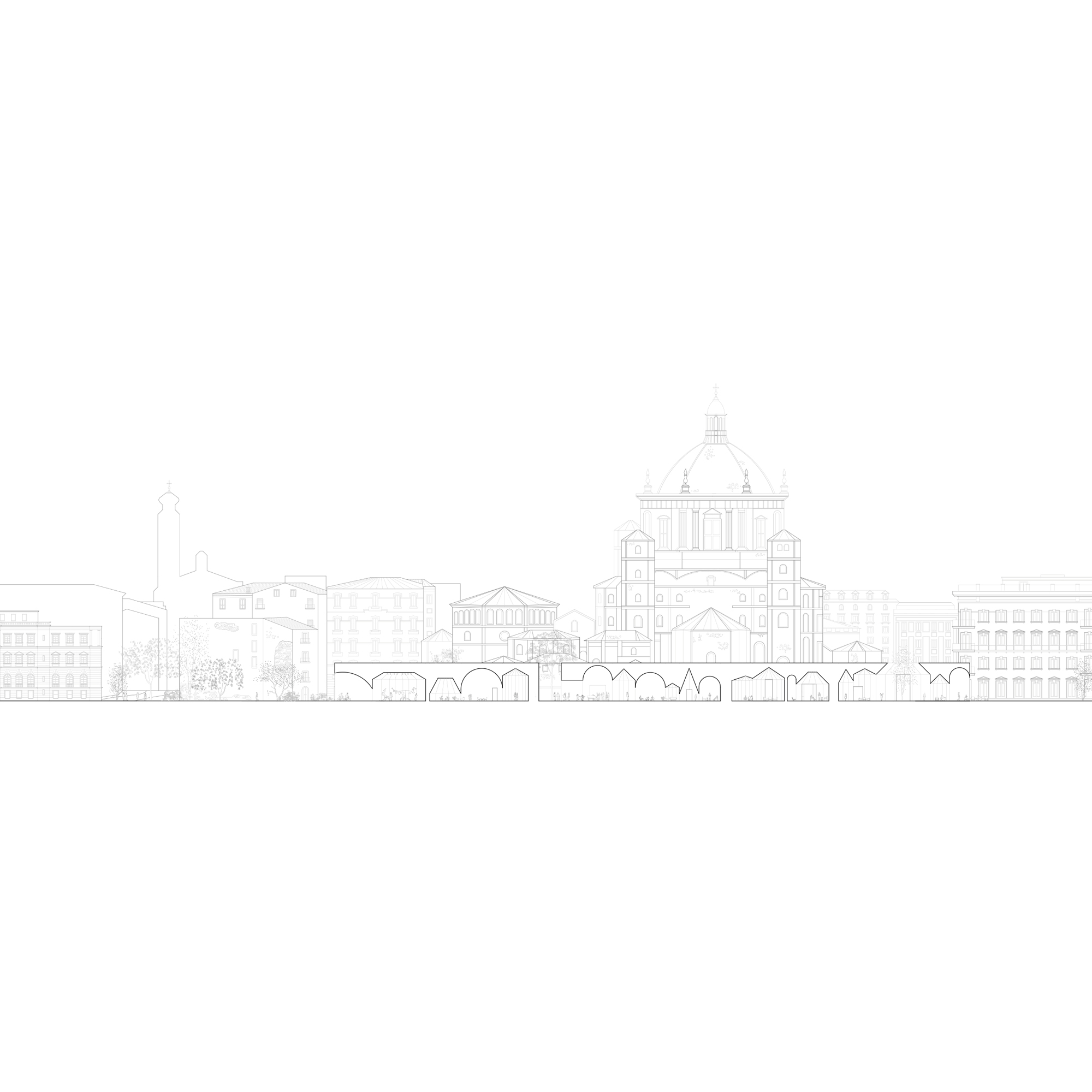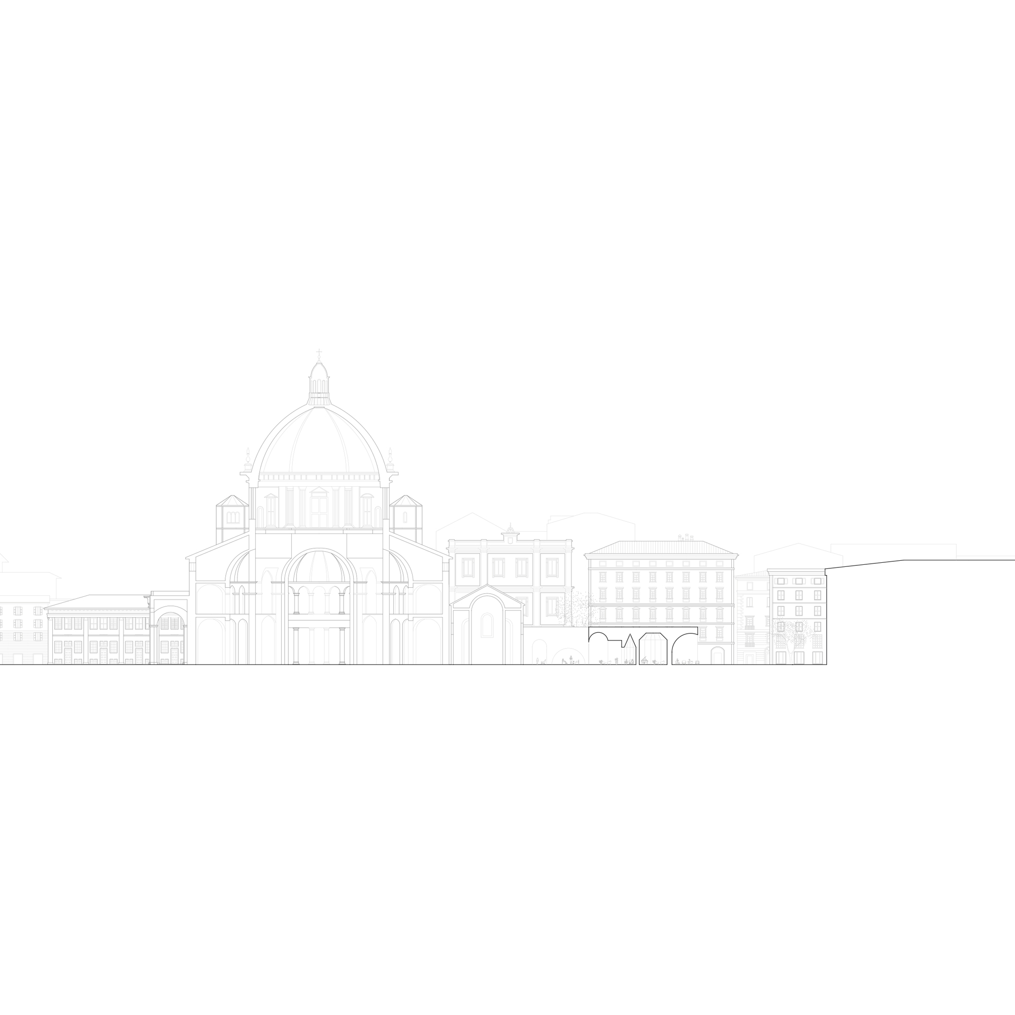 The public space, redefined in this way, forms a large semicircular square whose center is occupied by the Basilica itself, while outwardly a linear green space reconnects with the John Paul II Park, thanks to the partial closure to traffic of Via Molino delle Armi and the reopening of the section of the Naviglio buried in 1929.