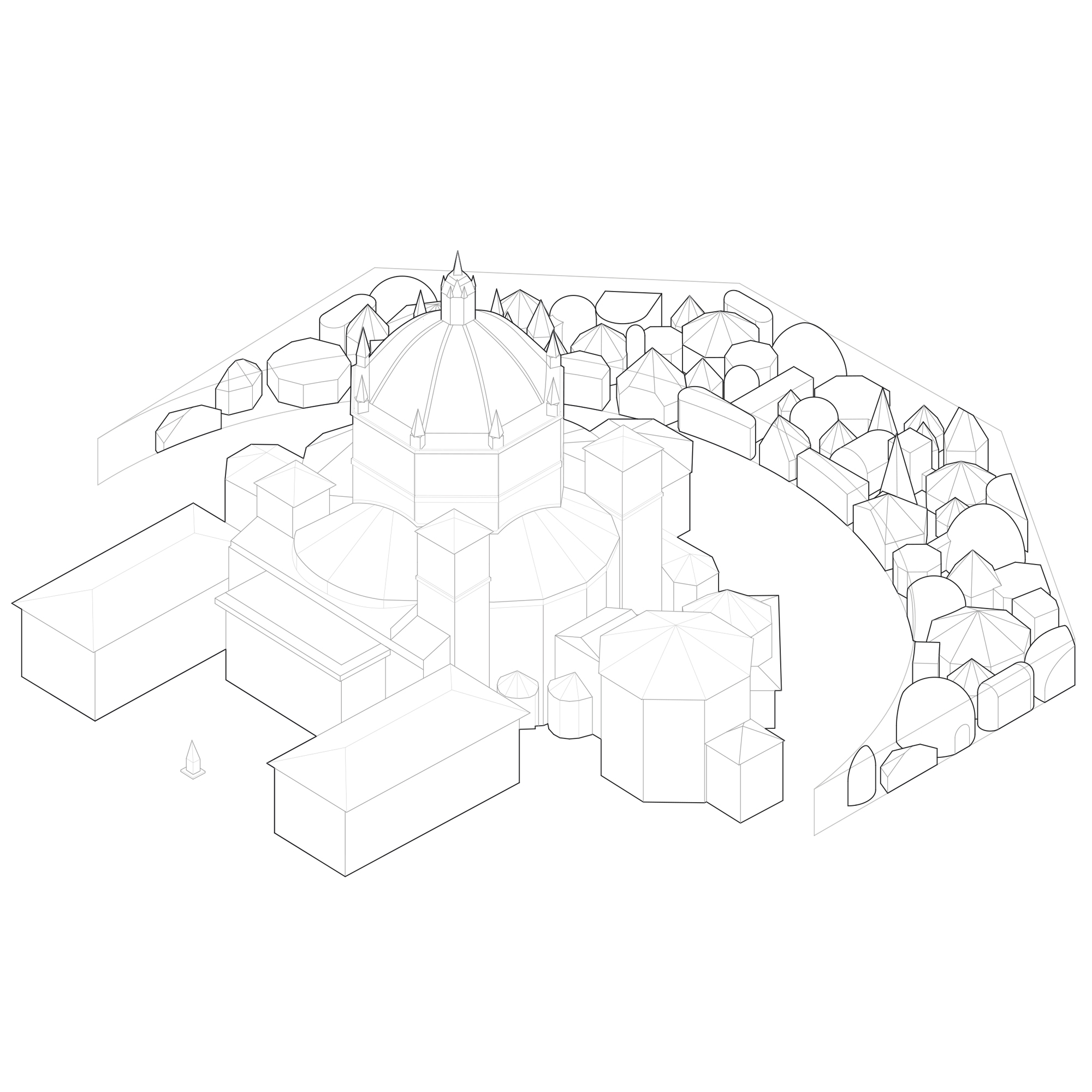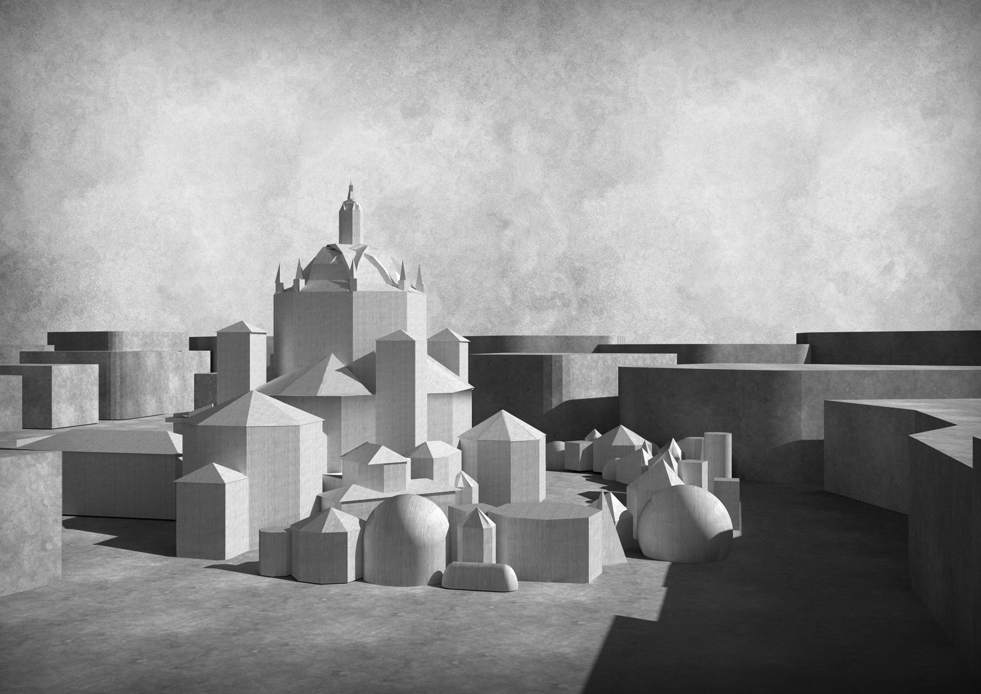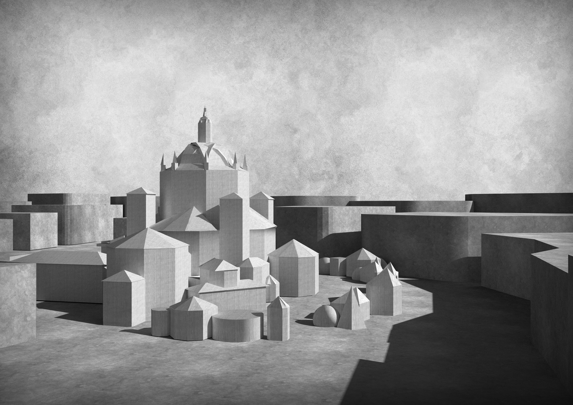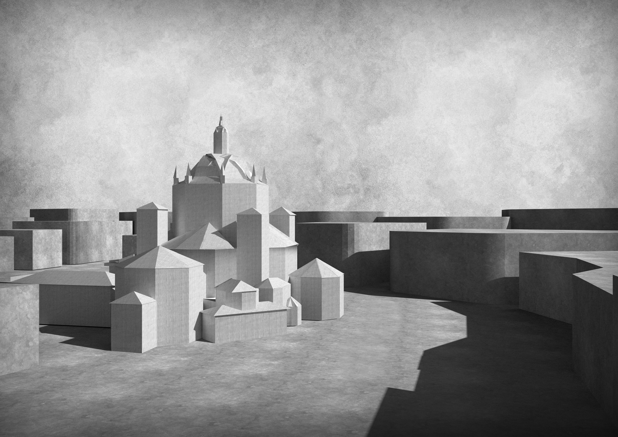 The dialogue with the historic monument is based on a common geometric alphabet: the internal spatialities of the new intervention take up the forms of the apses and side chapels of the church and are the result of a process of addition of hexagonal, cubic, spherical, and pyramidal voids, which re-proposes the fifteenth-century forms in a contemporary key.