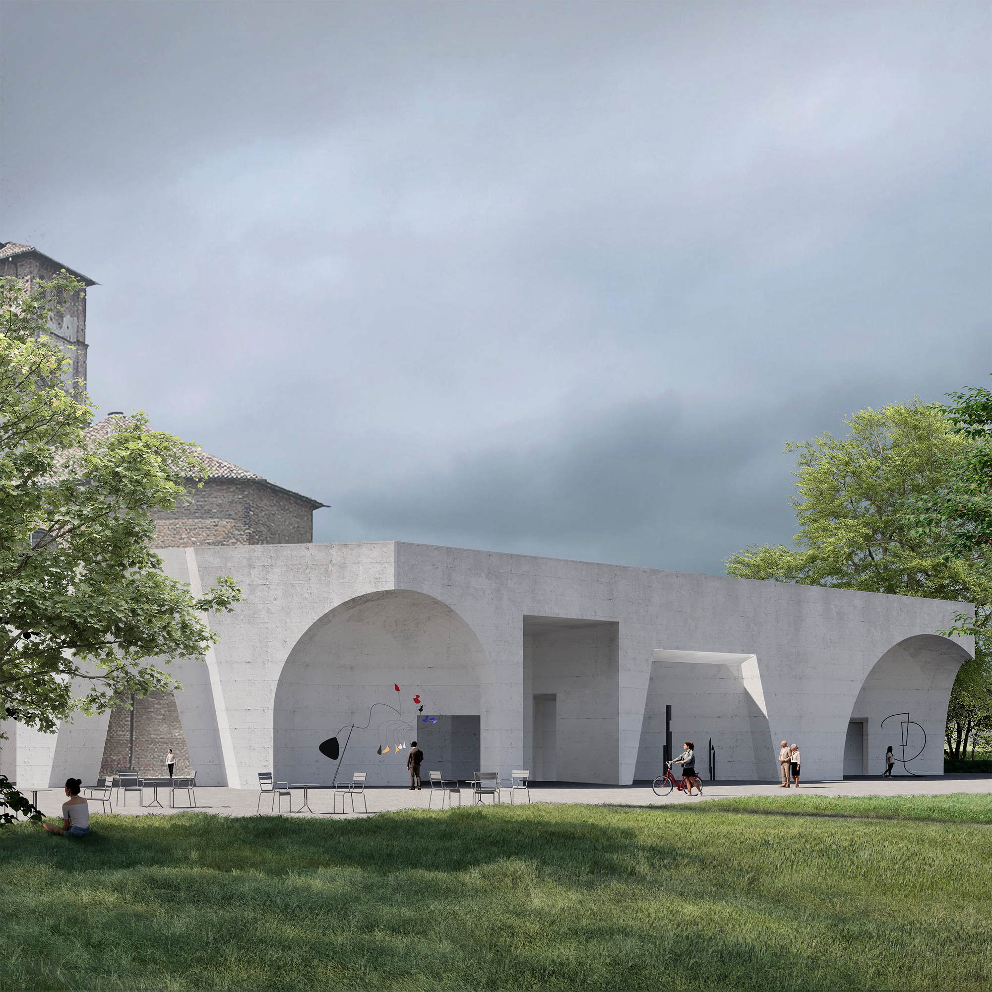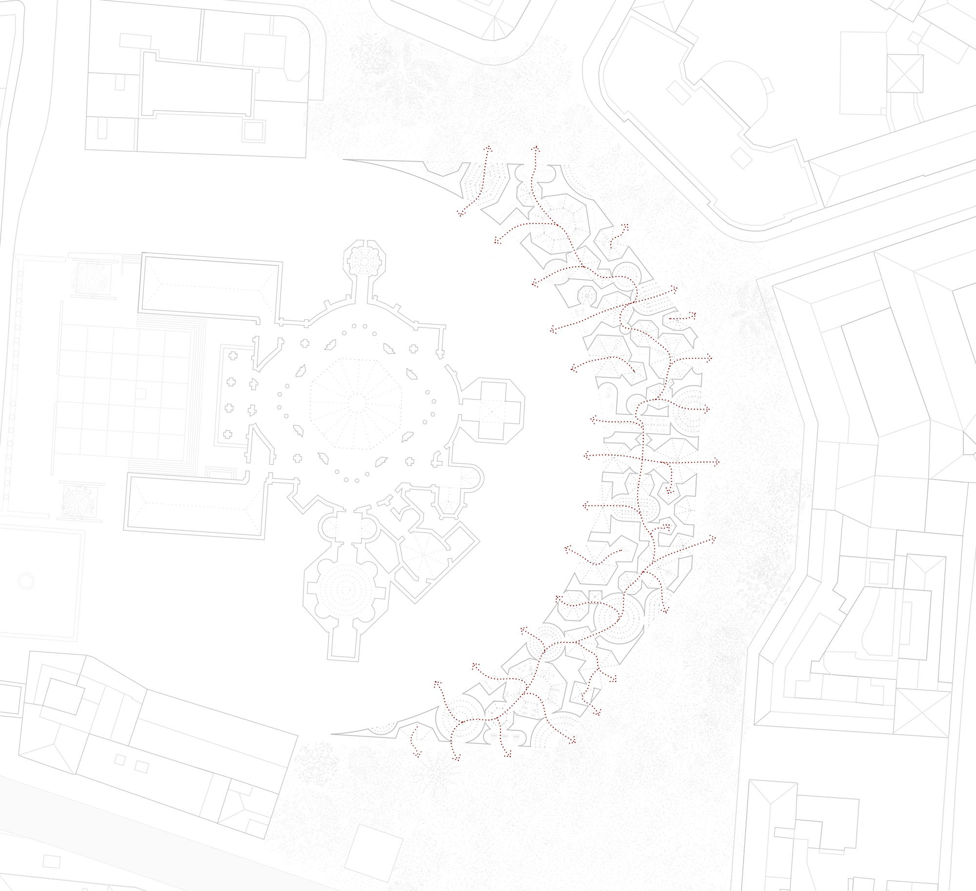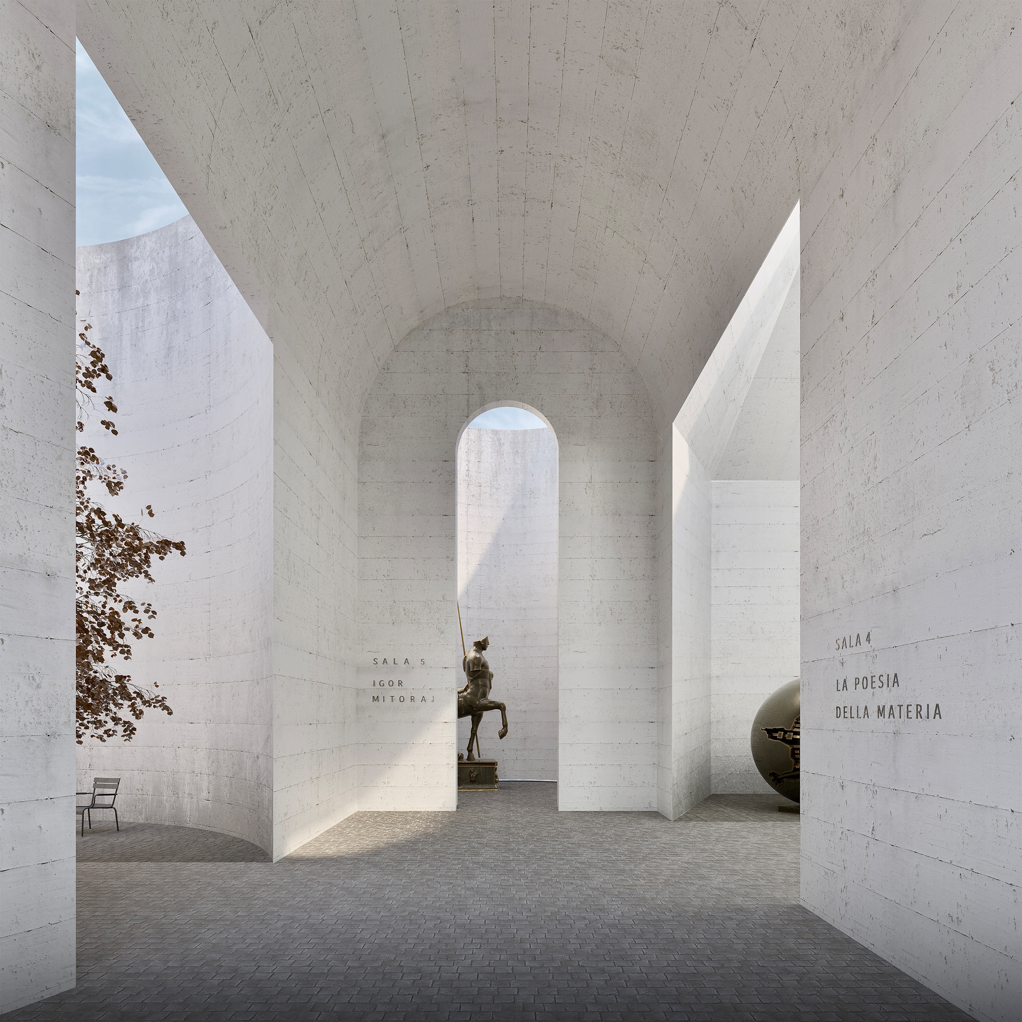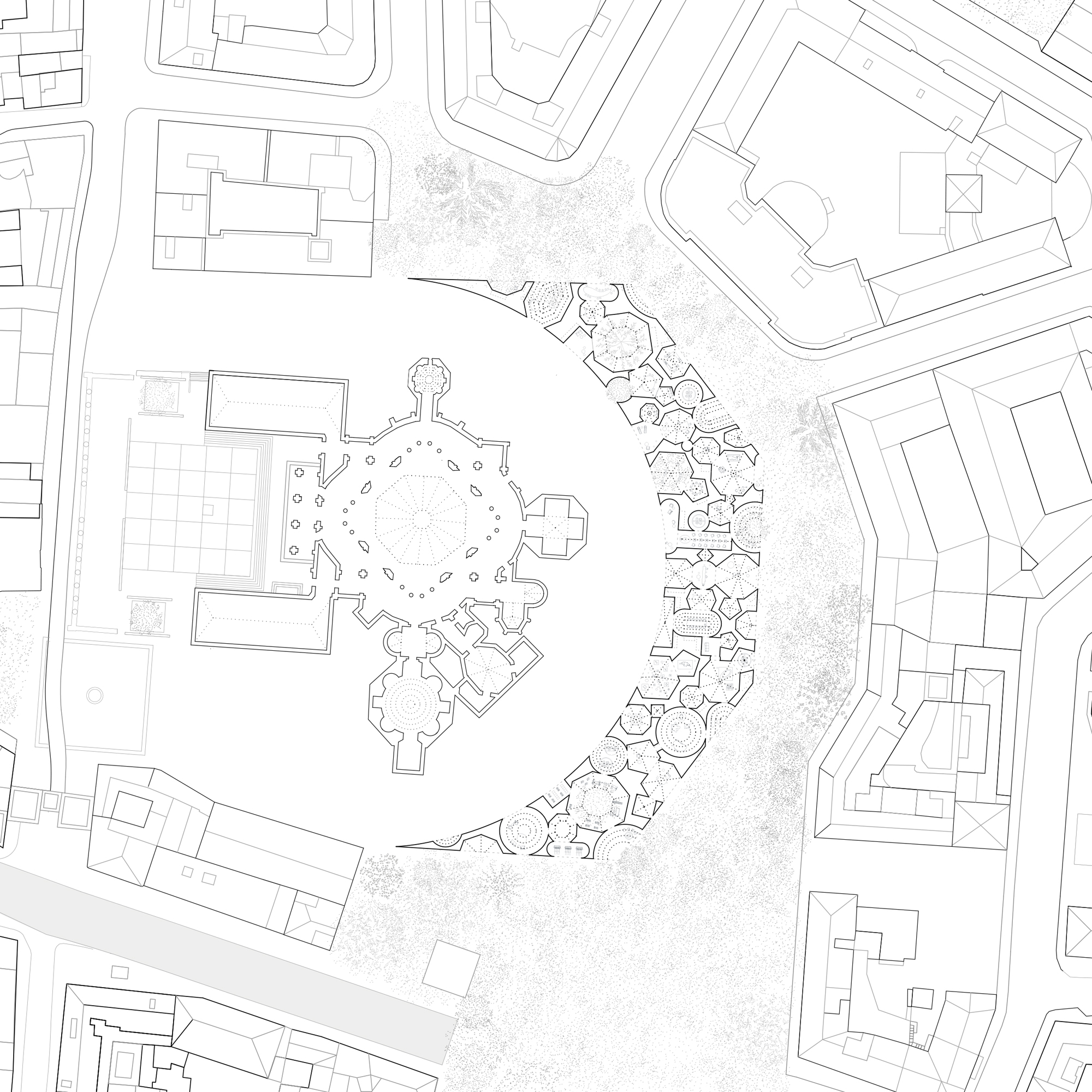The project aims to establish a strong relationship with the pre-existence thanks to the intersection of two pure geometric figures, the octagon and the circumference, generated by the main axes of the context and capable of re-establishing a clear hierarchy between solids and voids.