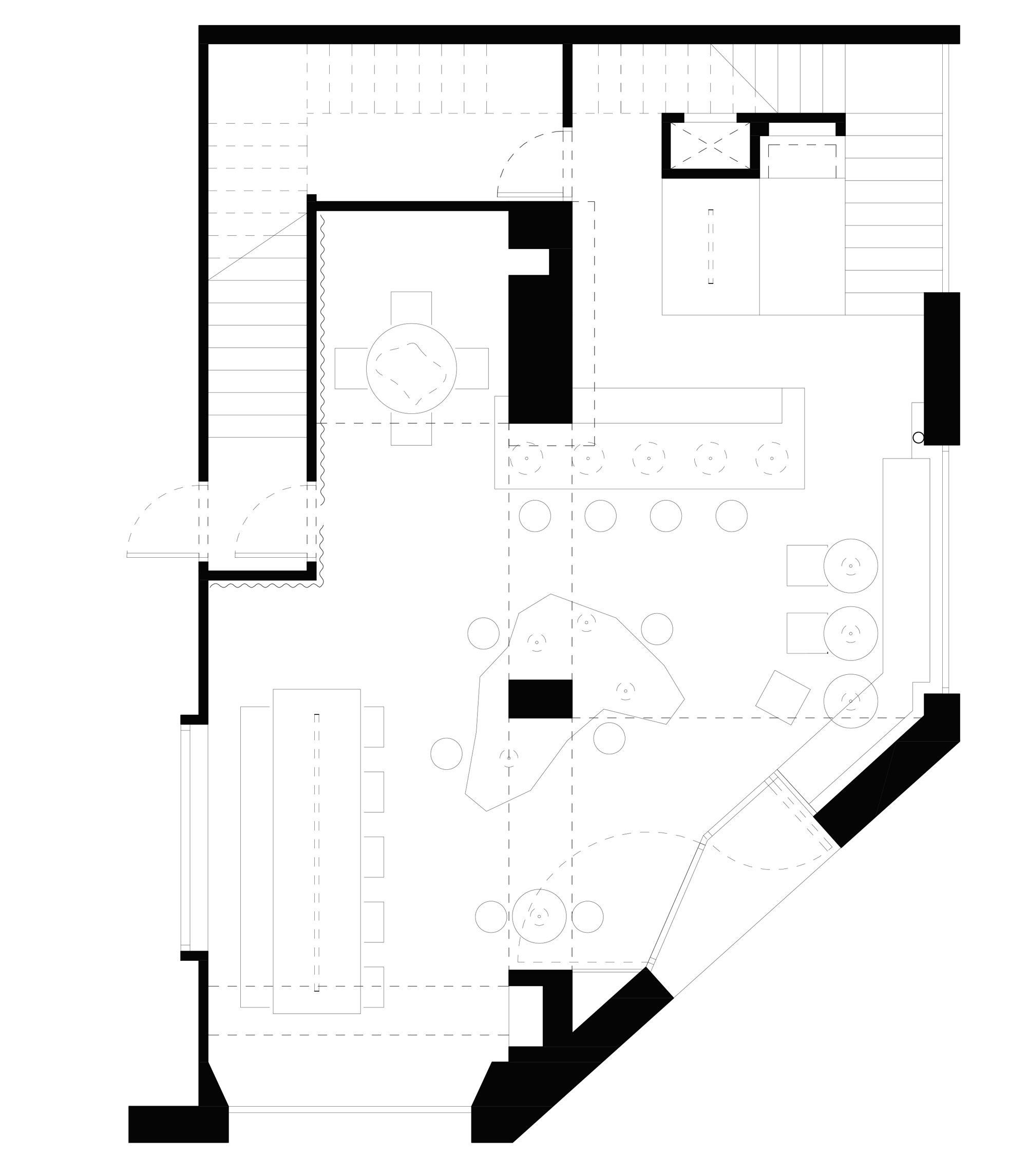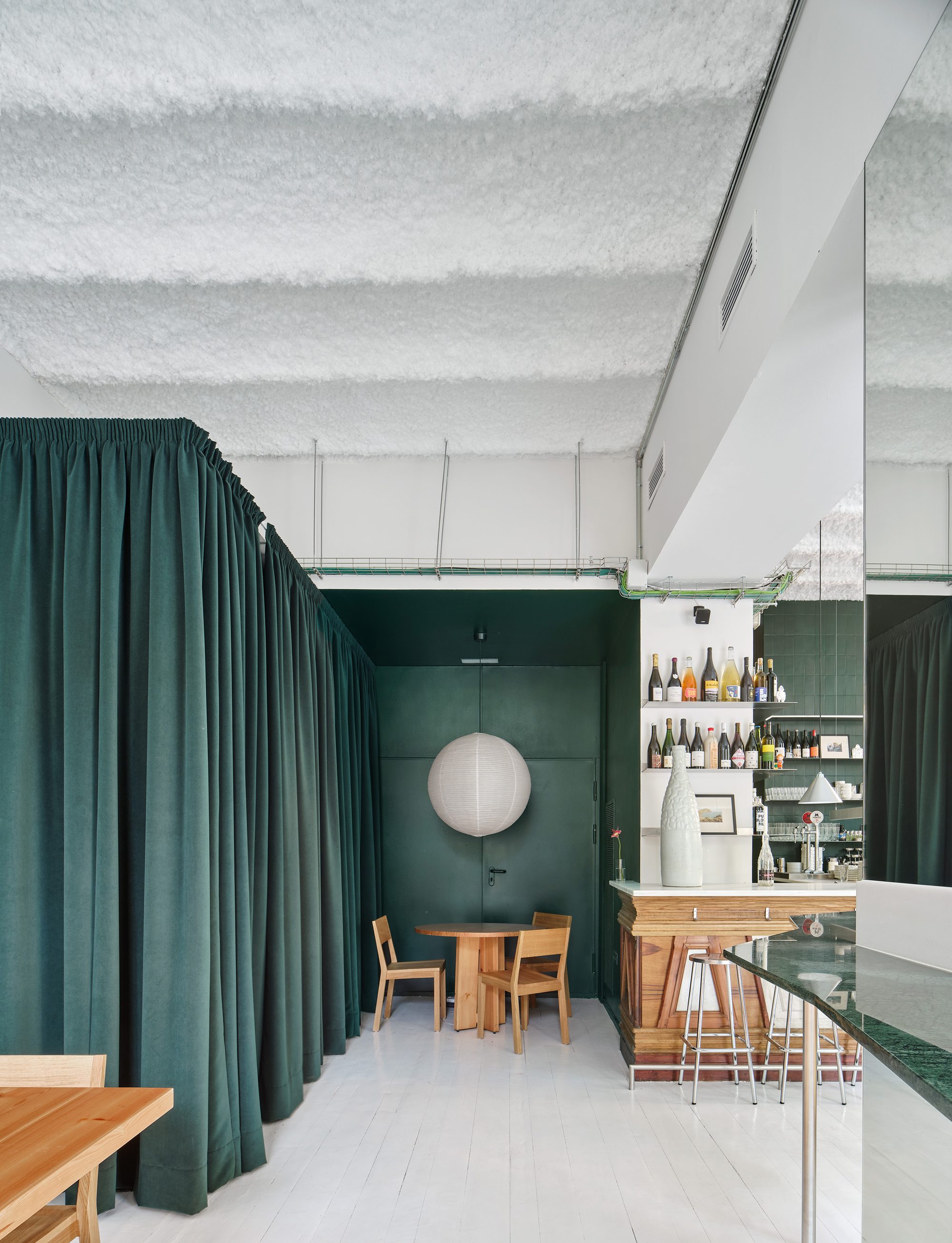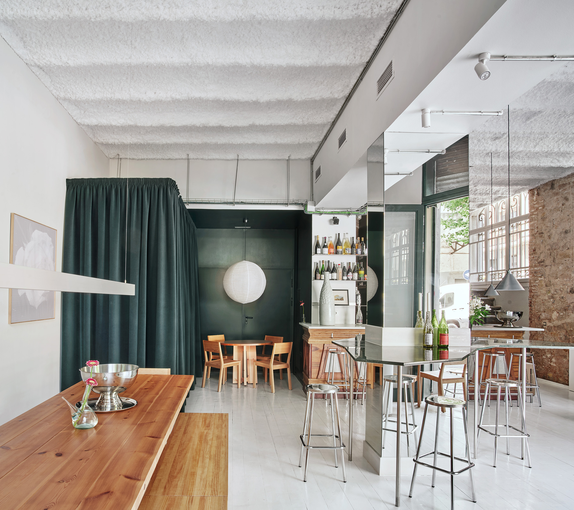 El Tiberi Bar envolta als seus visitants en una atmosfera etèria i lluminosa, submergint-te en una vivència espacial de núvol vaporós. El cotó projectat al sostre, els paviments de fusta pintada blanca amb expressió de la veta, les parets originals despullades de revestiment ensenyant les filades de maó i les cortines vellutades plisades juguen són la clau per a aconseguir aquesta sensació de lleugeresa visual a través de la combinació de materials flonjos, suaus i texturats de colors clars contrastats amb foscos.