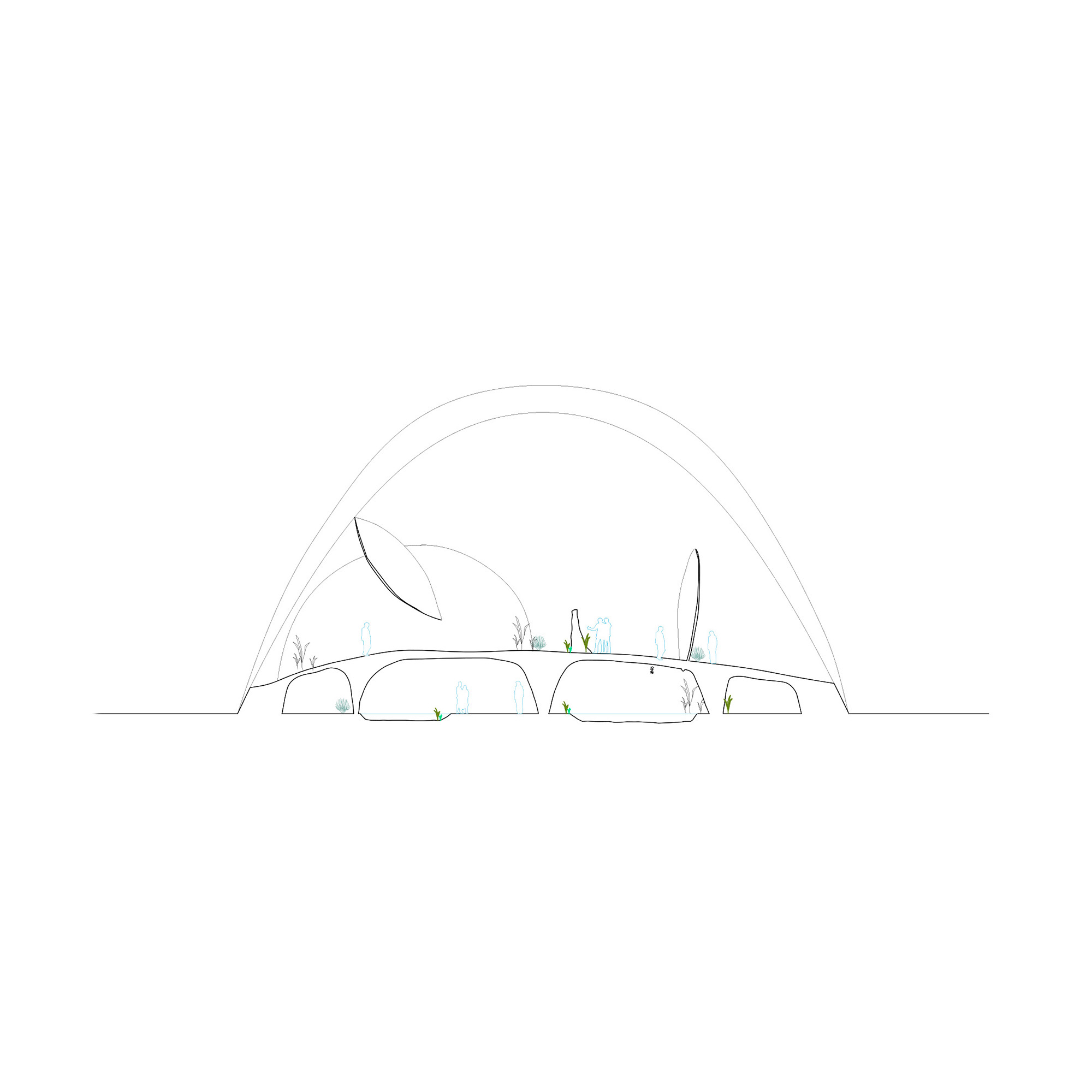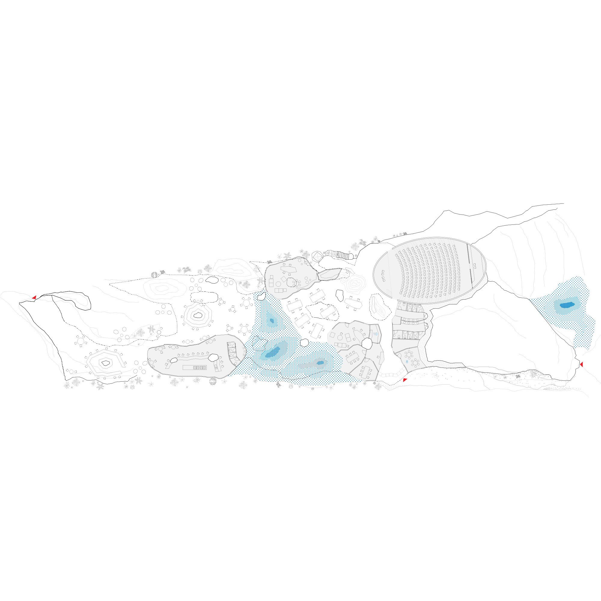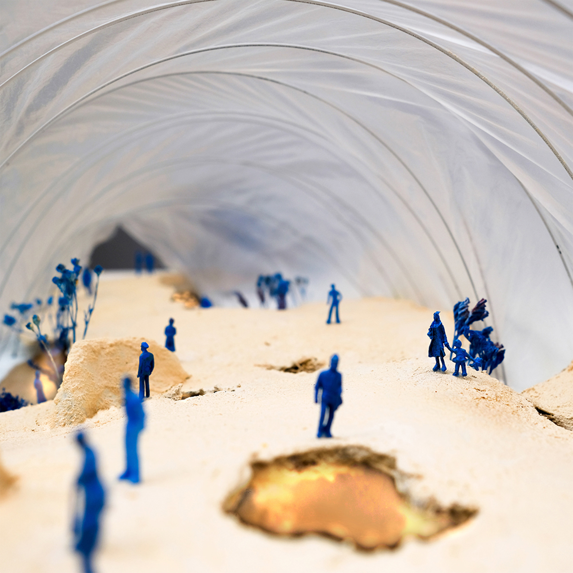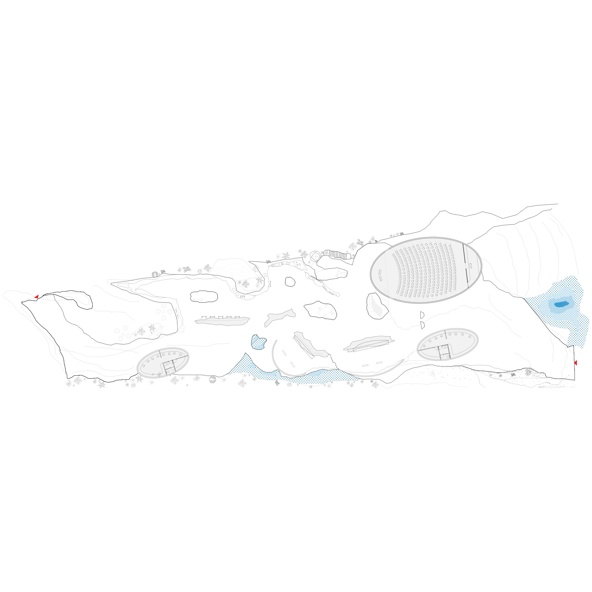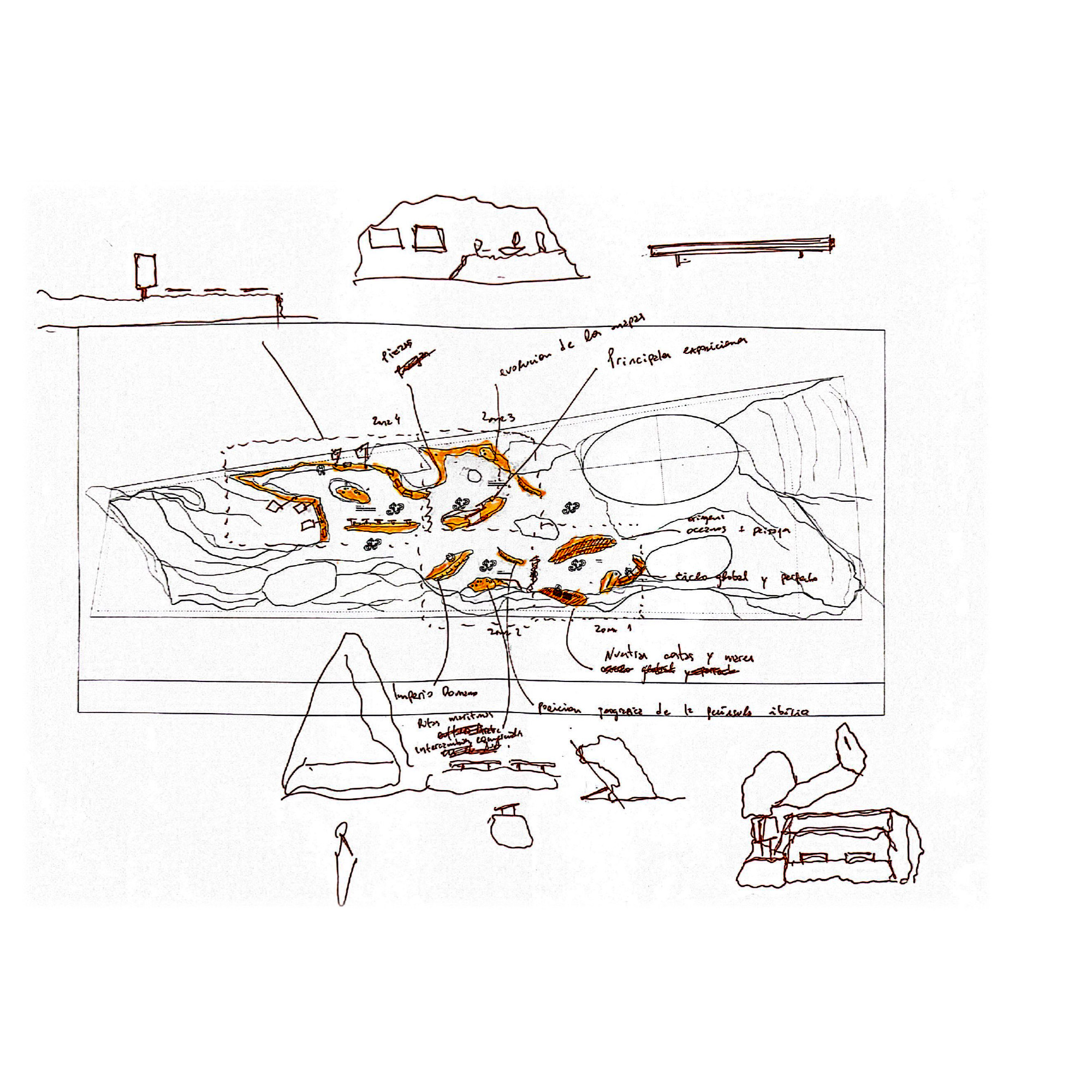 Así pues, más que un pabellón, o un objeto arquitectónico, la propuesta resulta prácticamente paisaje en su totalidad: dunas, lomas, arenales, rocas, peñascos, grutas, acantilados y arrecifes que emergen entre los distintos mares, y que se entremezclan con la exposición “El horizonte azul” que guía todo el recorrido. La geología desplegada, a veces escarpada, abrupta y sombría, pero también blanda, sinuosa y radiante, se presenta como continente y contenido a la vez, a fin de que el visitante se deje llevar por las corrientes de una exposición fluida y resonante, que destaca y evidencia la fecundidad de las relaciones que se establecieron en el medio marino a lo largo de los siglos.
