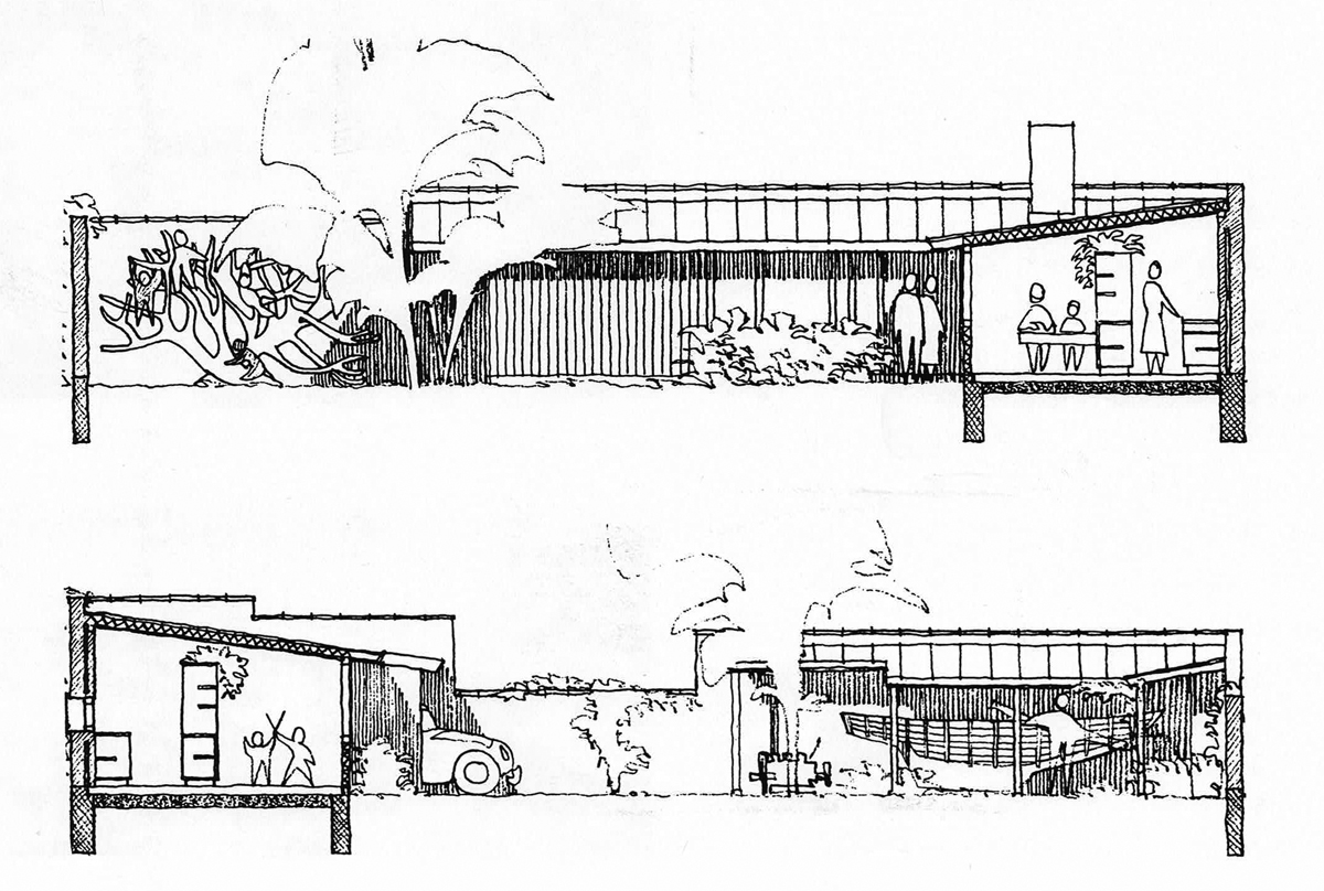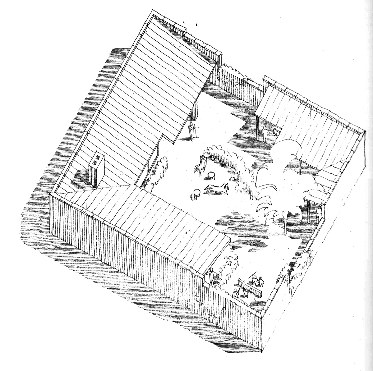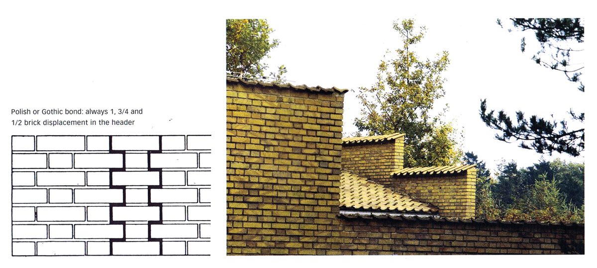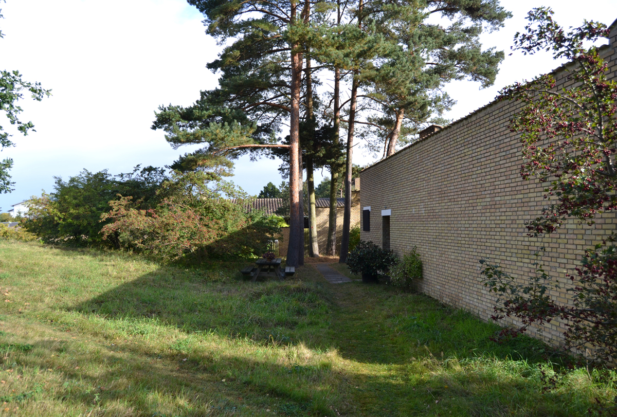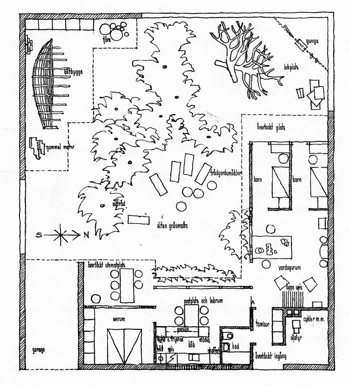 La organización de la vivienda se adecúa al esquema en “L”. La entrada se sitúa en el encuentro de las dos alas: una generalmente dedicada a dormitorios y otra a zonas estanciales. En las distintas variaciones, y cerrando el patio, se proyectan garajes, talleres o estudios, cobertizos, saunas, etcétera. El patio admite una gran diversidad de pavimentos, huerta, jardinería o arbolado, Utzon varía los muros de los patíos segúnla orientación, el soleamiento, la sombra deseada, las vistas y el cerramiento, en respuesta a la situación específica de cada casa sobre el terreno y a su relación con la vecindad. Las dimensiones de las alturas y longitudes de los muros de cerramiento del patio fueron proporcionadas según el sistema del Modulor de Le Corbusier, y dieron como resultado una configuración única para cada vivienda.