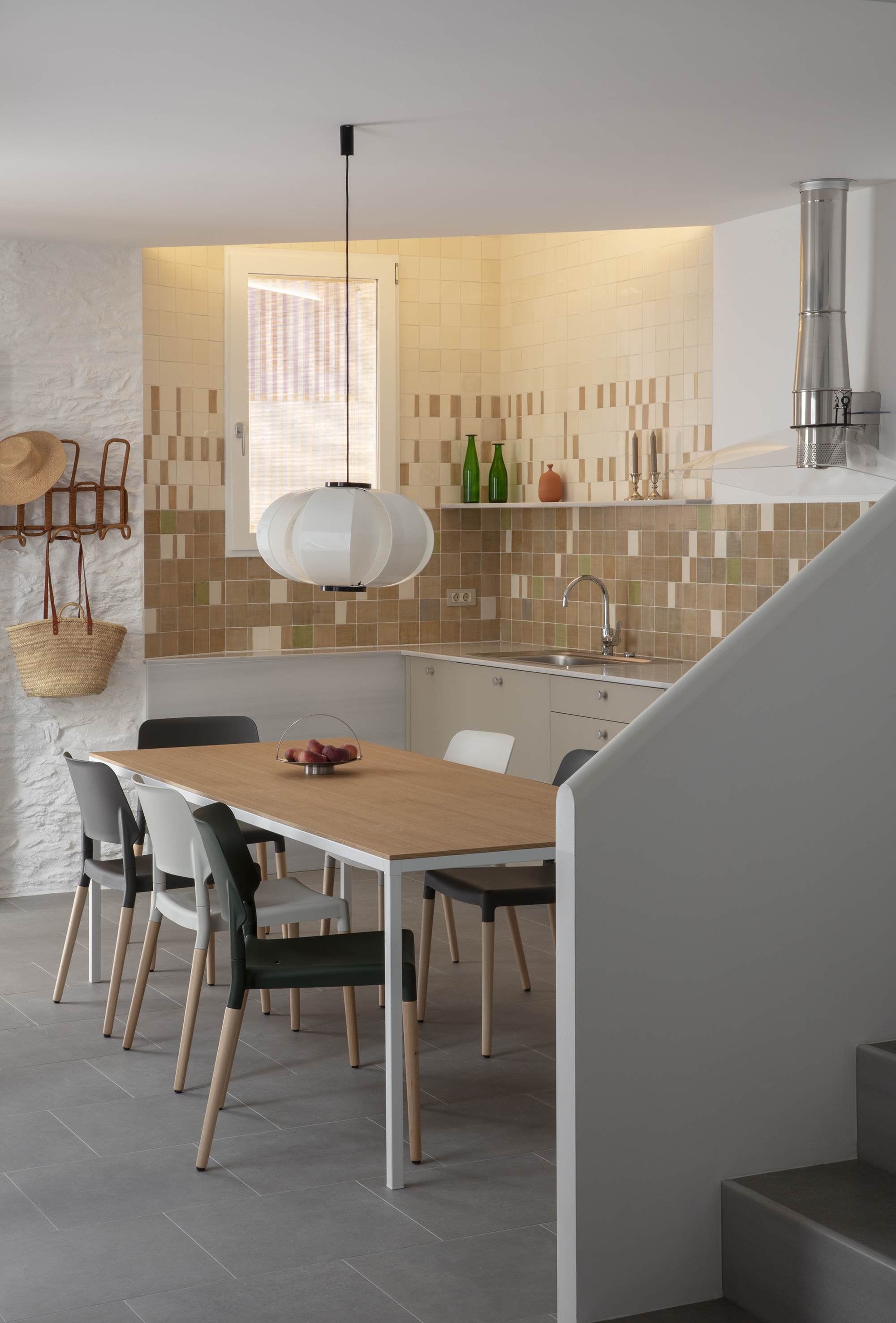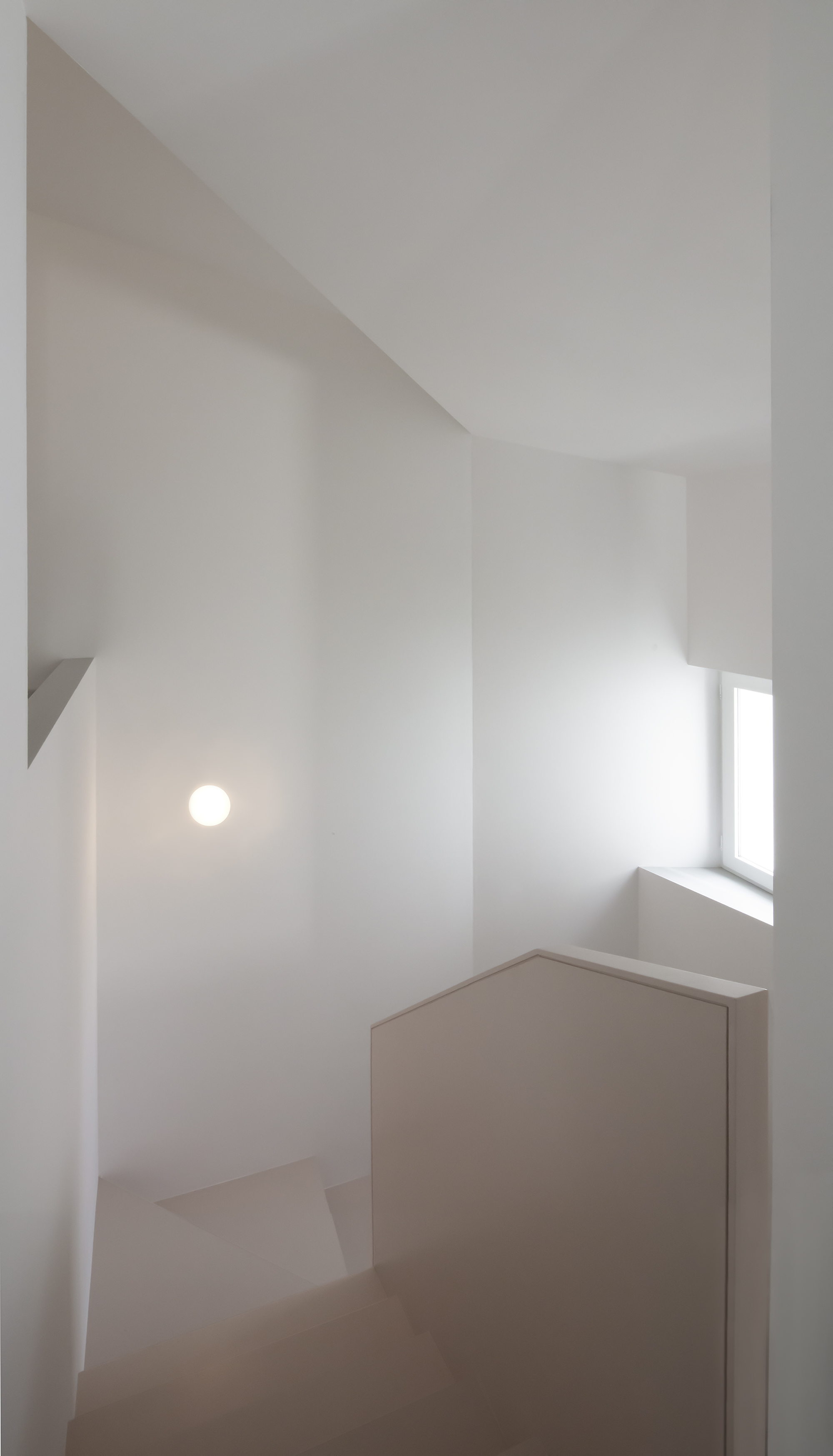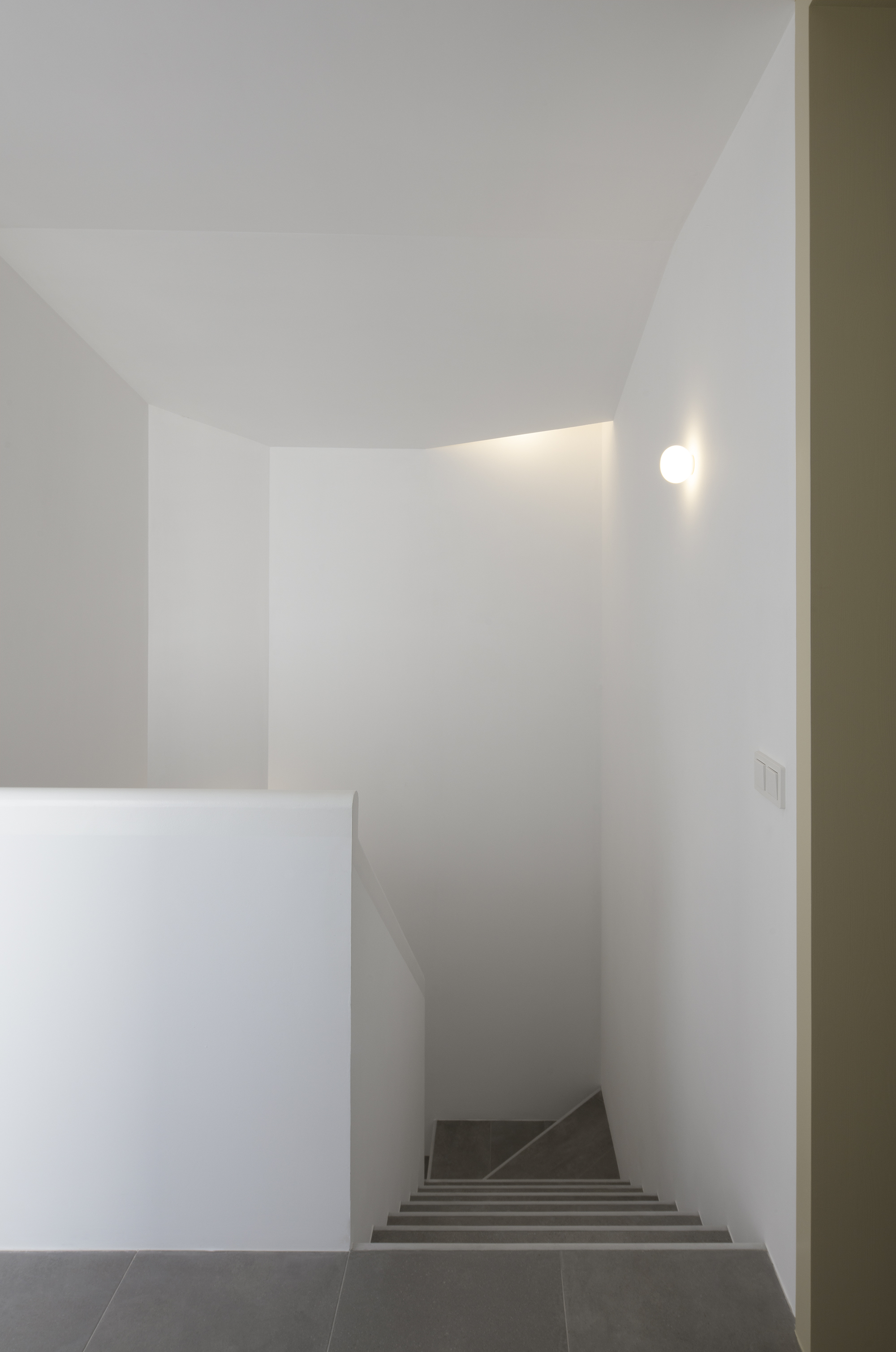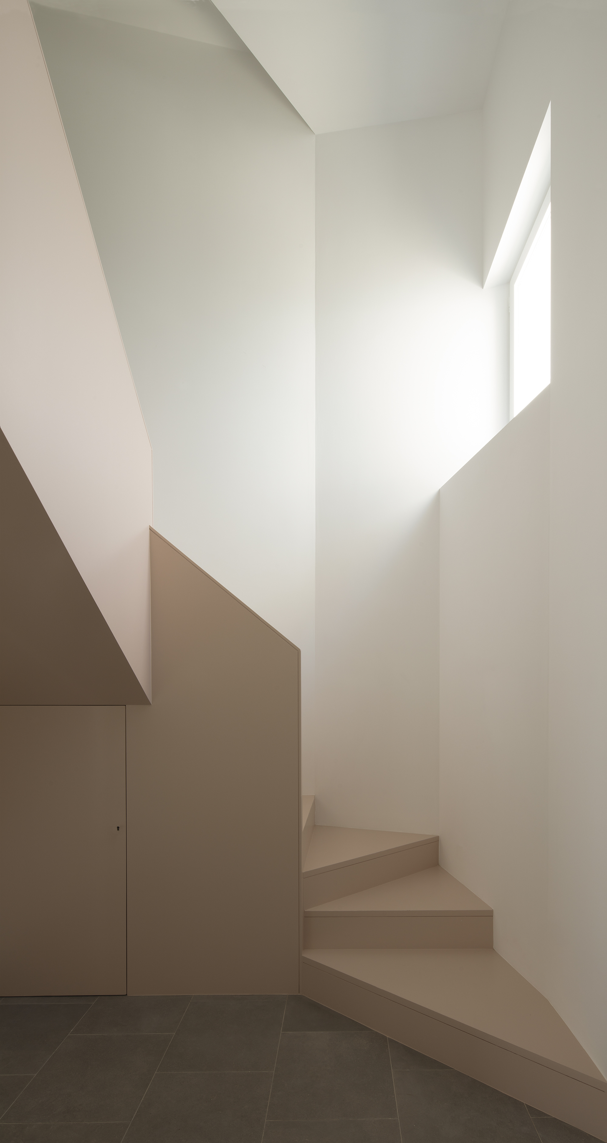 Conceived as a house to be used either as a single unit over three-storeys, or as two separate upper and lower units, a second entrance is located at the highest of the three streets, in a newly built stone-clad brick wall. Two separate staircases along the party wall, generously scaled in height, have been designed according to their role in the house’s dual nature with an oversized door at the first-floor landing left open or closed accordingly. A double-height hall containing a painted timber staircase, lit by a high corner window, leads to a second floor. Here, a living-dining room with a sea view over neighbouring rooftops is flanked by a small kitchen.