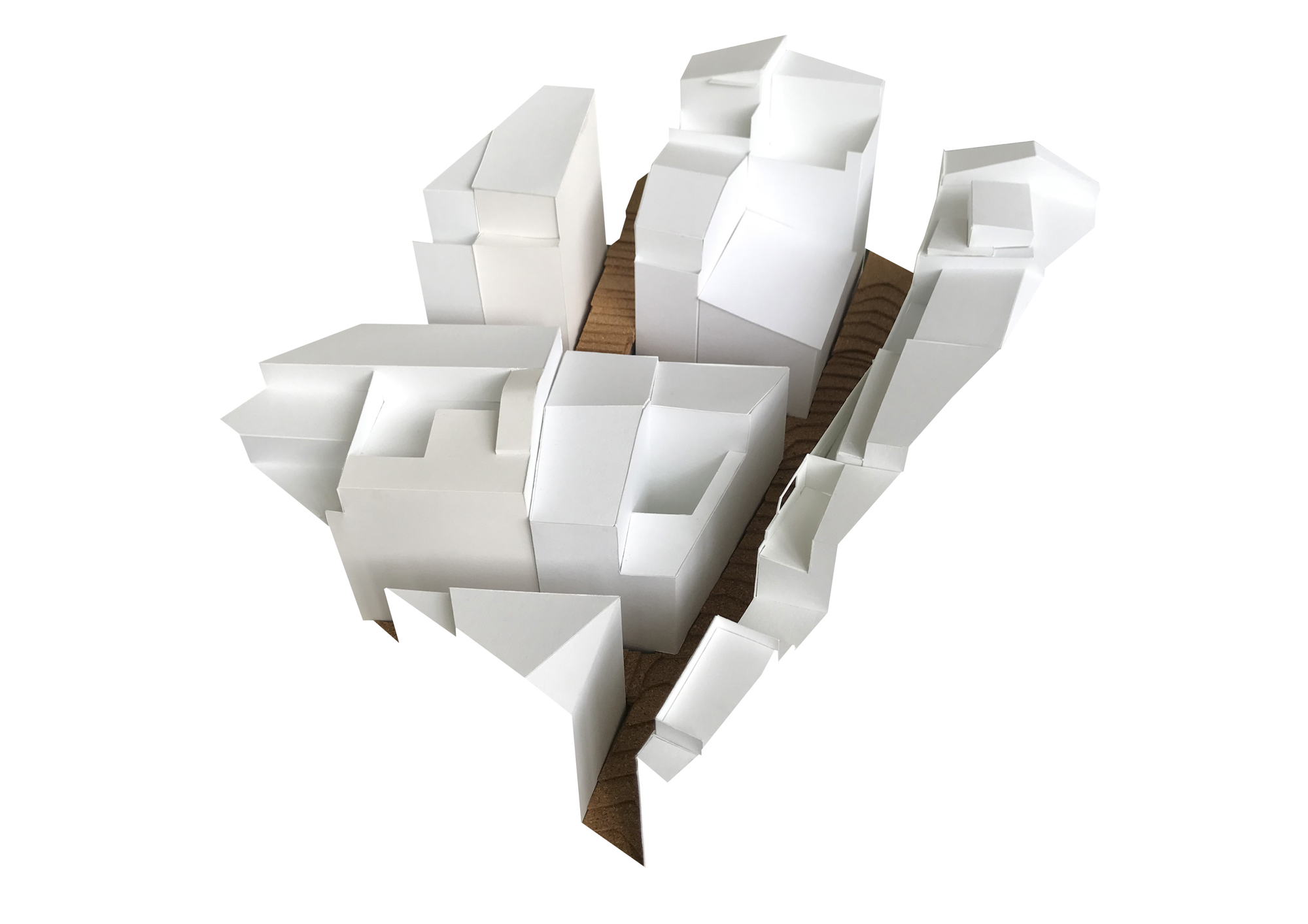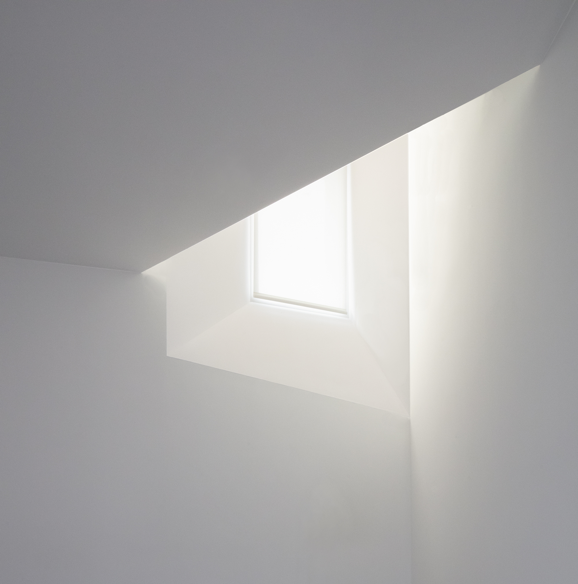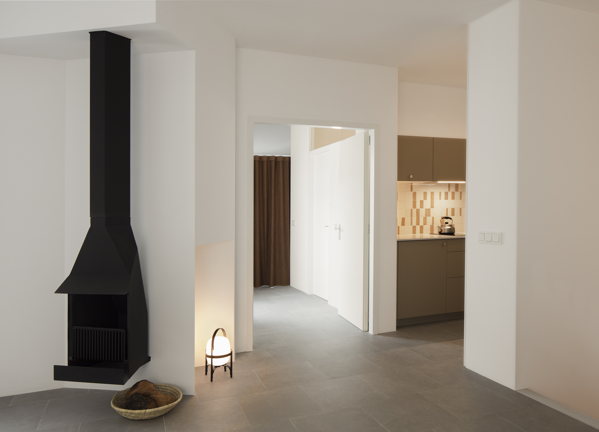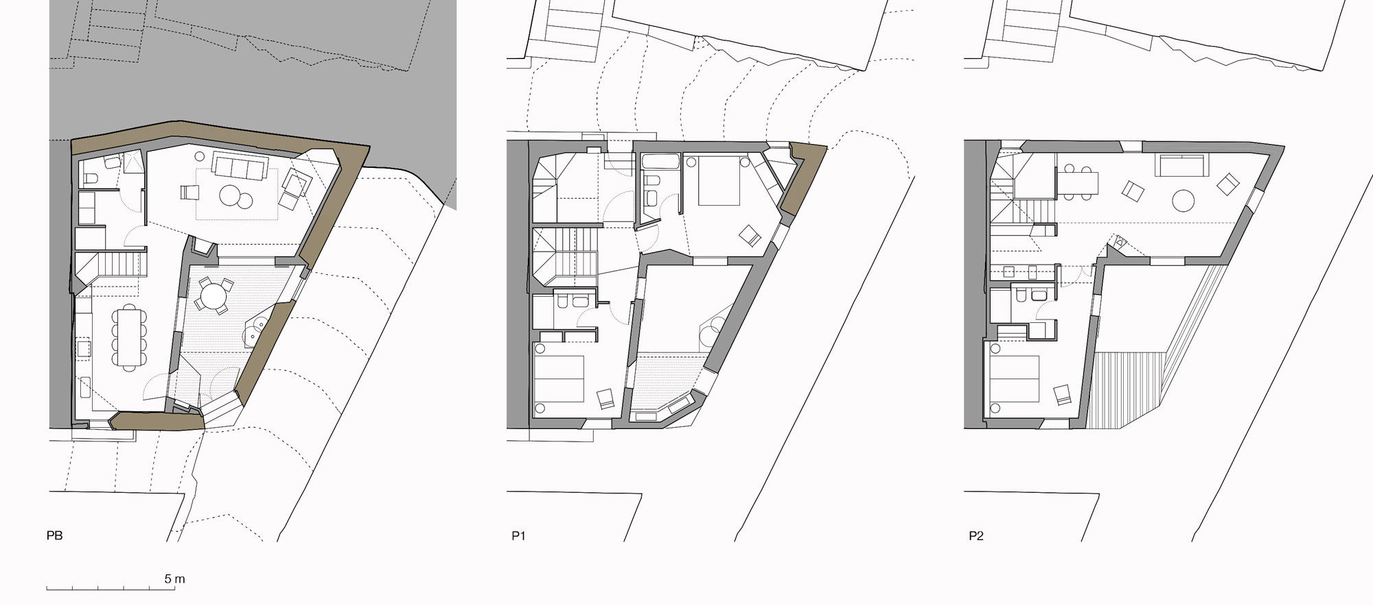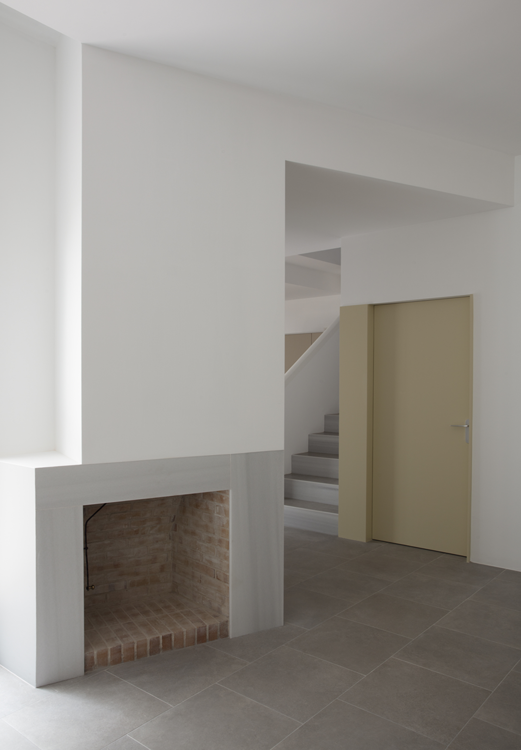 The irregular plan geometry – the location of stairs, fireplaces, fenestration or ceiling contours and cut-outs – all play a role in articulating a series of spaces contained within a volume inscribed in a polygonal site with three street facades and three patio facades. A six-sided room, a chamfered lightwell, or an almost triangular patio, unapologetically bear the traces of the house that once was, a presence still palpable in the stony urban setting in which the new building sits.