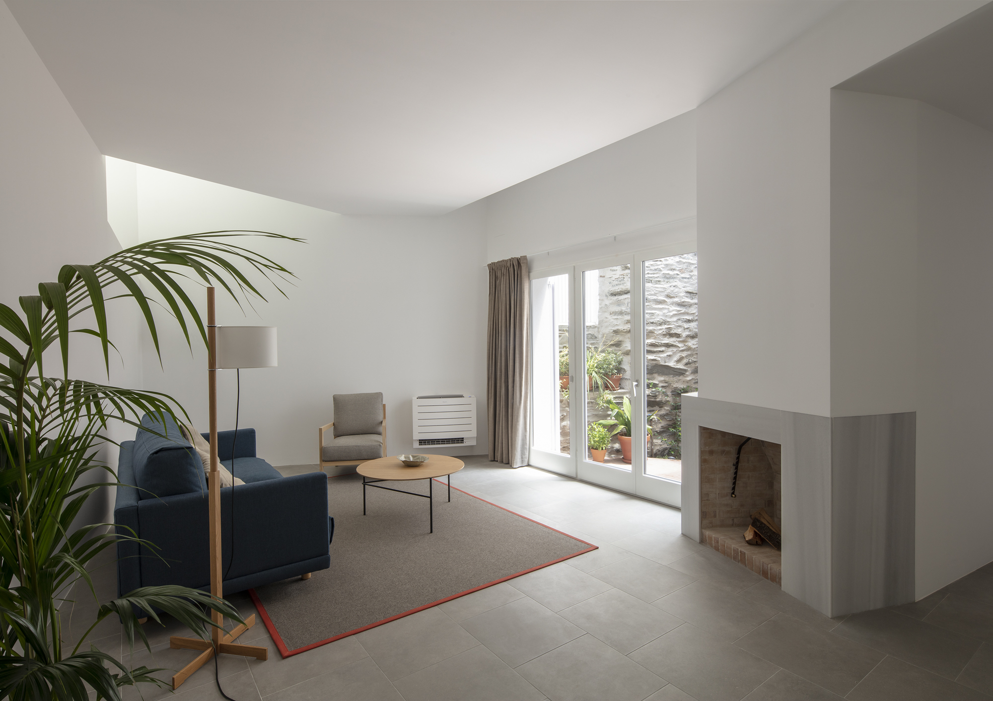 An L-shaped plan is inscribed within the existing perimeter walls, enclosing a patio through which one enters the house. The restored walls, left unpainted in the patio, serve as a backdrop to this semi-covered space. Seen as an outdoor room, it is surrounded by a kitchen with a staircase as backdrop, and a living room, anchored by a fireplace, that receives additional natural light from a clerestory window in an otherwise dark corner.
