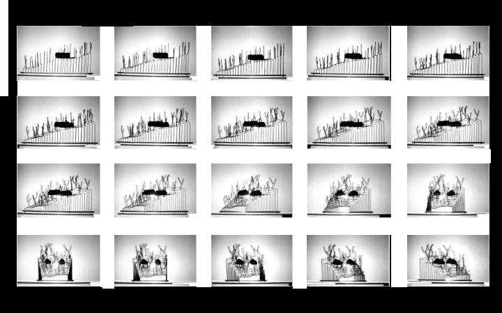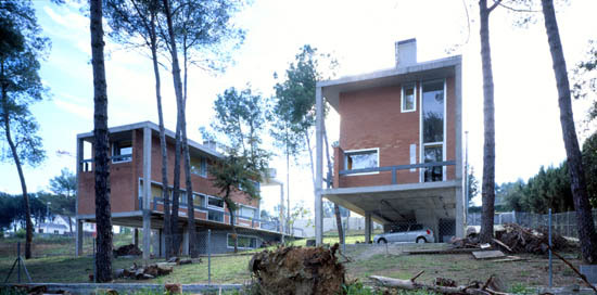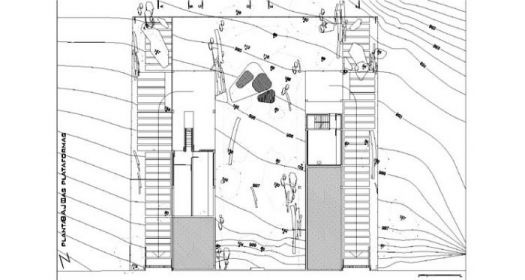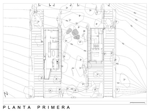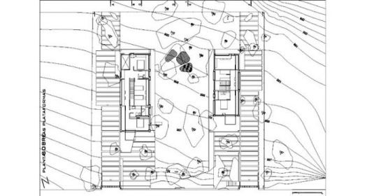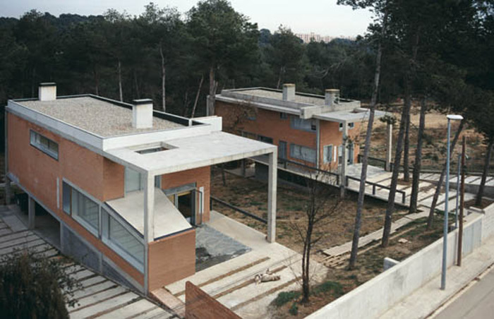 Las casas están situadas sobre dos plataformas que son como ‘mesas’ con techo. Las plataformas proporcionan una cota cero que soluciona la fuerte pendiente del solar. Bajo las ‘mesas’ están los aparcamientos, los talleres, los depósitos del agua de lluvia y un par de salas parcialmente hundidas en el terreno. Y sobre las plataformas están las casas.
