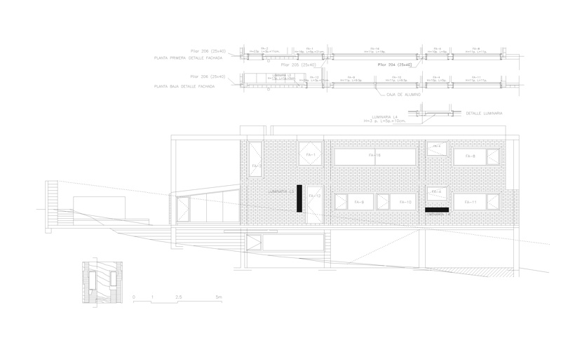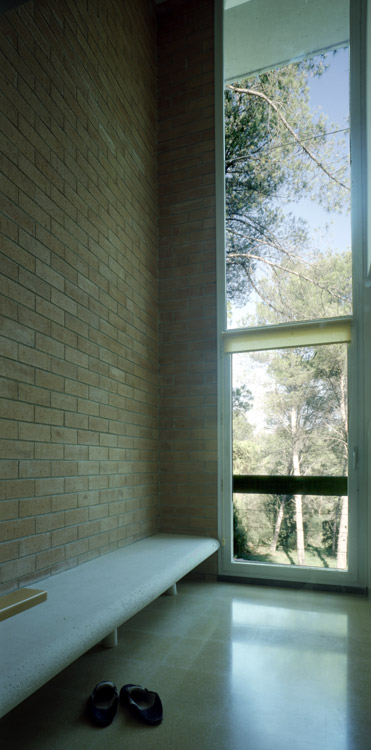 Los materiales son extremadamente económicos: cerramientos de ladrillo rojo de gran formato y de bloque de hormigón, carpinterías de aluminio con marcos de doce centímetros de ancho o bancos corridos de hormigón in situ