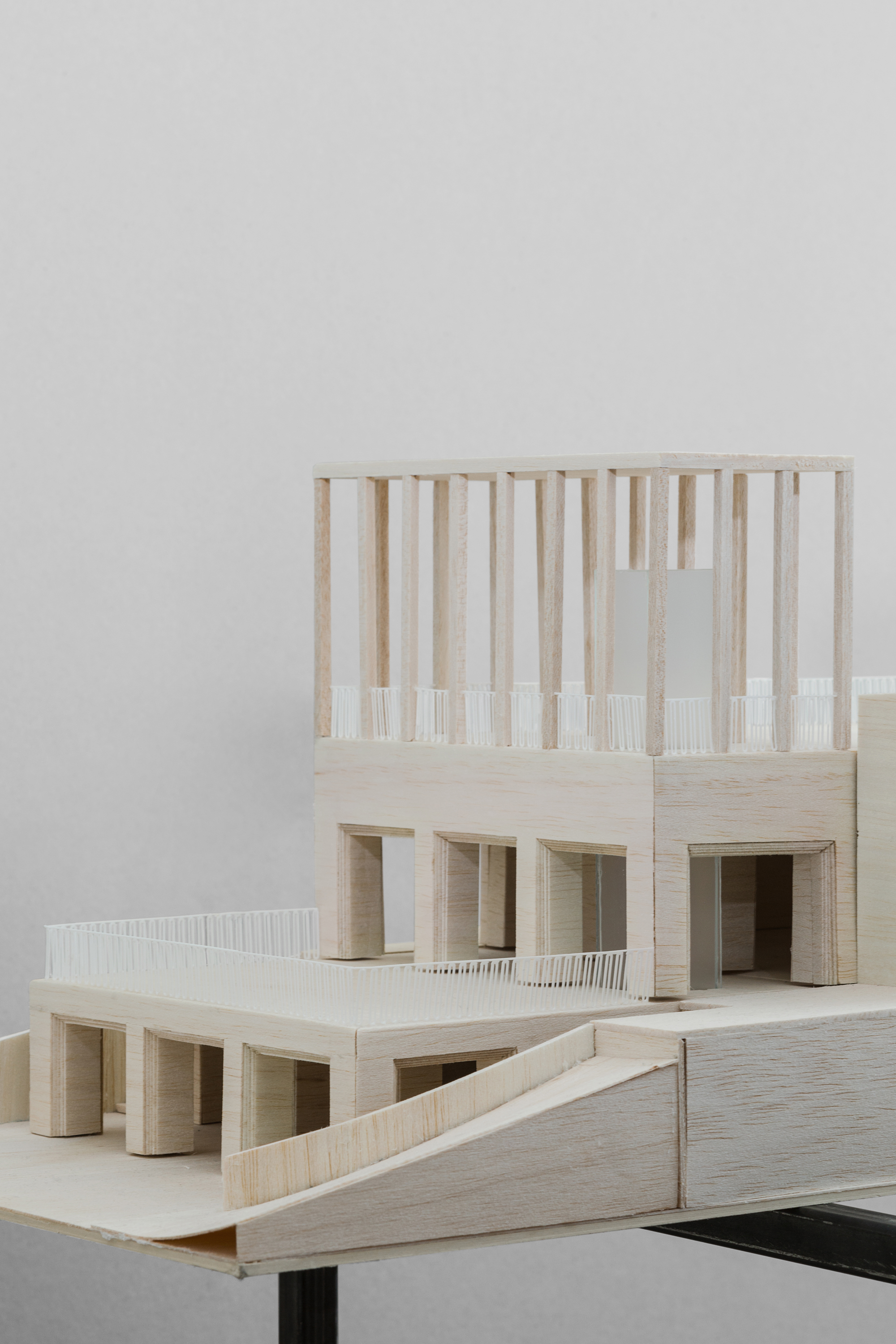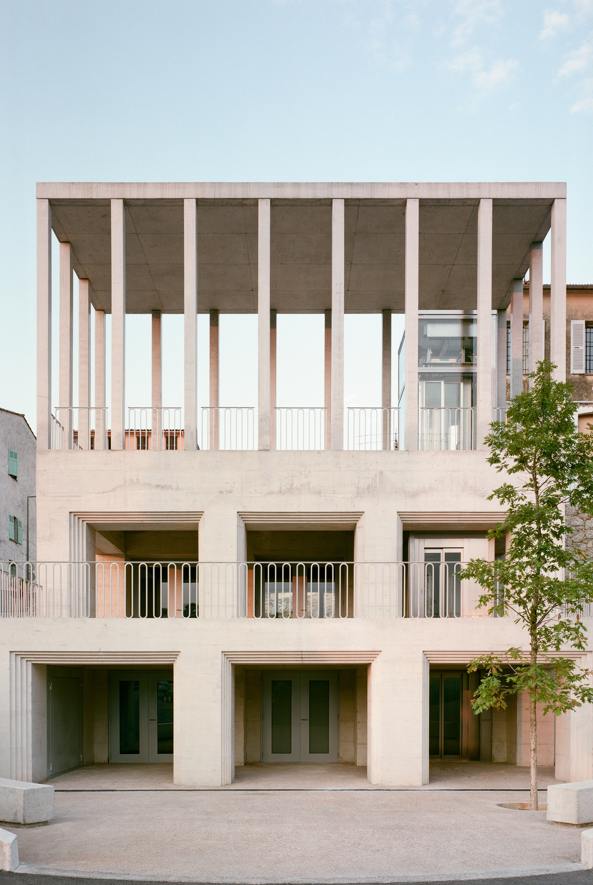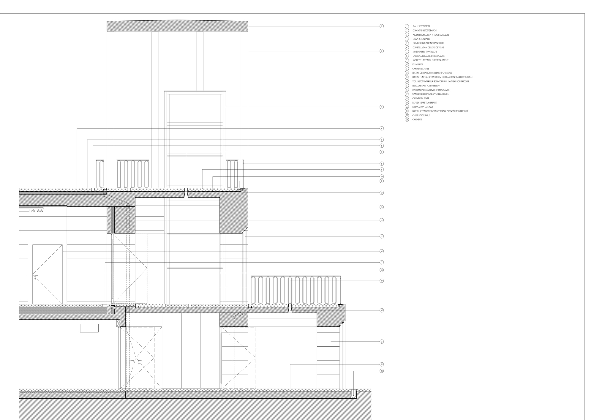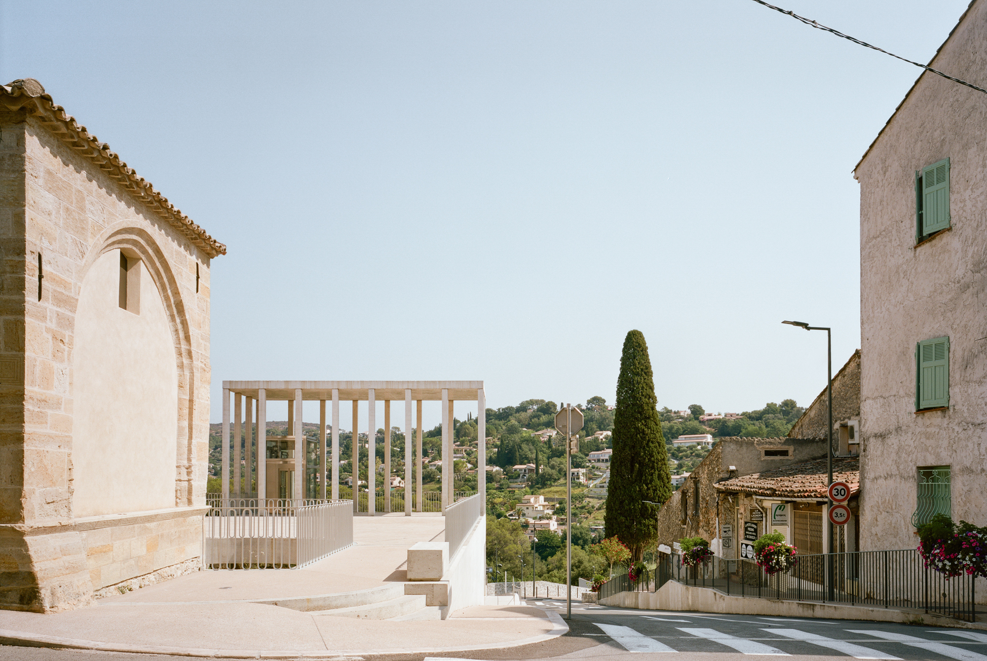 This belvedere bears an elevator on its extremity, visible as a bell tower. It is the sole emergence on the square, together with the chapel, which connects the square and the Bachettes car park levels. The elevator is sheltered by a pavilion, responding with lightness to the chapel massiveness. The triptych Chapel-Town Hall-Pavilion finds a necessary unity with the creation of that new square. It shares the same public ground and the town hall is staged in the public space just like the chapel. They can therefore fully play their structuring role.