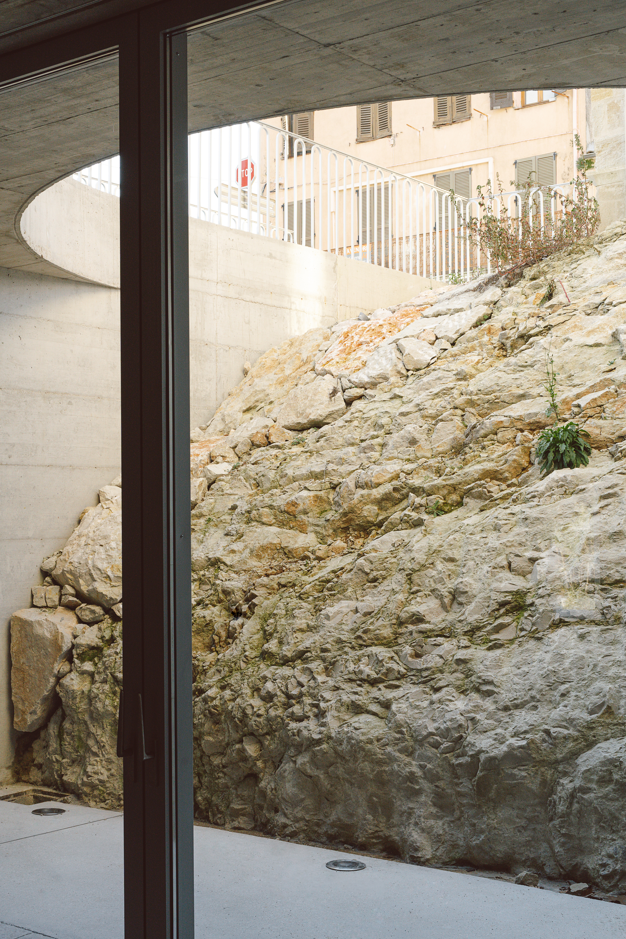The project answers to a question unasked by the programme: how to build a public space that offers a back square to the Saint Roch chapel.