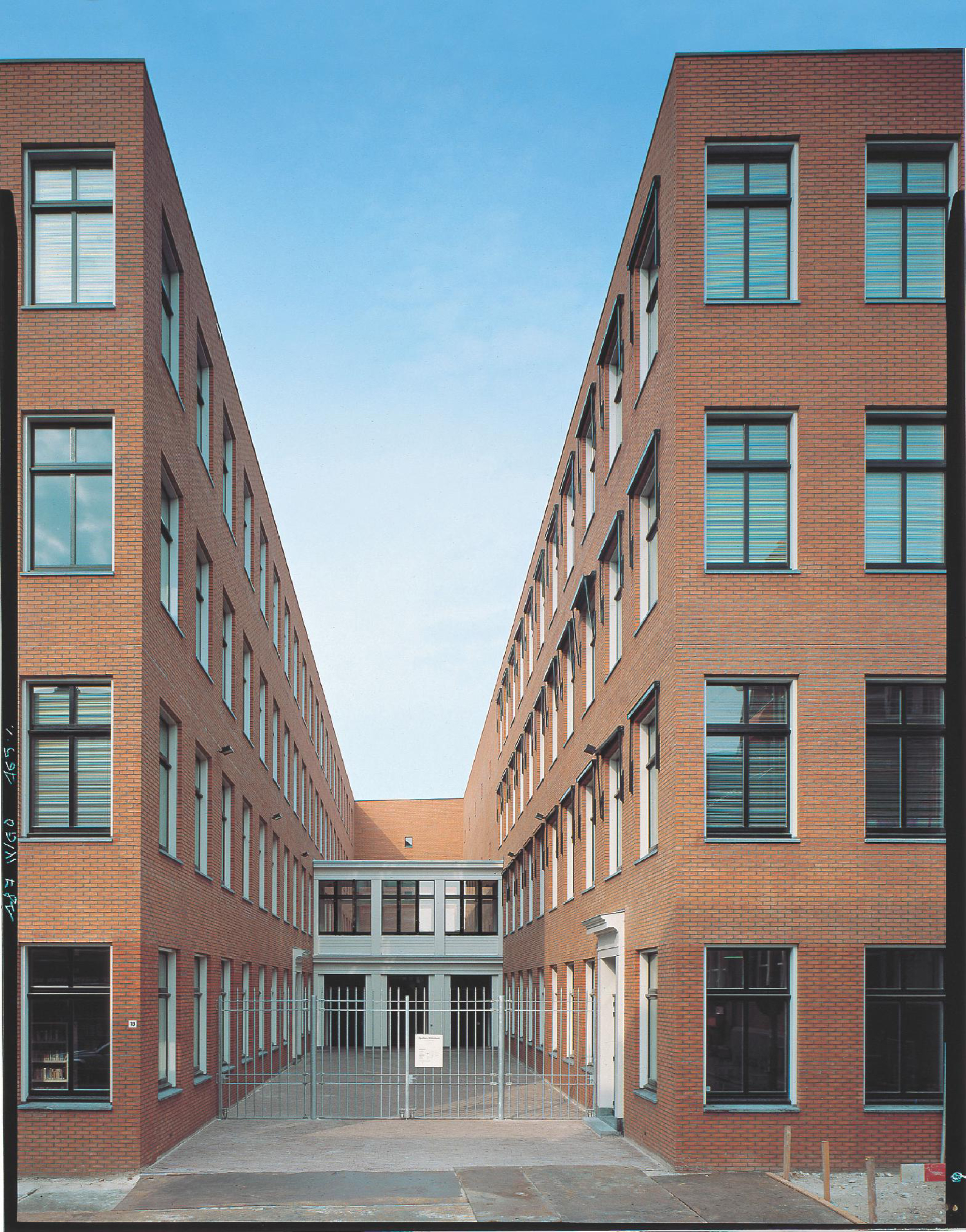 In tal modo l’ampio spazio libero compreso fra i Monumenten nn. 10, 12, 14 e il n. 24 viene interamente occupato dal volume articolato della biblioteca, anche se in realtà ne raggiungono il filo della strada soltanto i due corpi longitudinali ‘a tre finestre’. E dalla strada, attraverso i tre intervalli, è possibile cogliere tutti quanti gli elementi costituitivi del nuovo complesso edilizio (il corpo della biblioteca vera e propria attraverso l’ingresso di servizio, tutti e tre i corpi edilizi attraverso l’ingresso principale e, attraverso la stretta apertura del Bauwich, il giardino e sul fondo il corpo dei collegamenti.