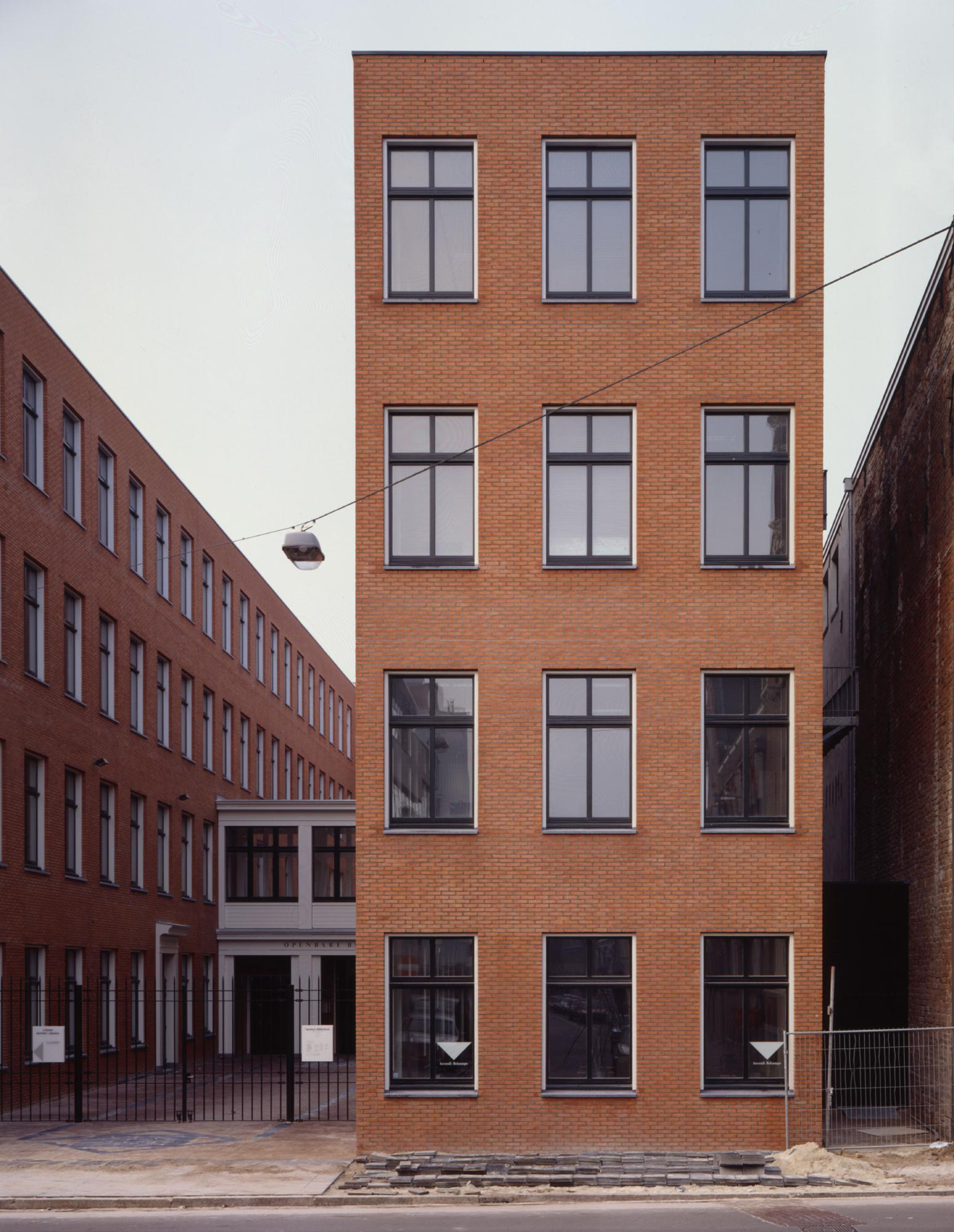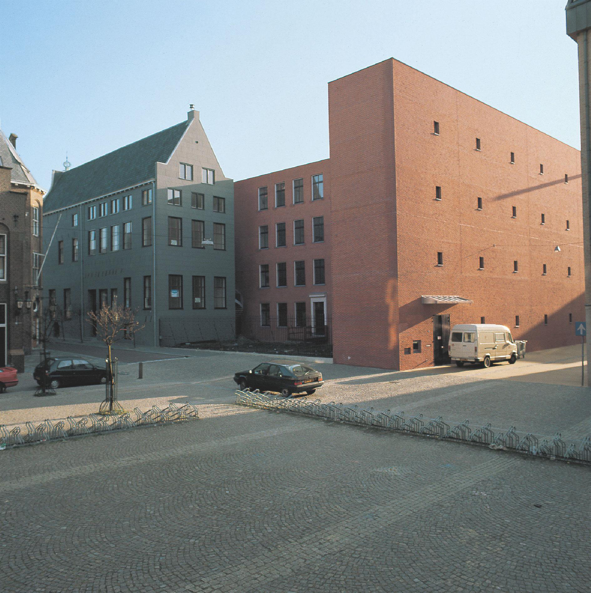 Il fronte sulla Poststraat-Zuid fa vedere lo sviluppo laterale del corpo principale della biblioteca (ma qui ribassato di un piano per riprendere la linea di gronda della via più piccola); alcuni accorgimenti consentono di leggerne la forma a ‘L’ nel punto di contatto con i tre Monumenten e dall’altra parte la saldatura con il corpo trasversale dei collegamenti.