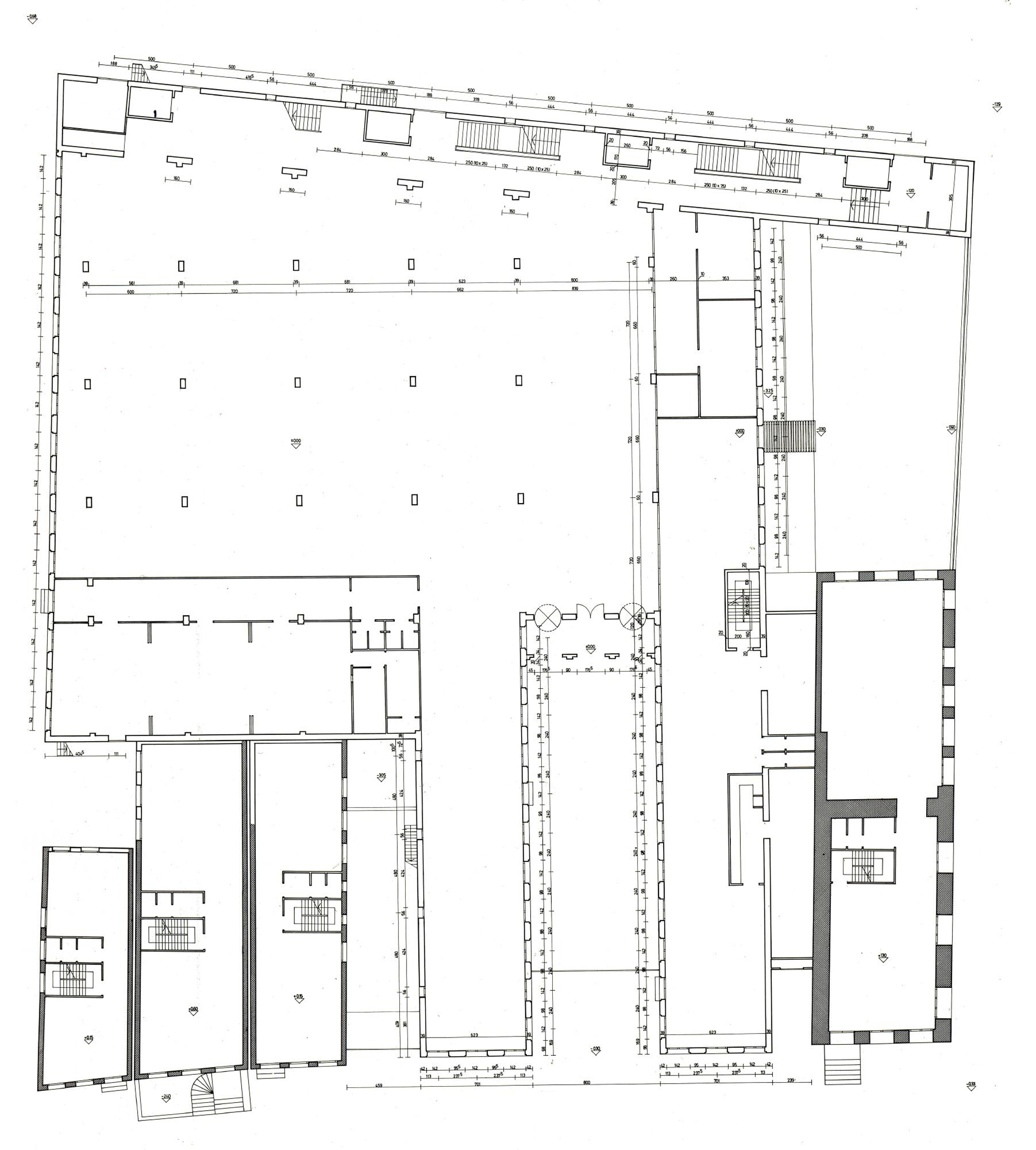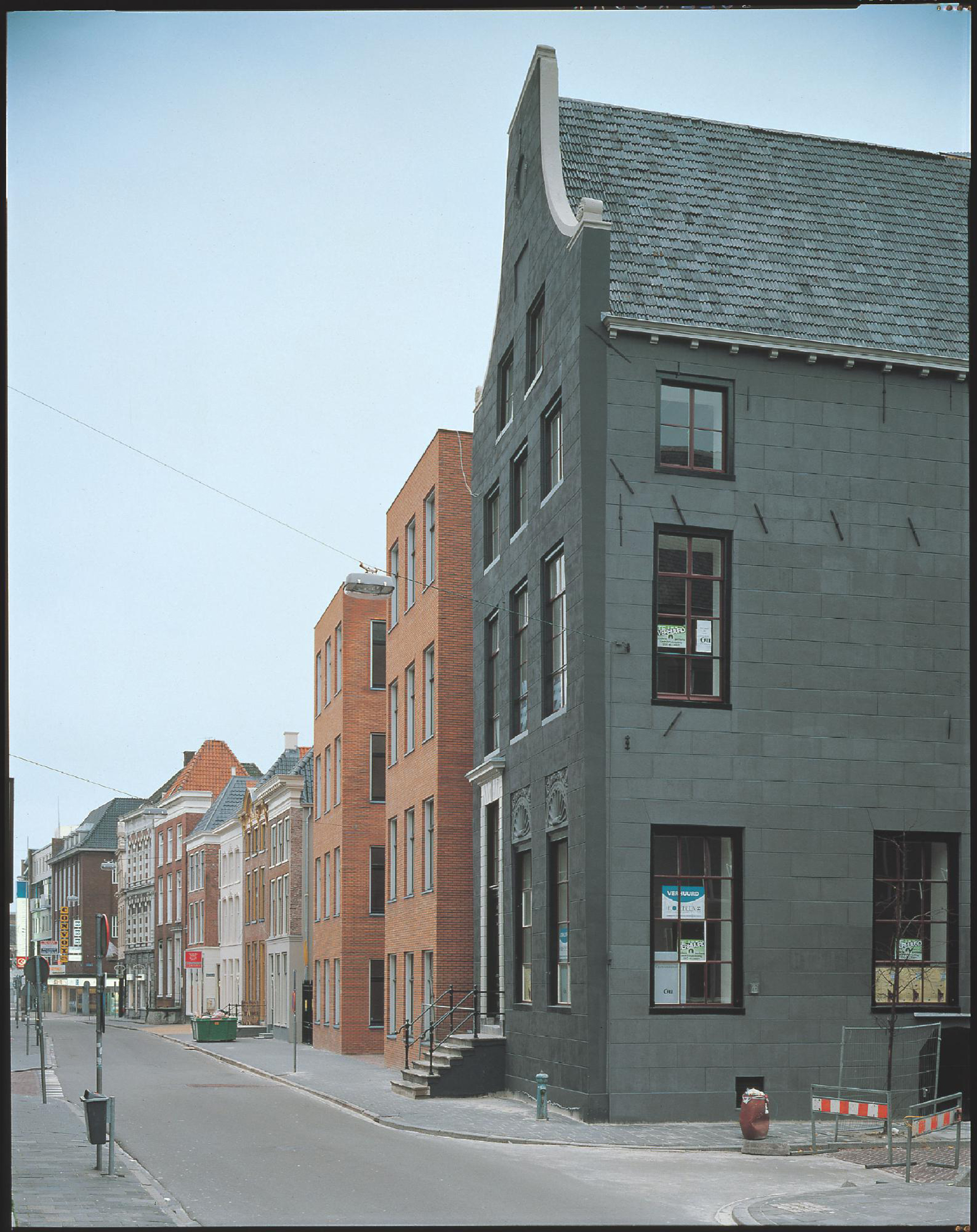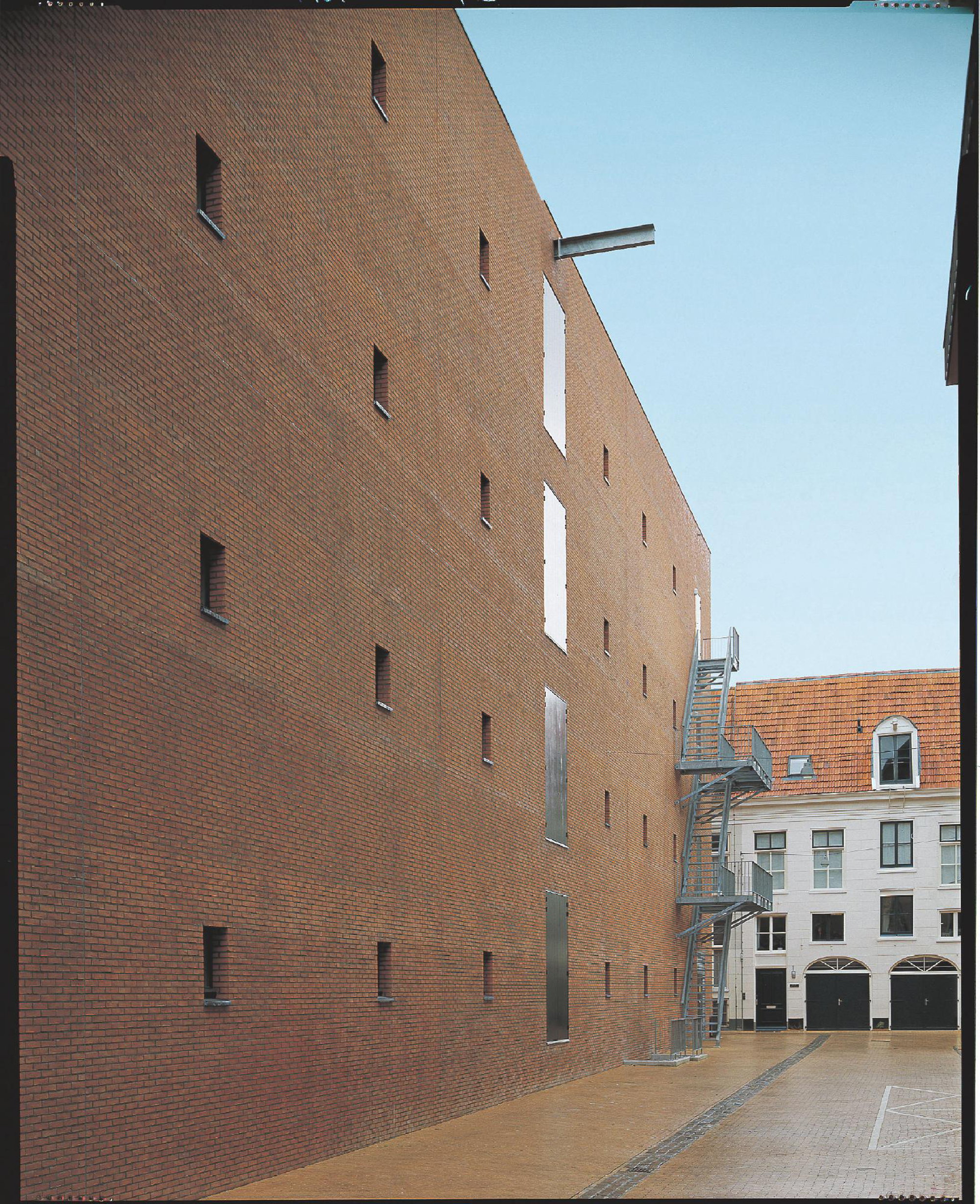 Il fronte sulla Poststraat-West, occupato per tutta la sua lunghezza dal corpo dei collegamenti, è invece dichiaratamente un fronte posteriore. E’ un fronte chiuso, che ripete in forme canoniche gli elementi compositivi degli edifici mercantili della vecchia città (le piccole finestre, le porte di carico, gli argani, ecc. delle vecchie Pakhuizen della città).