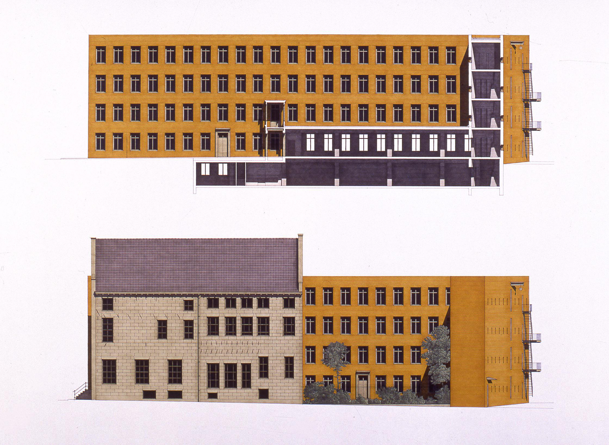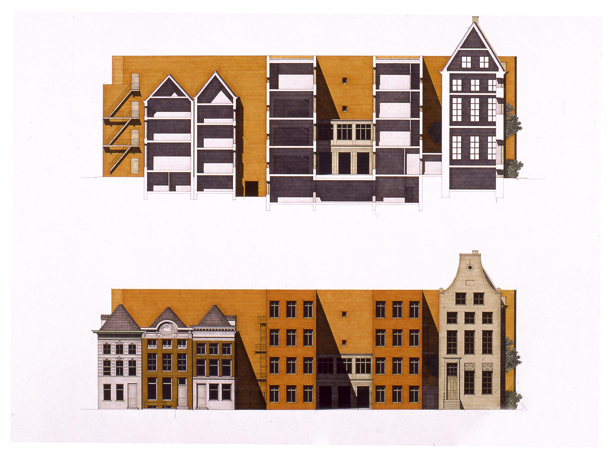 In realtà l’obiettivo del lavoro di progetto è stato sempre anche quello di lasciar apparire comunque la tensione, la disparità sul piano proprio espressivo, fra questi due elementi della composizione. Cioè il problema avrebbe dovuto rimanere comunque aperto, anche dopo aver ricevuto la sua risposta. E in tal senso il progetto avrebbe dovuto mostrare insieme alla sua risposta anche la sua evidente difficoltà: cioè la forzatura, che è il suo dato di partenza, insieme alla forma particolare che questa forzatura assume nel tentativo di mettere in pratica la lezione d’architettura che qui ci offre la città antica (per fare un esempio diverso: nella vicina Universiteitsbibliotheek il problema, lo stesso problema, non c’è, non si pone, in quanto la costruzione non lo fa vedere).