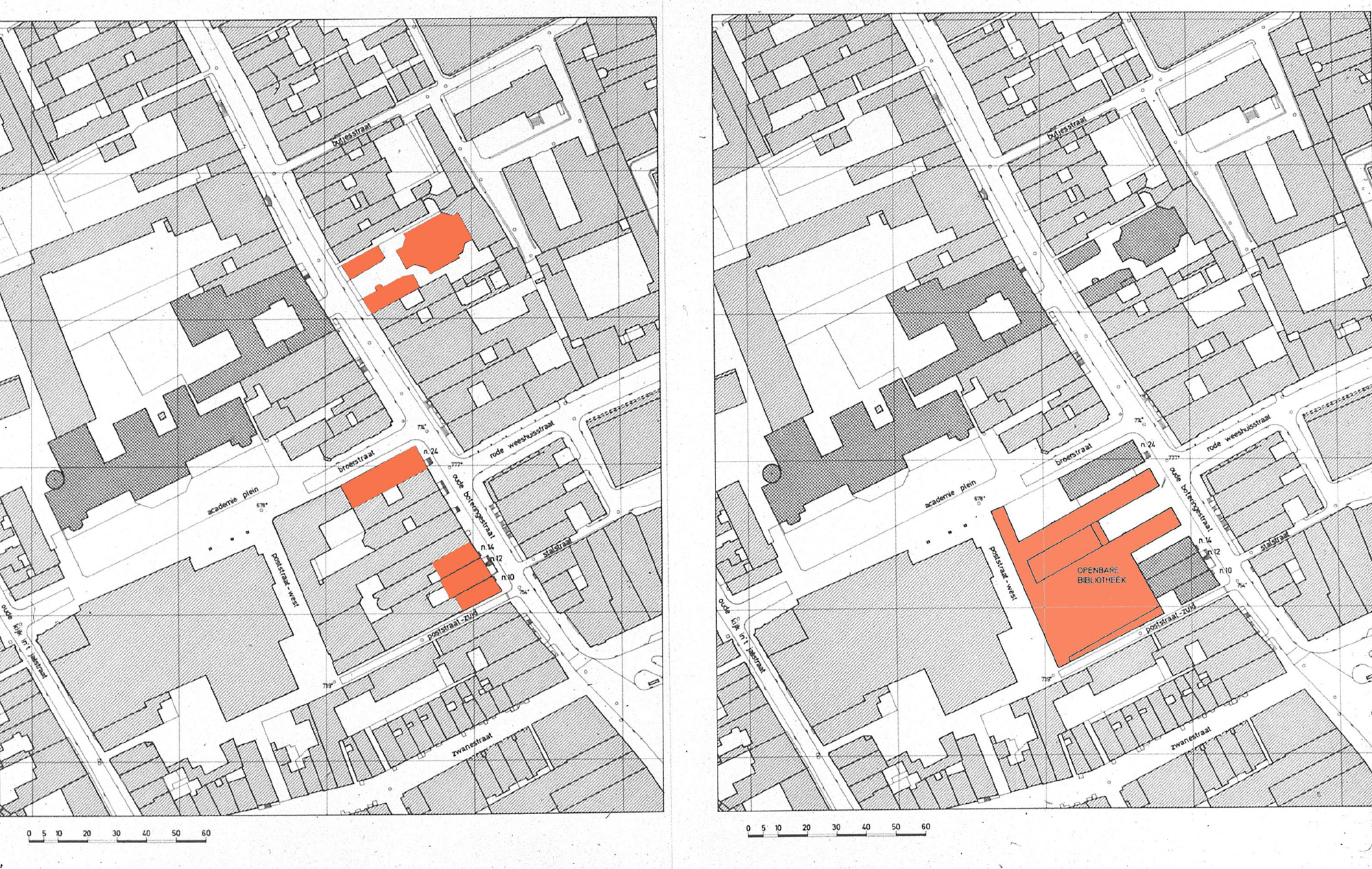 Una situazione architettonica differente. Un’antica strada di penetrazione della città caratterizzata dalla successione ordinata delle facciate di antiche case borghesi (Oude-Boteringestraat). Una piccola via di lottizzazione delimitata dai fronti laterali di vecchie case più modeste (Poststraat-Zuid). La stessa via piegata di 90° delimitata esclusivamente dal fronte laterale della nuova Universiteitsbibliotheek (Poststraat-West). E infine una breve strada (Broerstraat) che subito si allarga a definire uno spazio di particolare valore architettonico, uno spazio delimitato da edifici monumentali che a partire dalla Oude-Boteringestraat progressivamente si apre fino a diventare piazza vera e propria di fronte all’Academiegebow (Academieplein).