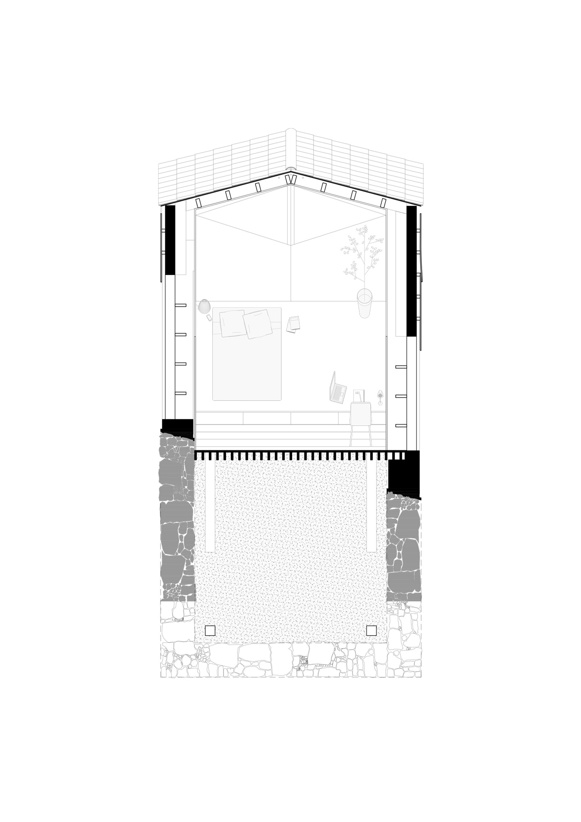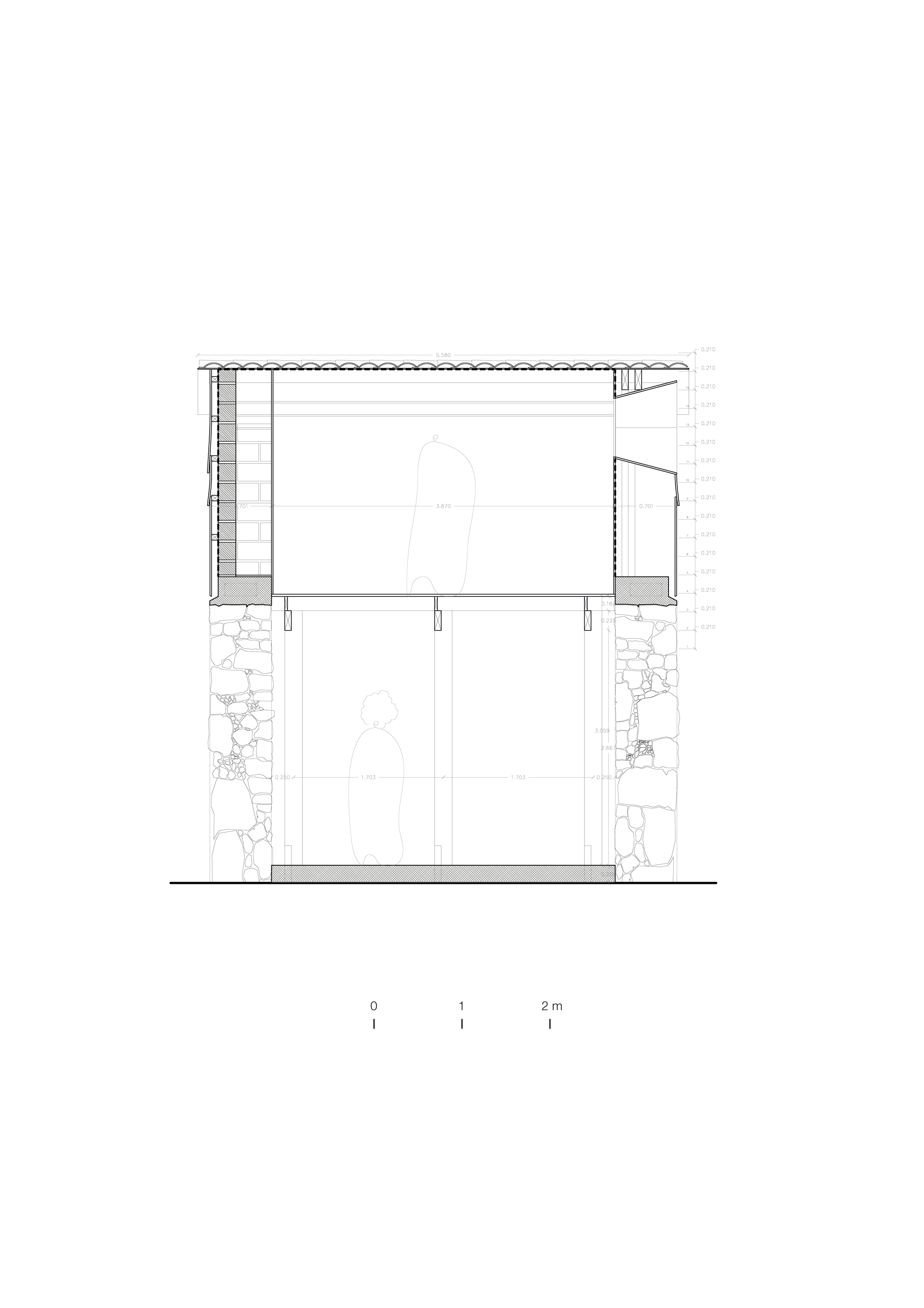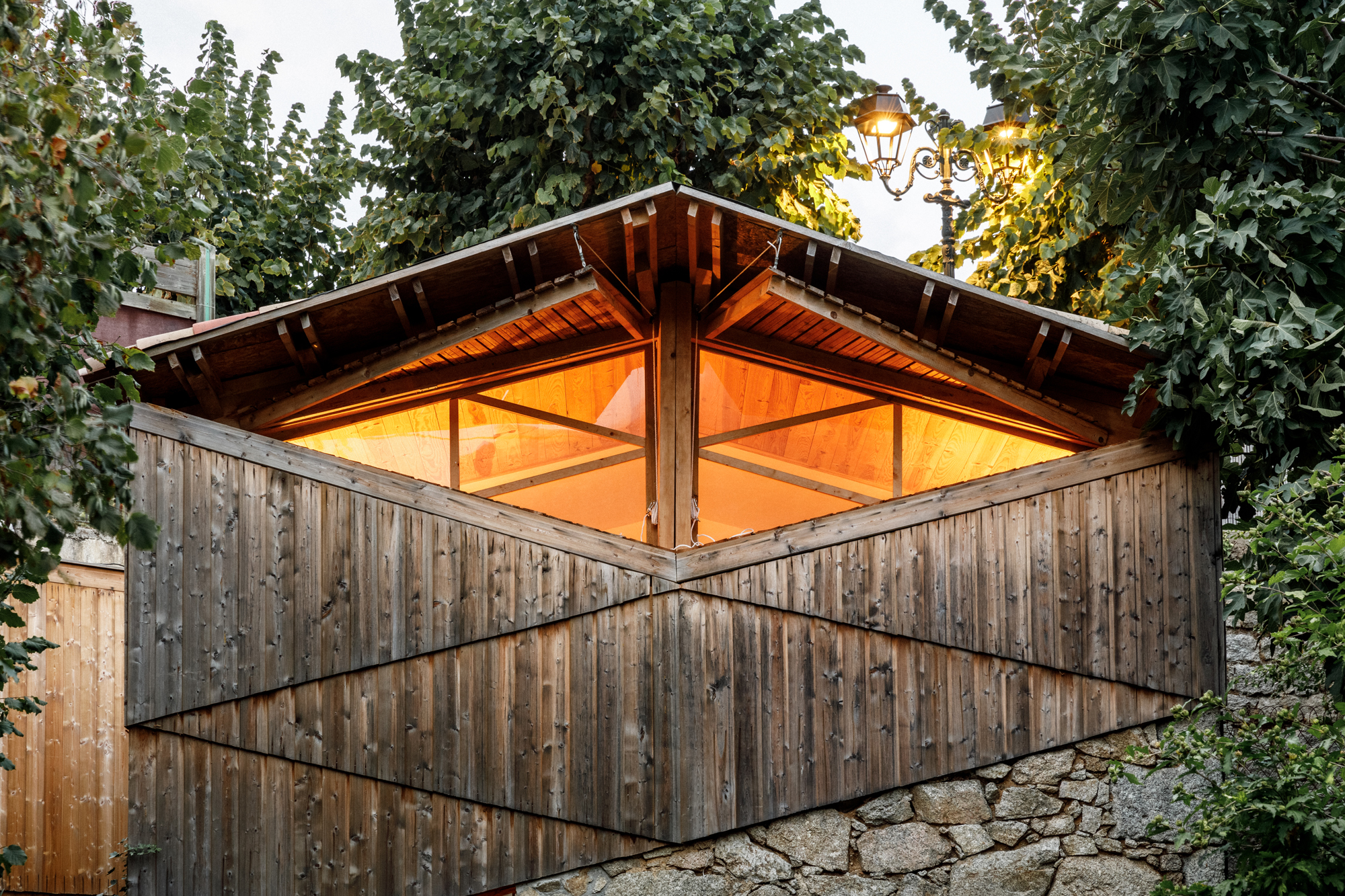 This upper extension is the most enclosed of the site, contiguous to the retaining wall. For this reason, particular attention is paid to the presence of light and views to the mountains. The walls are covered with wooden cladding, and wooden tiles are used for roof covering, referring to vernacular architecture such as regional dryer barns.