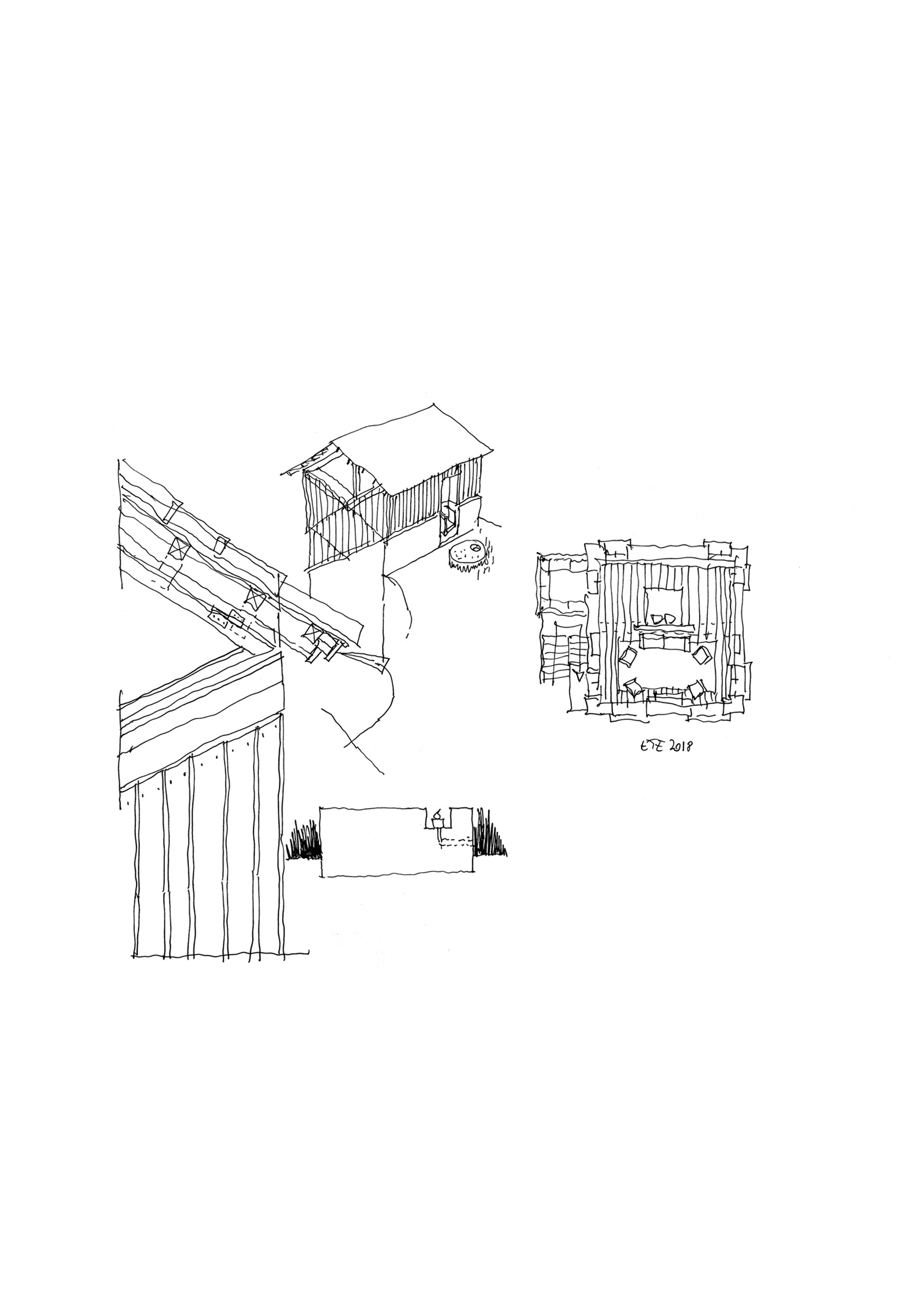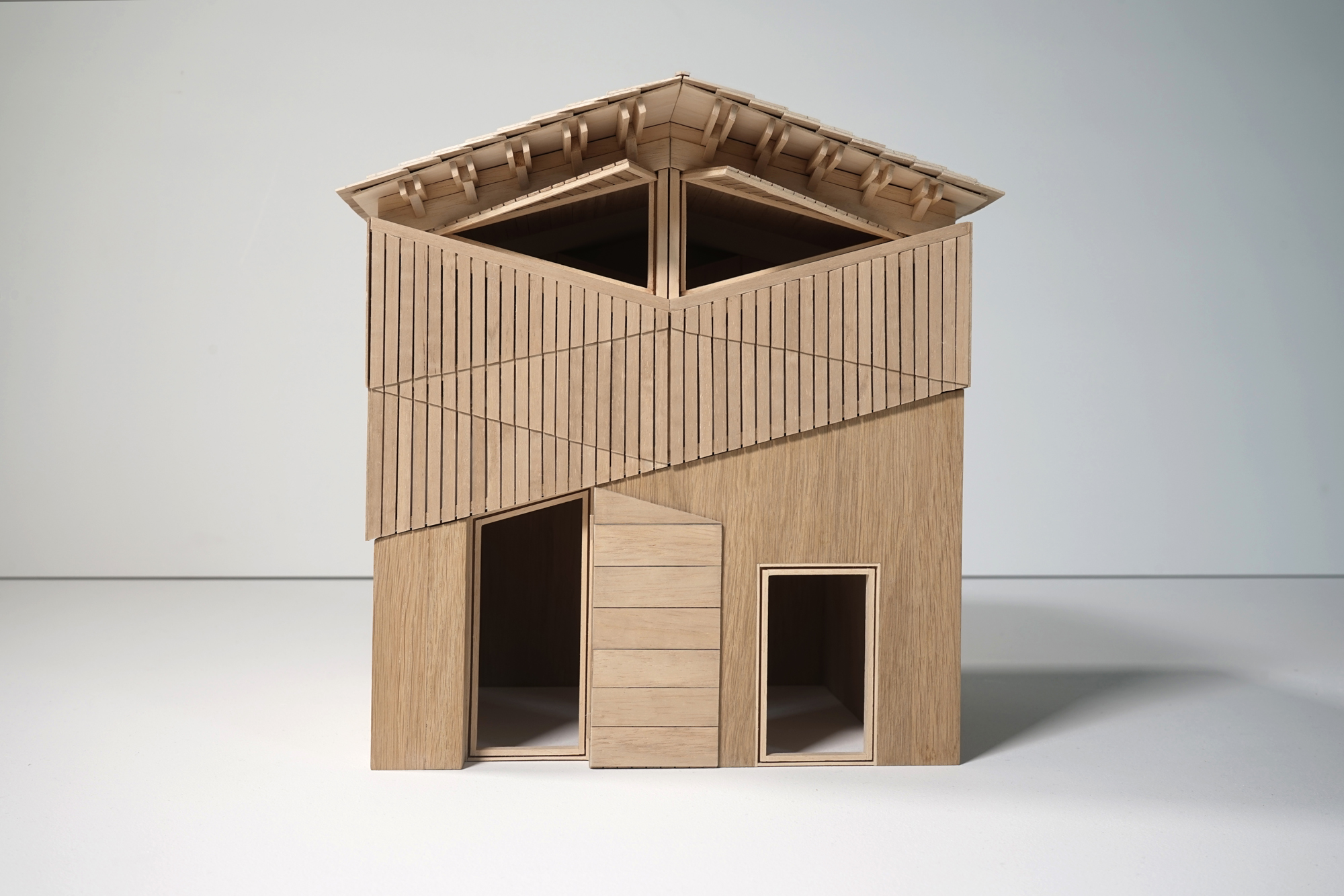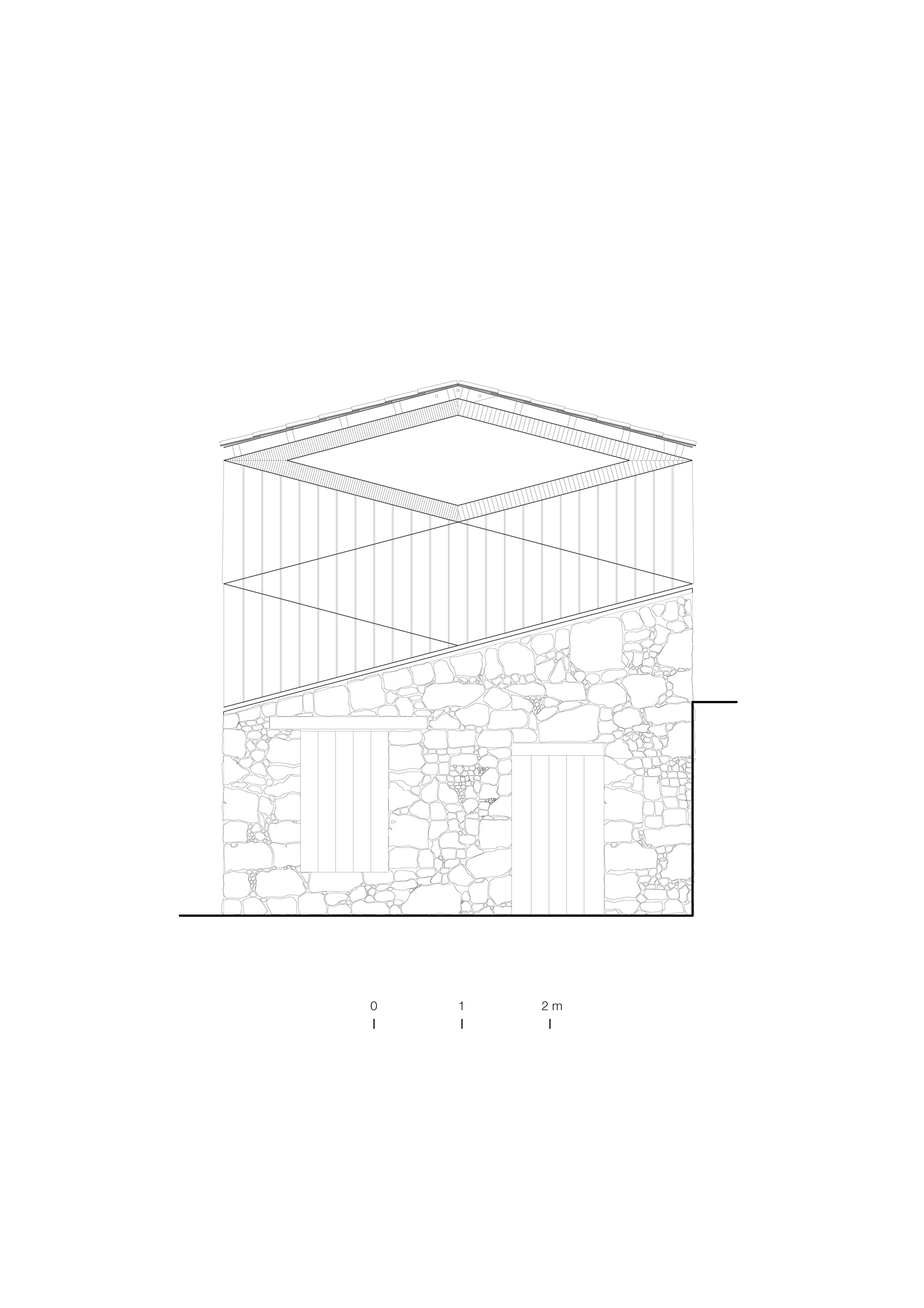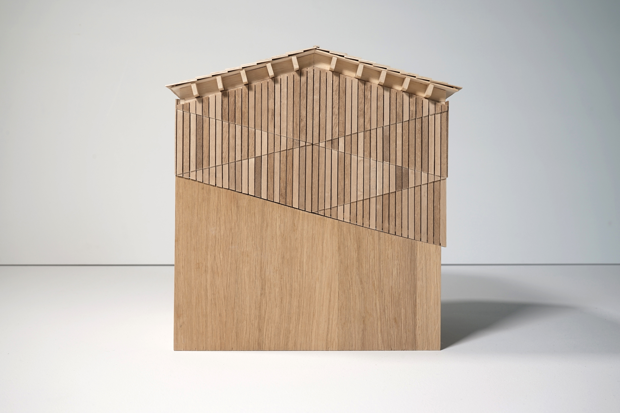 This upper extension is the most enclosed of the site, contiguous to the retaining wall. For this reason, particular attention is paid to the presence of light and views to the mountains. The walls are covered with wooden cladding, and wooden tiles are used for roof covering, referring to vernacular architecture such as regional dryer barns.