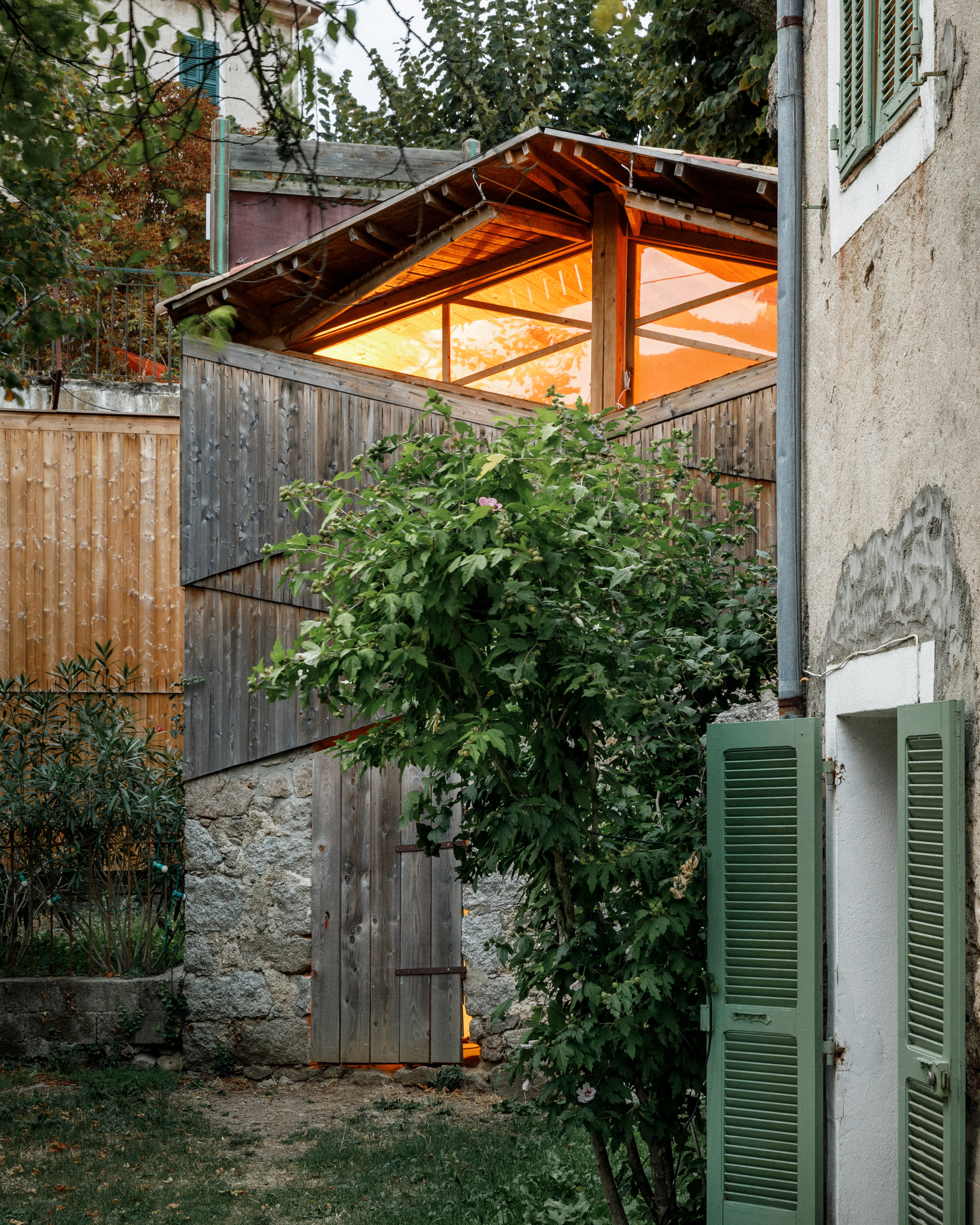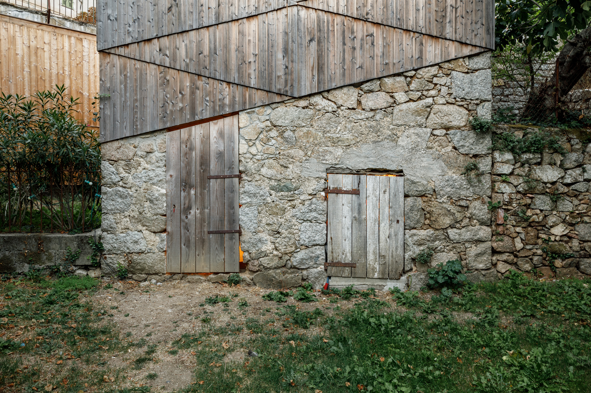 The Ga House is a family home in Corsica, built in the 19th century, in the heart of a mountain village. The renovation project involves the extension of the three site buildings: the main residence (a casa di u ponte), the former carpentry workshop (a casetta), and the old forge (a stazzona). Nestled below a lively square, amidst tall and massive buildings, these vertical extensions create new views of the landscape and the urban surroundings, bring in natural light, and adapt spaces to contemporary uses. On all three buildings, the thick walls serve as a support for a new wooden-clad structure, echoing the materiality of existing openings while giving a contemporary character to the facades. New access points facilitate connections to different levels of the garden, transforming it into a room.
