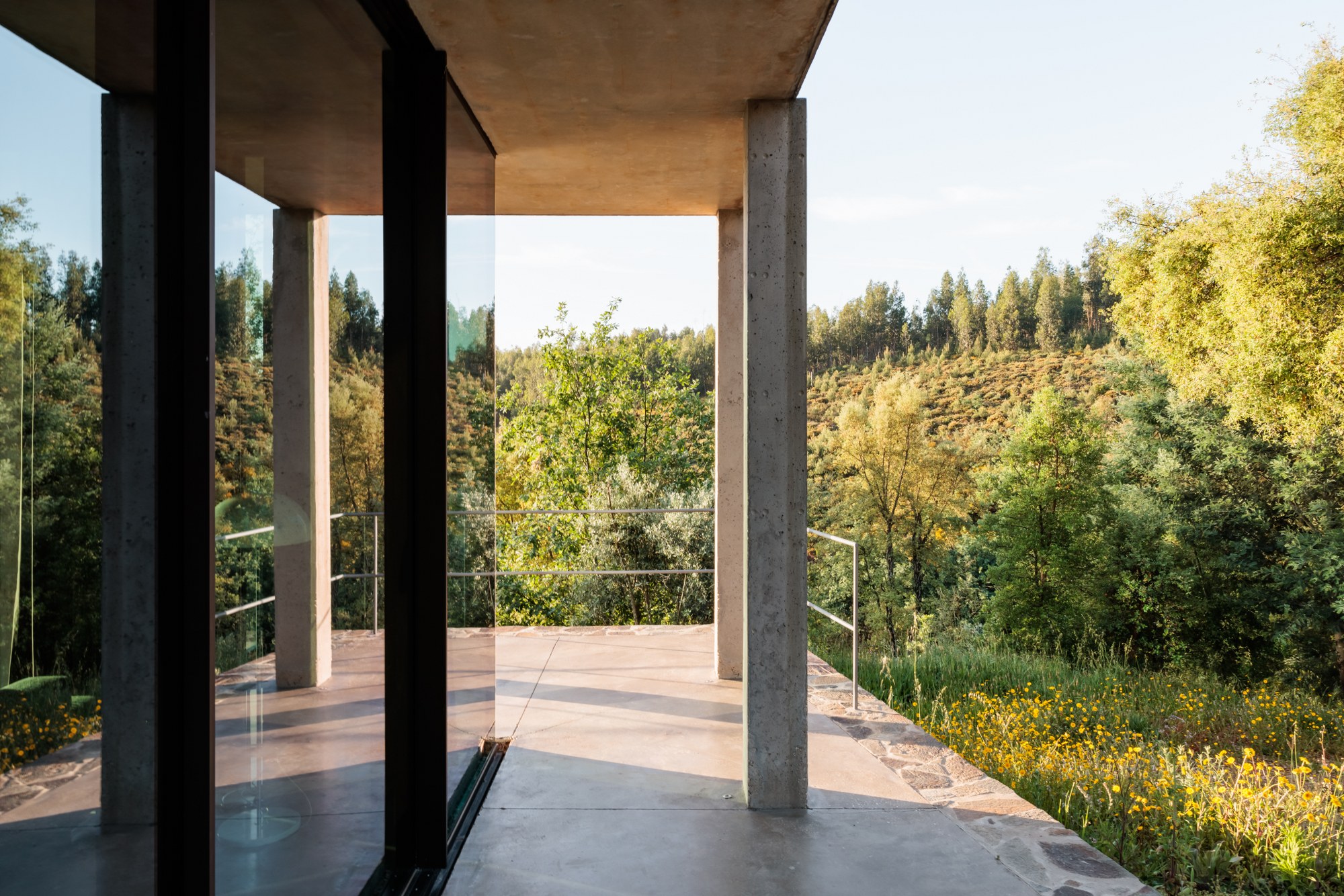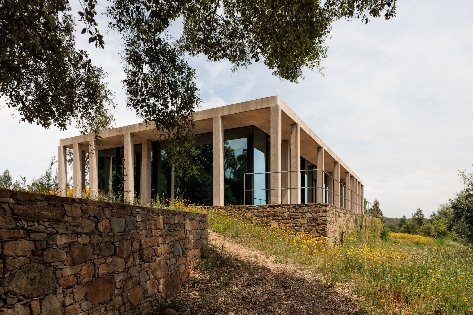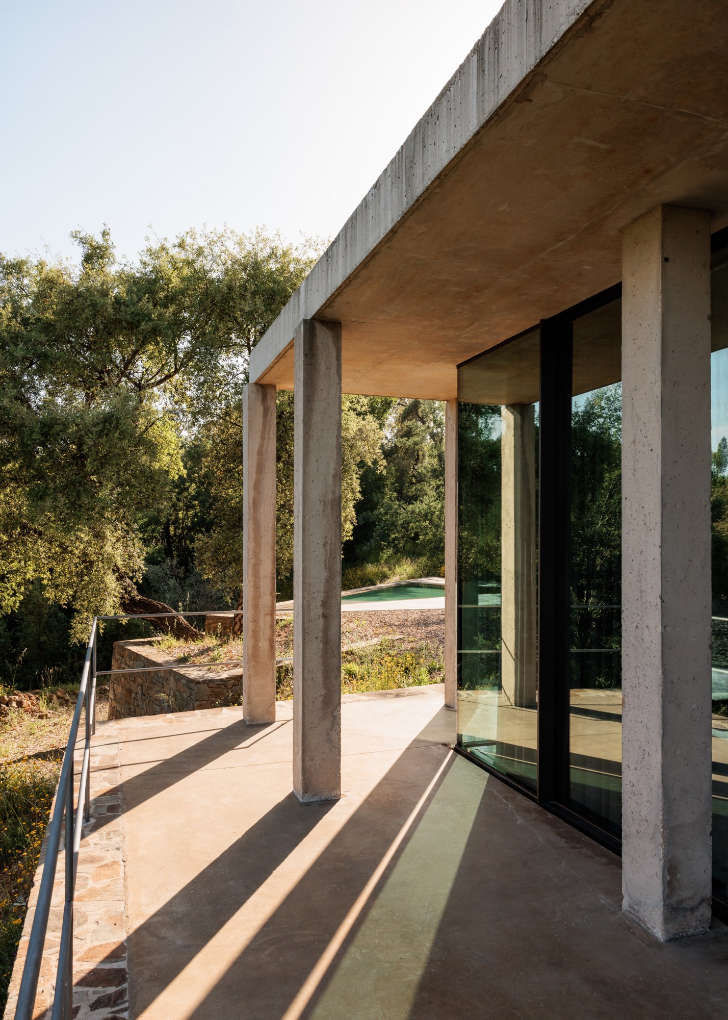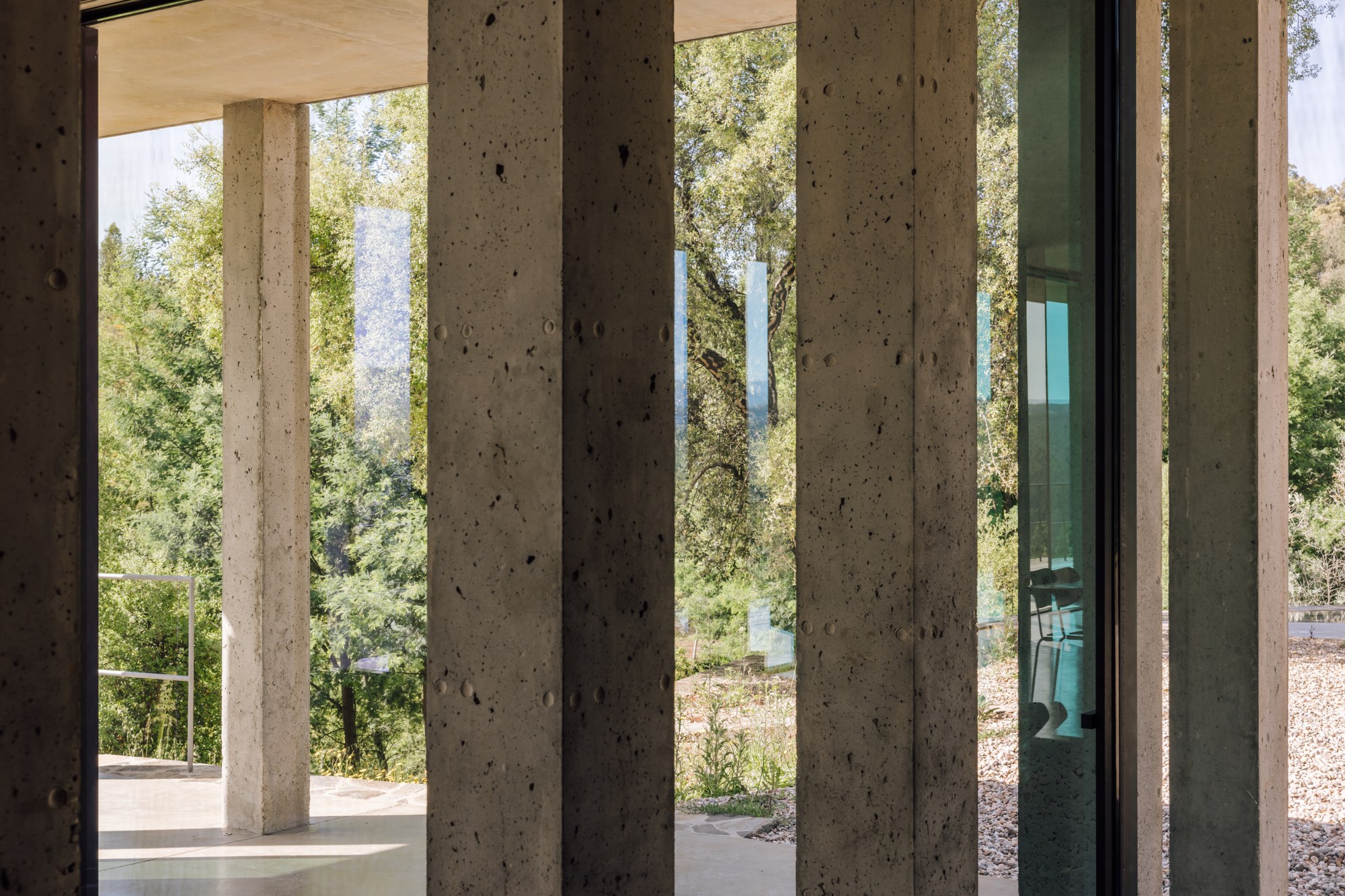 It became clear that the project should recover and lie on these terraces. And the feeling that that topography did not call for a traditional house, from an archetypal point of view, but rather something more undefined, like an inhabited structure. The solution was an abstract construction made of countless columns arranged in an irregular mesh of variable density – a hypostyle structure – seeking to achieve at the same time spatial fluidity and three-dimensional filtering between private spaces and the exterior landscape. Five years later, the surroundings are green again and the new structure now also becomes part of this built landscape system.