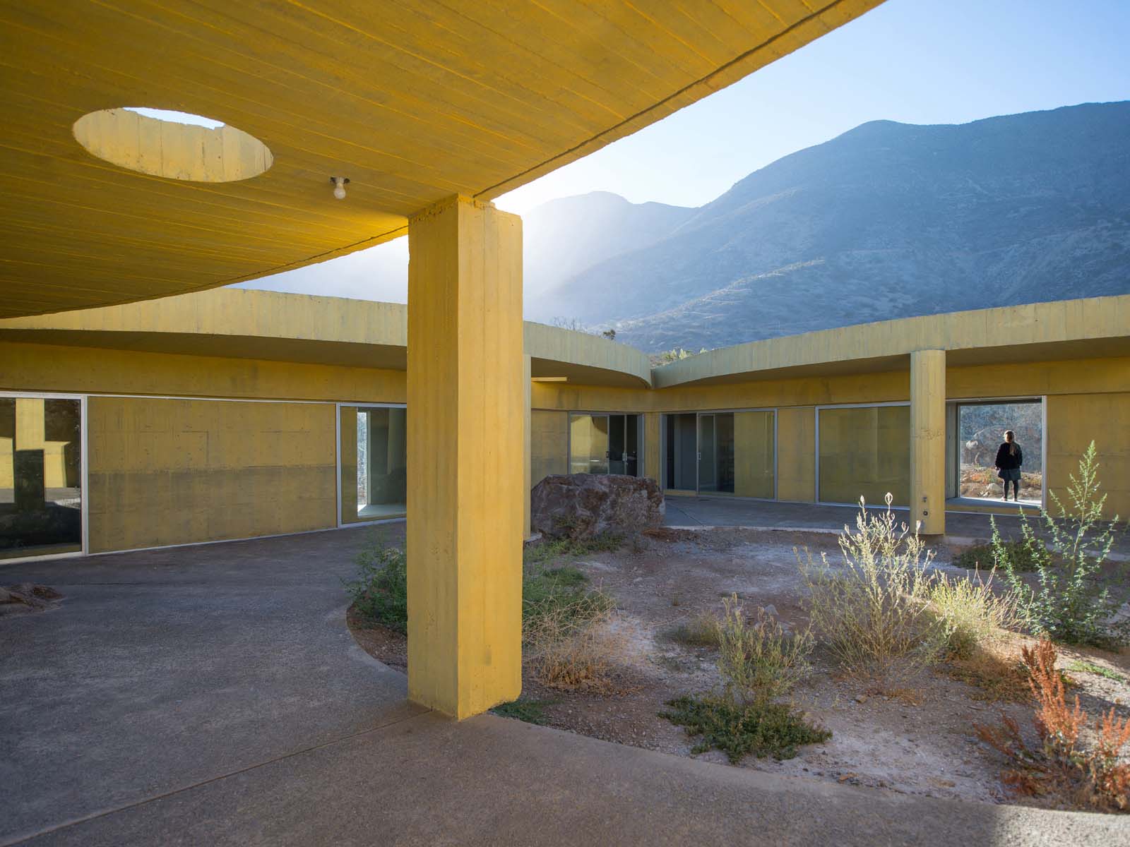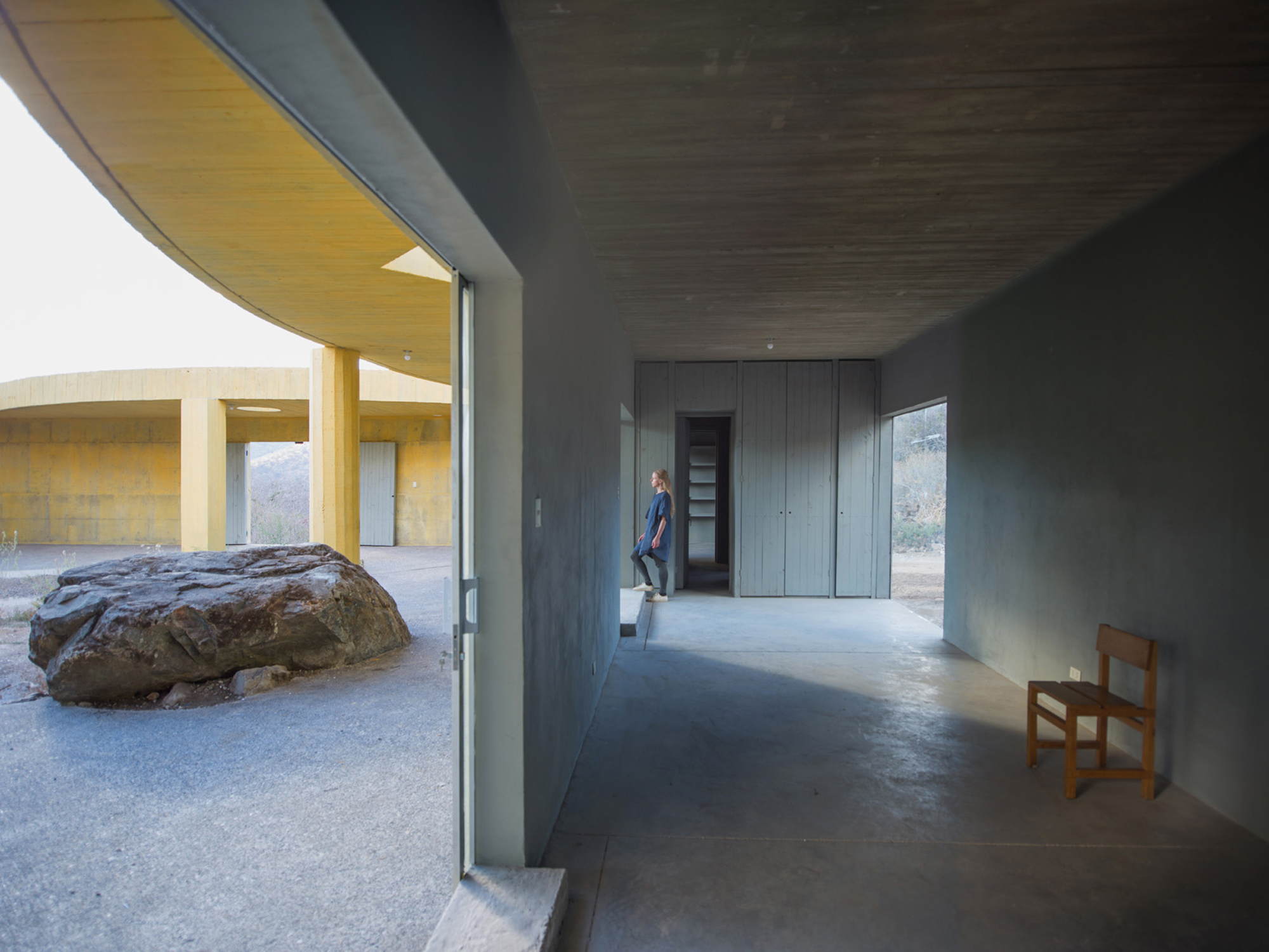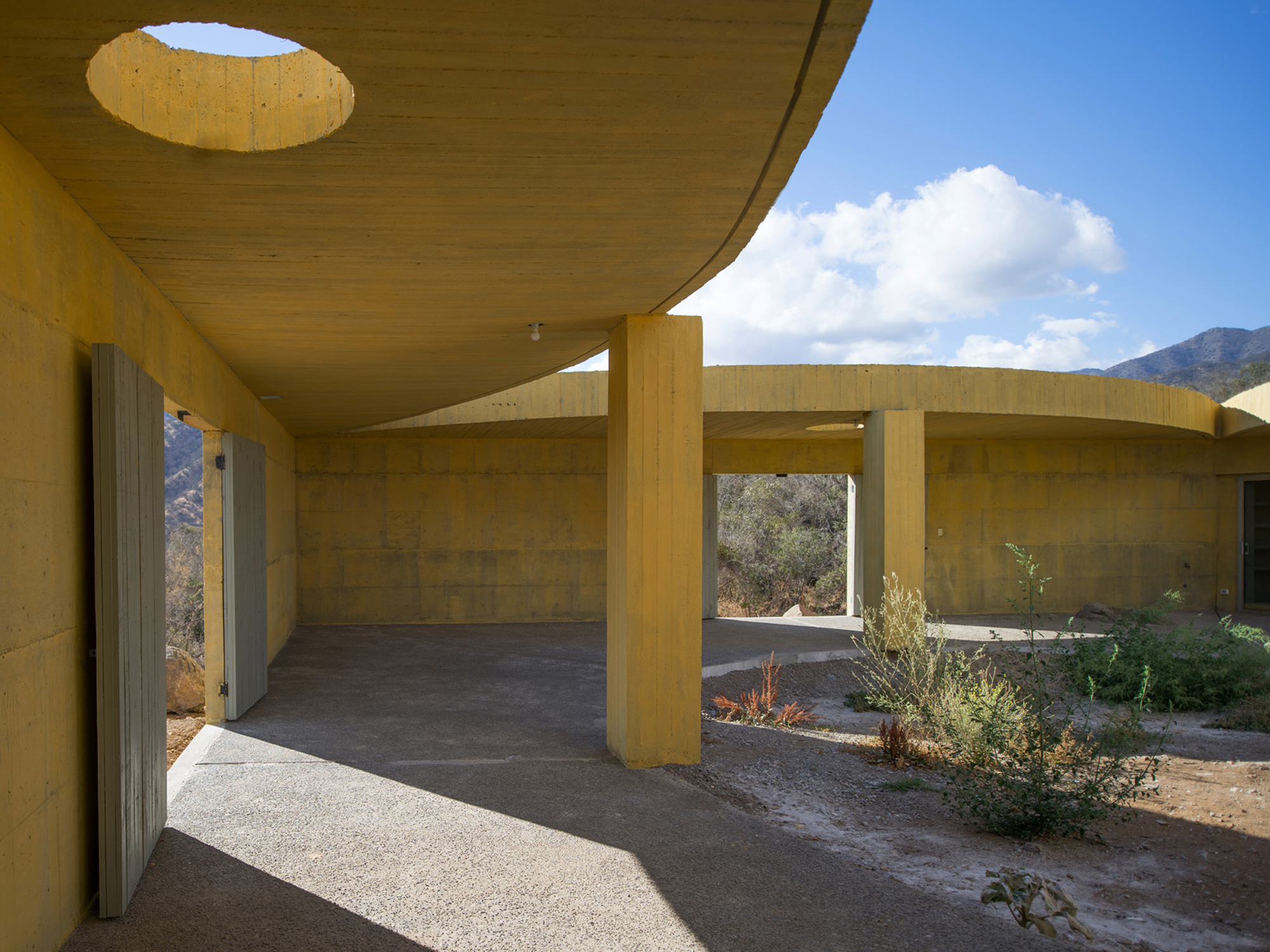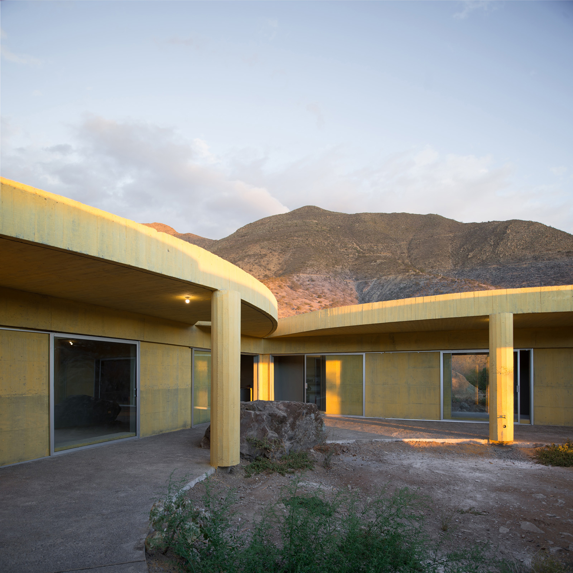 Sitting on a gentle slope, overlooking distant vineyards on a narrow valley, there is an outdoor room with some indoor spaces adjacent to it. This is a hidden room that contains a dry garden, some boulders and rainwater. It is partially covered by four curved slabs, each one of them supported by a bold central column. Since the house establishes a plinth over the landscape, without any predominant direction from within, the lateral sequence of narrow rooms is withdrawn to the back, slightly buried into the natural terrain, promoting an asymmetrical mediation with it. There is a subtle compensation in size and proportion; the lineal distribution of the domestic program, even its reversible end-point condition, is always tangential to the centrality of the courtyard. This larger room, half covered by deep shadows, is an outdoor living space with punctual openings in every side. Depending on the position of the sliding glass panels, the opacity of the cardinal projections is blocked by the mirage of another courtyard. Beyond this illusionary domain, the horizontal format of the house stands as a solitary abstract figure, with a seemingly organic void, but without a definite scale. The reinforced concrete construction, with its yellow pigmentation, appears as a monolithic plate amidst broken stones and native bushes.