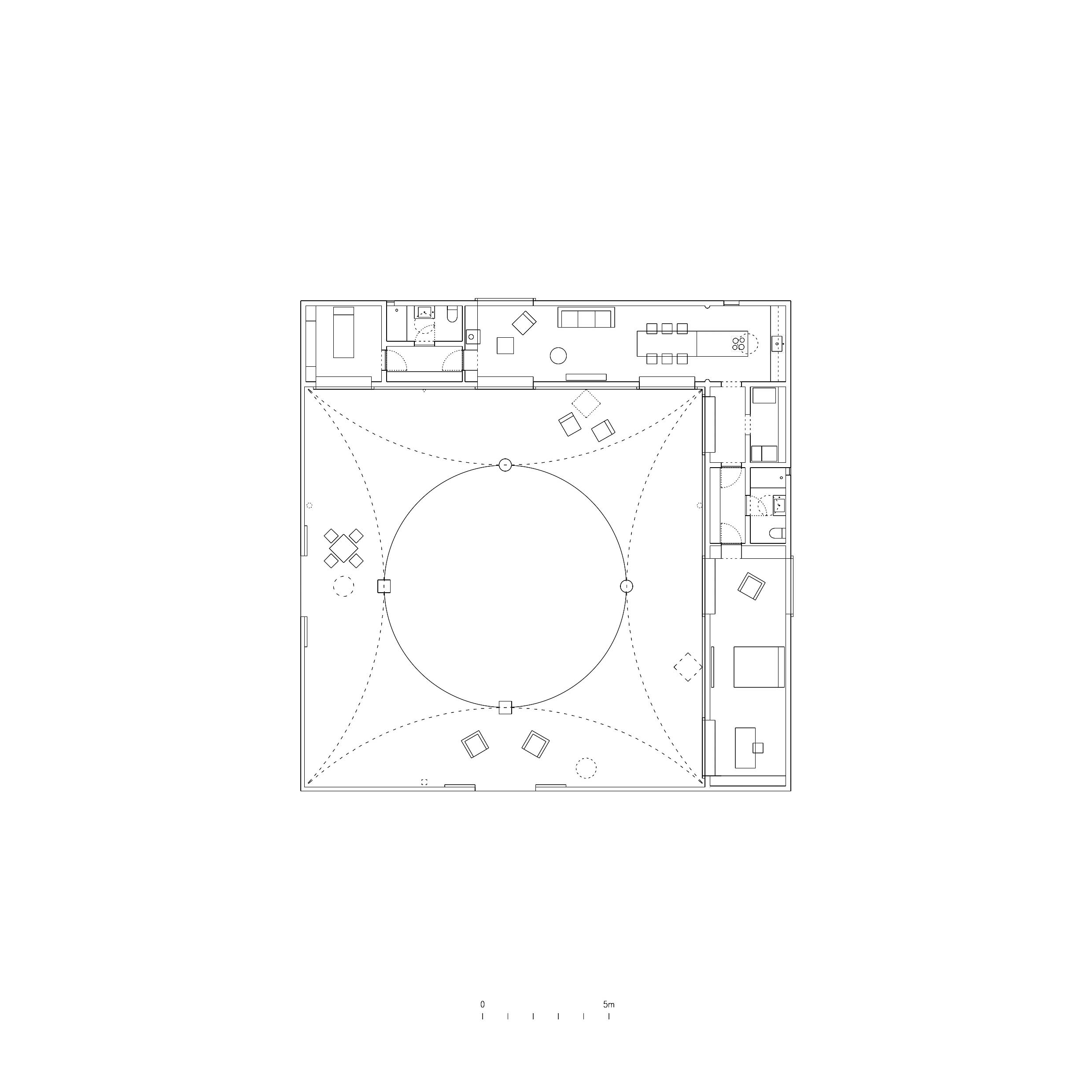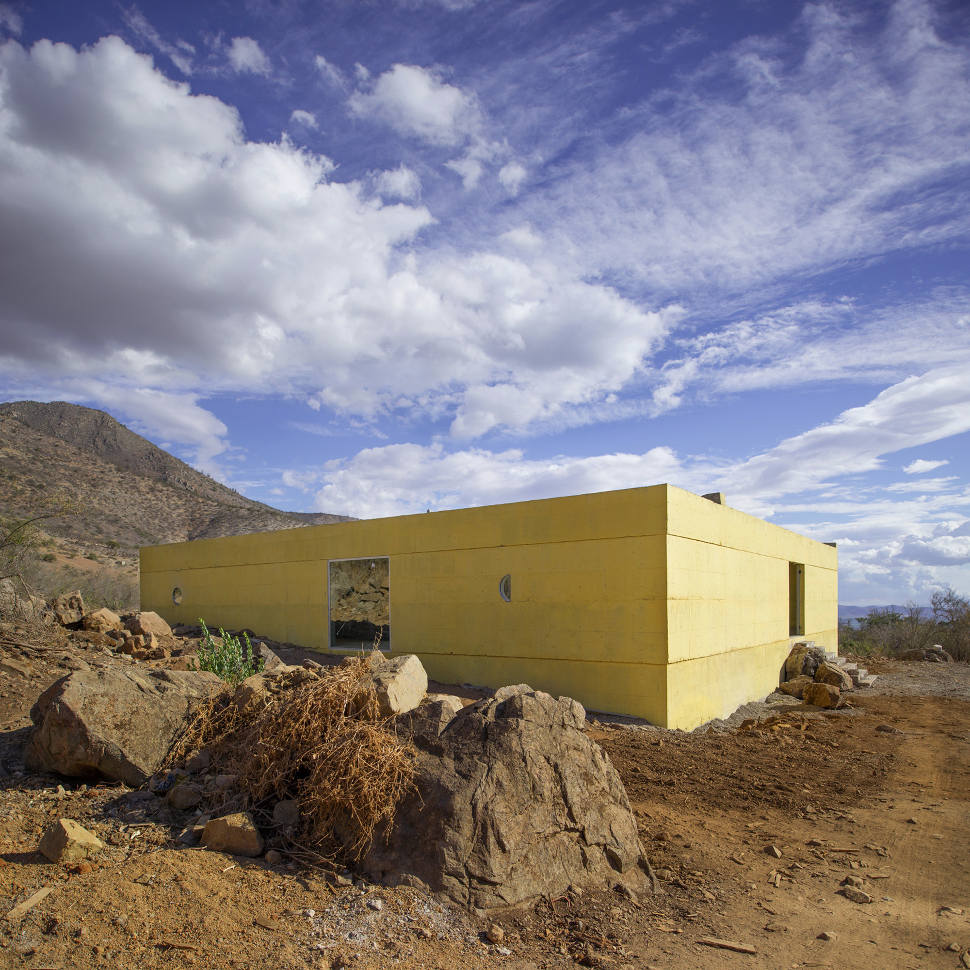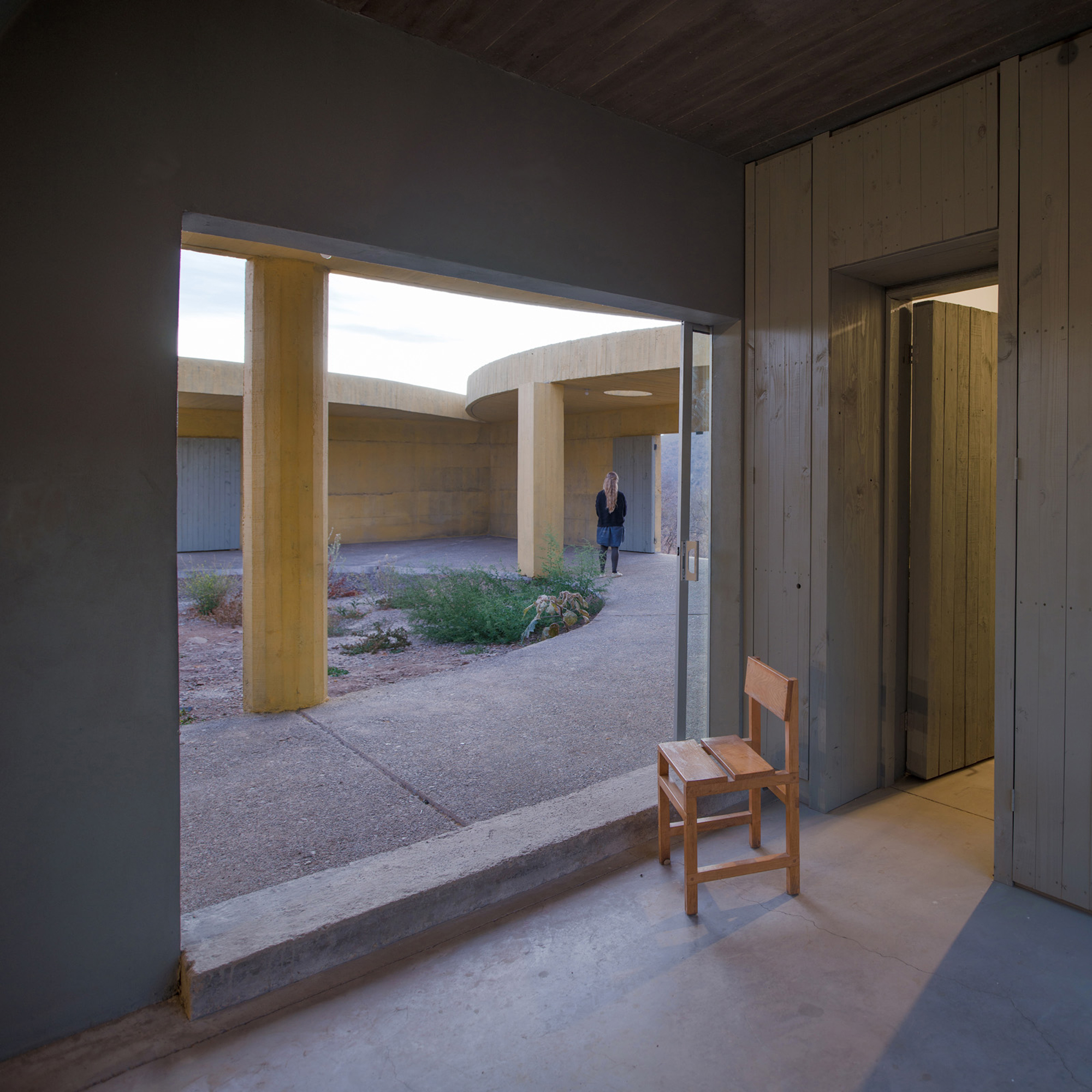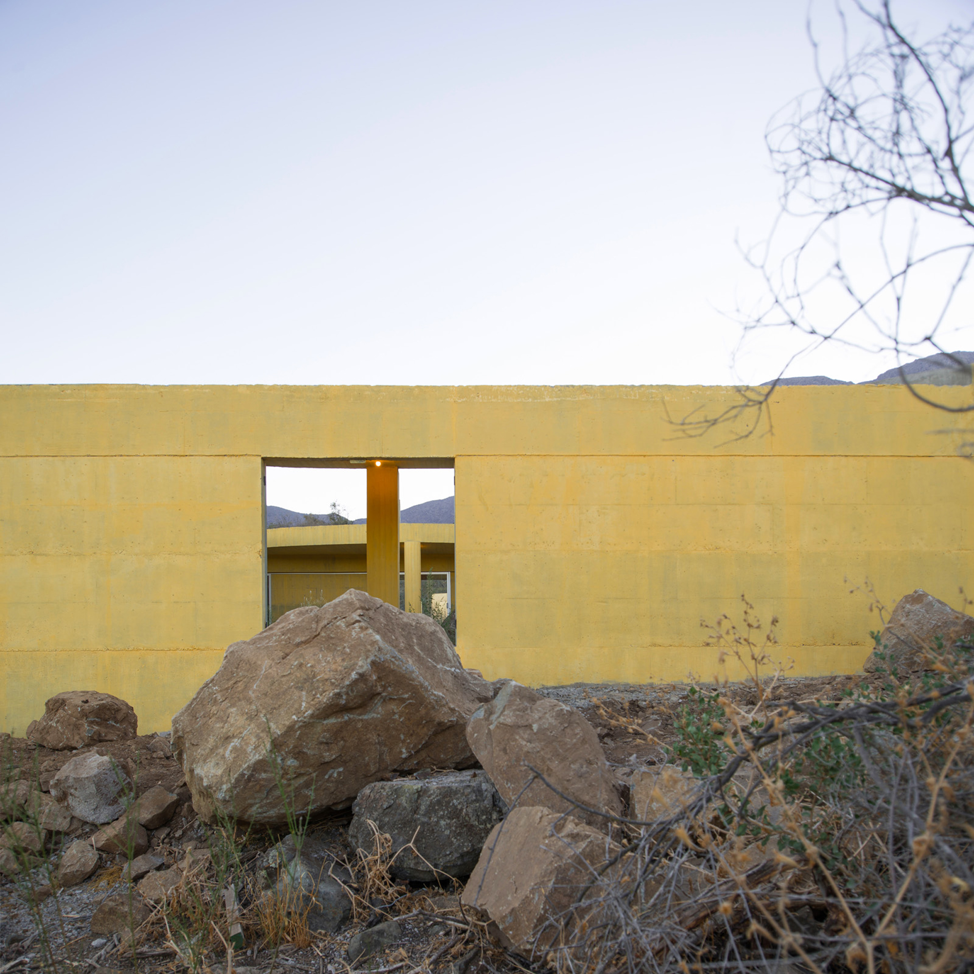 Sitting on a gentle slope, overlooking distant vineyards on a narrow valley, there is an outdoor room with some indoor spaces adjacent to it. This is a hidden room that contains a dry garden, some boulders and rainwater. It is partially covered by four curved slabs, each one of them supported by a bold central column. Since the house establishes a plinth over the landscape, without any predominant direction from within, the lateral sequence of narrow rooms is withdrawn to the back, slightly buried into the natural terrain, promoting an asymmetrical mediation with it. There is a subtle compensation in size and proportion; the lineal distribution of the domestic program, even its reversible end-point condition, is always tangential to the centrality of the courtyard. This larger room, half covered by deep shadows, is an outdoor living space with punctual openings in every side. Depending on the position of the sliding glass panels, the opacity of the cardinal projections is blocked by the mirage of another courtyard. Beyond this illusionary domain, the horizontal format of the house stands as a solitary abstract figure, with a seemingly organic void, but without a definite scale. The reinforced concrete construction, with its yellow pigmentation, appears as a monolithic plate amidst broken stones and native bushes.