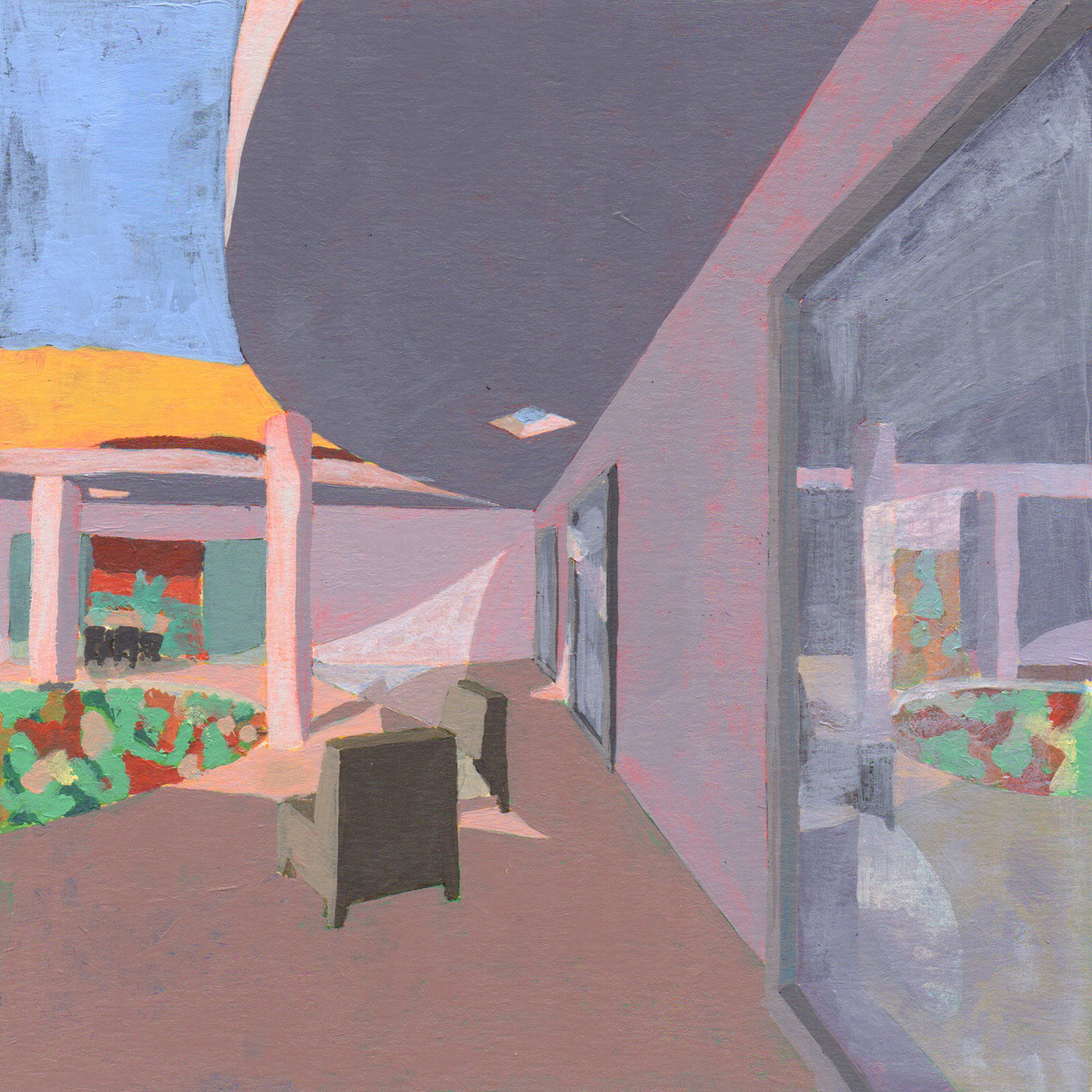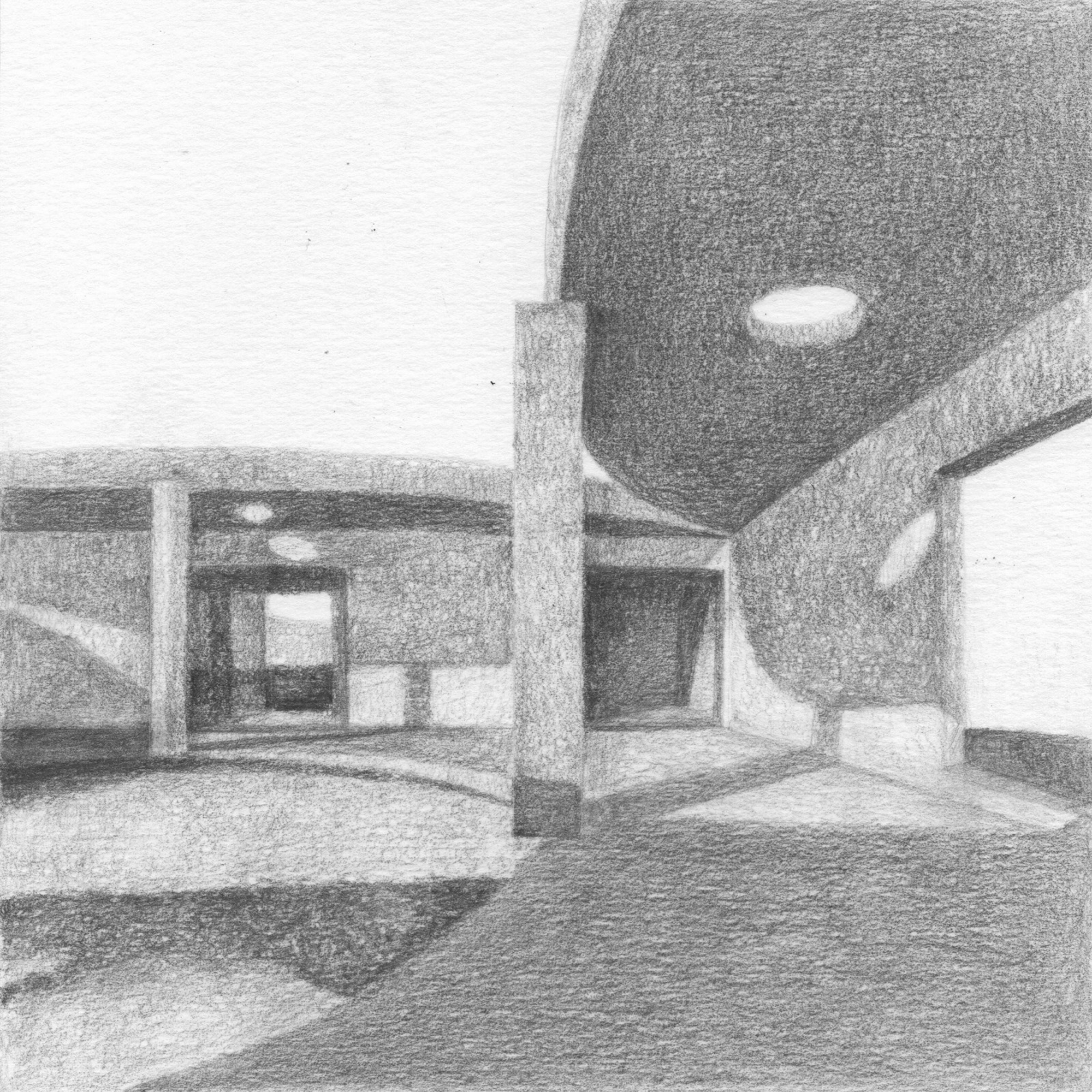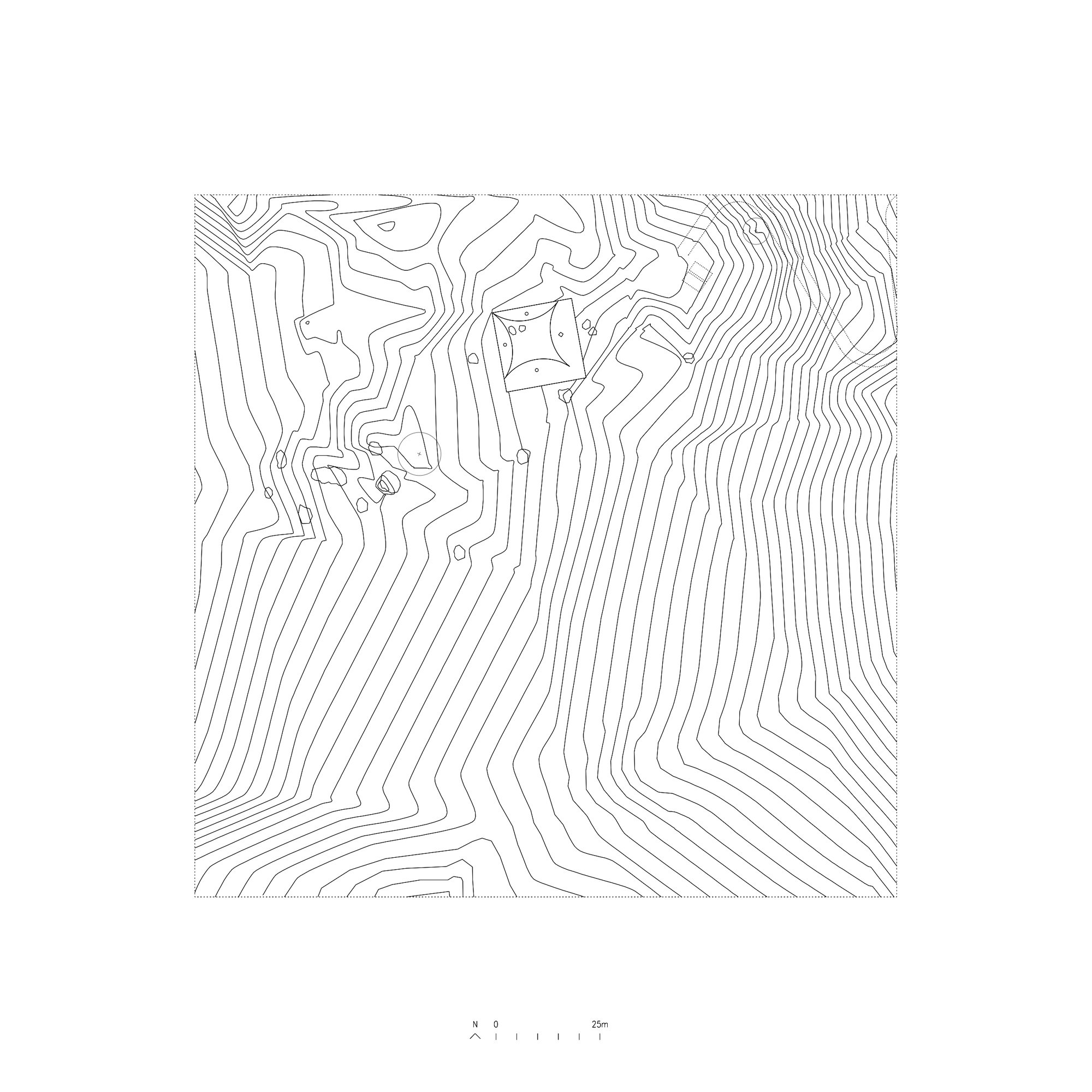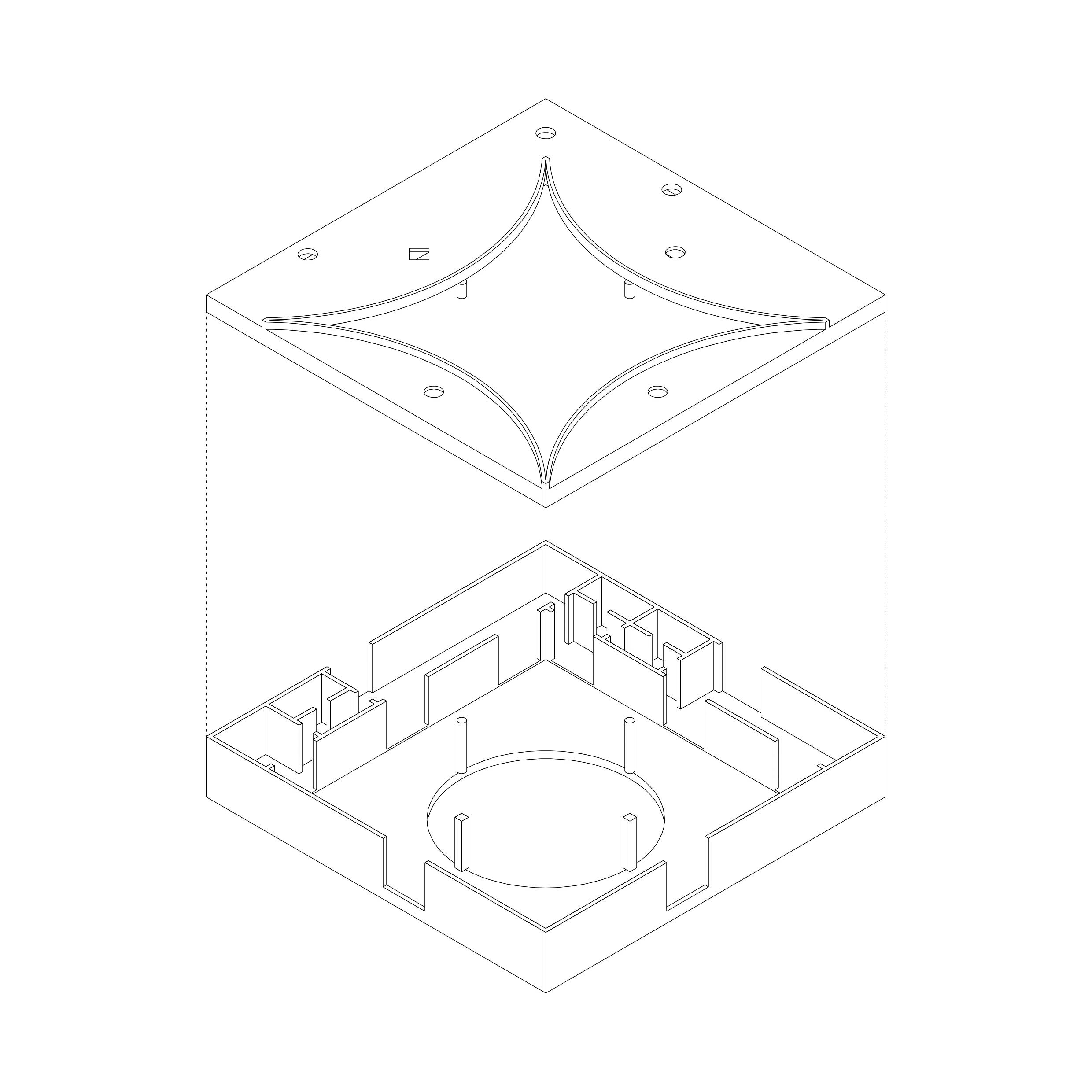 Sitting on a gentle slope, overlooking distant vineyards on a narrow valley, there is an outdoor room with some indoor spaces adjacent to it. This is a hidden room that contains a dry garden, some boulders and rainwater. It is partially covered by four curved slabs, each one of them supported by a bold central column. Since the house establishes a plinth over the landscape, without any predominant direction from within, the lateral sequence of narrow rooms is withdrawn to the back, slightly buried into the natural terrain, promoting an asymmetrical mediation with it. There is a subtle compensation in size and proportion; the lineal distribution of the domestic program, even its reversible end-point condition, is always tangential to the centrality of the courtyard. This larger room, half covered by deep shadows, is an outdoor living space with punctual openings in every side. Depending on the position of the sliding glass panels, the opacity of the cardinal projections is blocked by the mirage of another courtyard. Beyond this illusionary domain, the horizontal format of the house stands as a solitary abstract figure, with a seemingly organic void, but without a definite scale. The reinforced concrete construction, with its yellow pigmentation, appears as a monolithic plate amidst broken stones and native bushes.