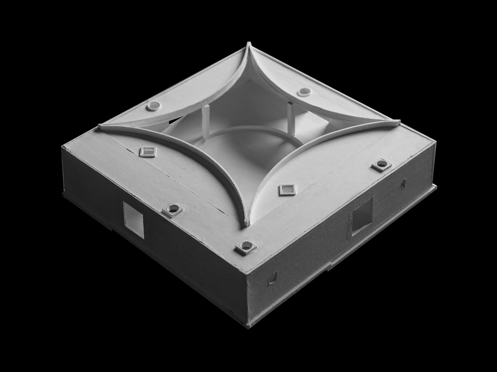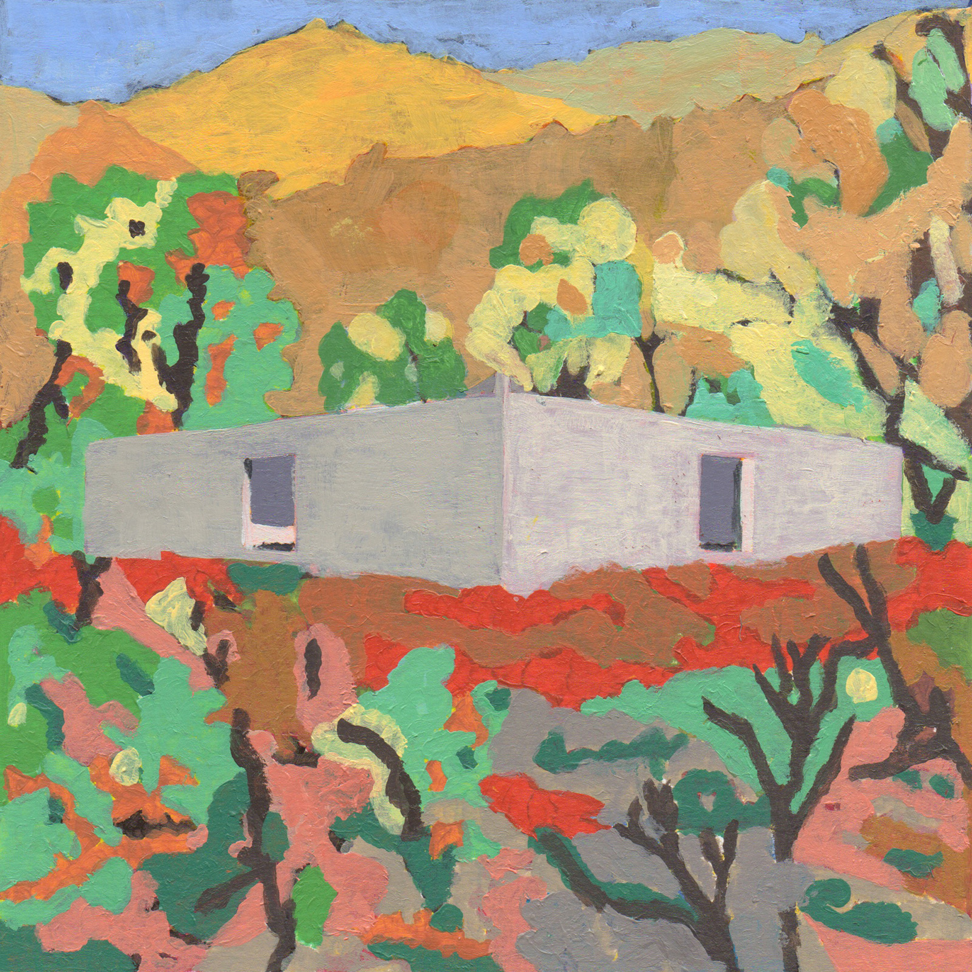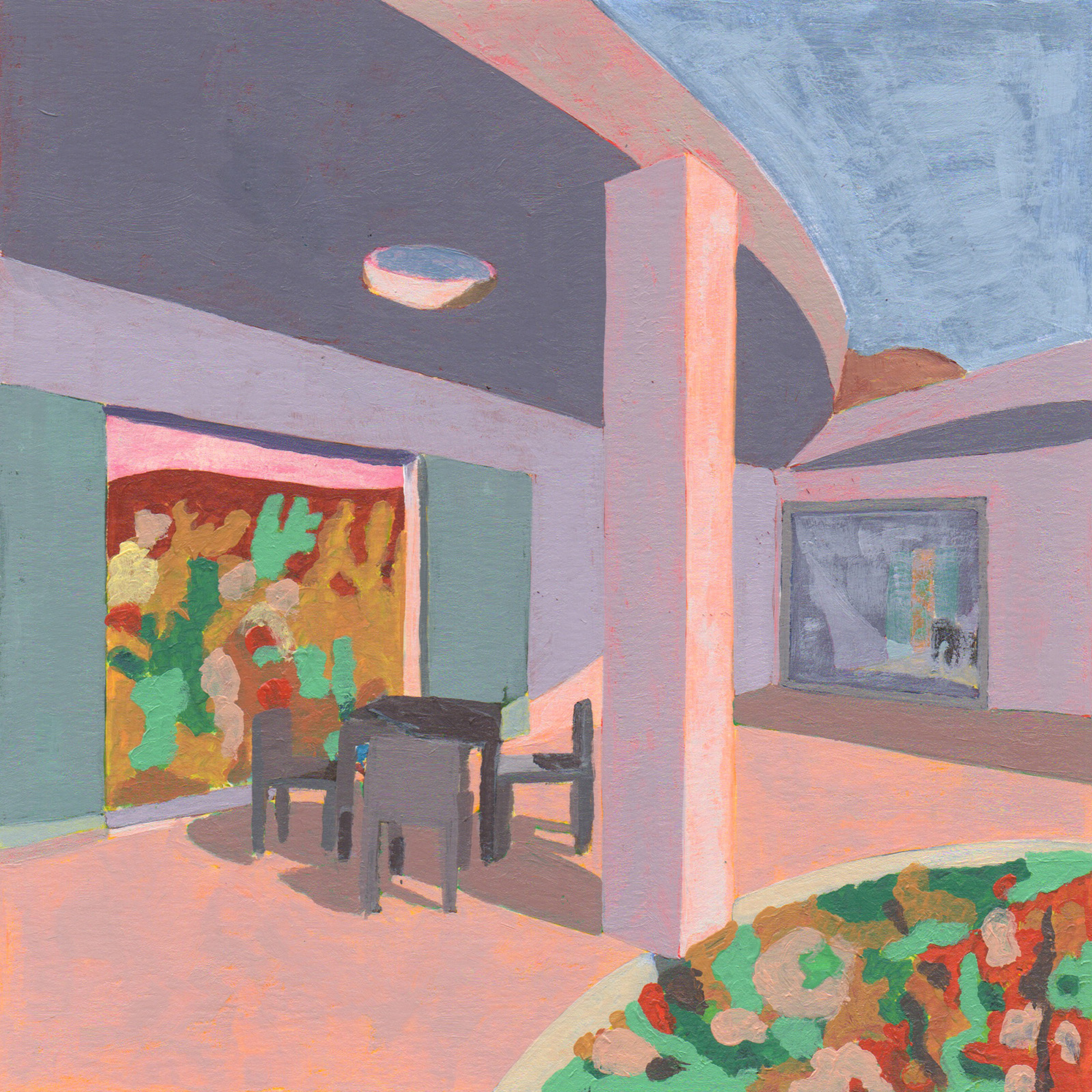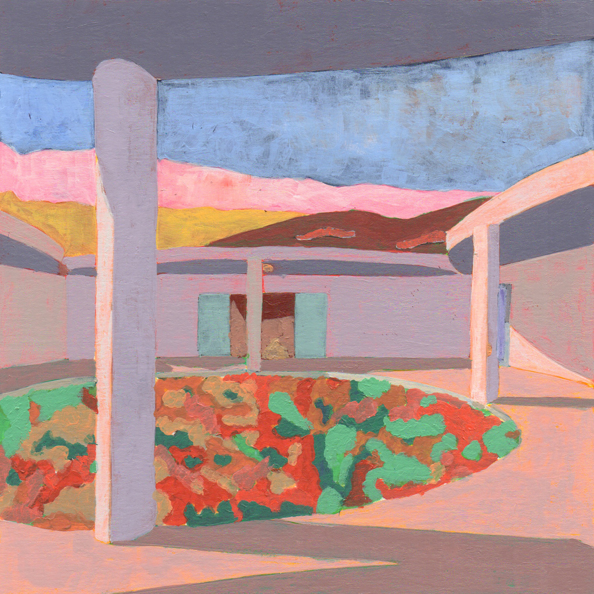 Sitting on a gentle slope, overlooking distant vineyards on a narrow valley, there is an outdoor room with some indoor spaces adjacent to it. This is a hidden room that contains a dry garden, some boulders and rainwater. It is partially covered by four curved slabs, each one of them supported by a bold central column. Since the house establishes a plinth over the landscape, without any predominant direction from within, the lateral sequence of narrow rooms is withdrawn to the back, slightly buried into the natural terrain, promoting an asymmetrical mediation with it. There is a subtle compensation in size and proportion; the lineal distribution of the domestic program, even its reversible end-point condition, is always tangential to the centrality of the courtyard. This larger room, half covered by deep shadows, is an outdoor living space with punctual openings in every side. Depending on the position of the sliding glass panels, the opacity of the cardinal projections is blocked by the mirage of another courtyard. Beyond this illusionary domain, the horizontal format of the house stands as a solitary abstract figure, with a seemingly organic void, but without a definite scale. The reinforced concrete construction, with its yellow pigmentation, appears as a monolithic plate amidst broken stones and native bushes.