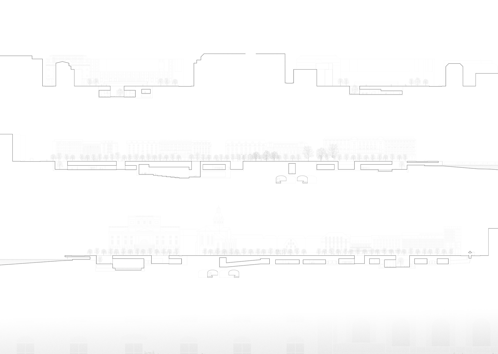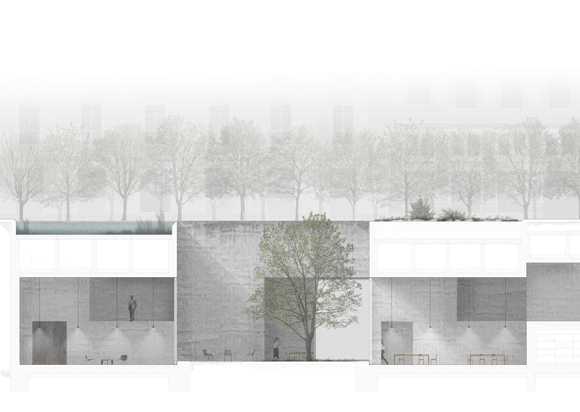From these initial considerations, two focal themes of the project emerge: enhancing the spatial qualities of the site and strengthening the connections to the city and its neighbouring buildings.Hence the desire to construct the building underground. The entire surface of the park will be perforated by a series of light patios, recurring elements that allow natural lighting of the spaces and at the same time create a dialogue between the underground building and the surface of the park.