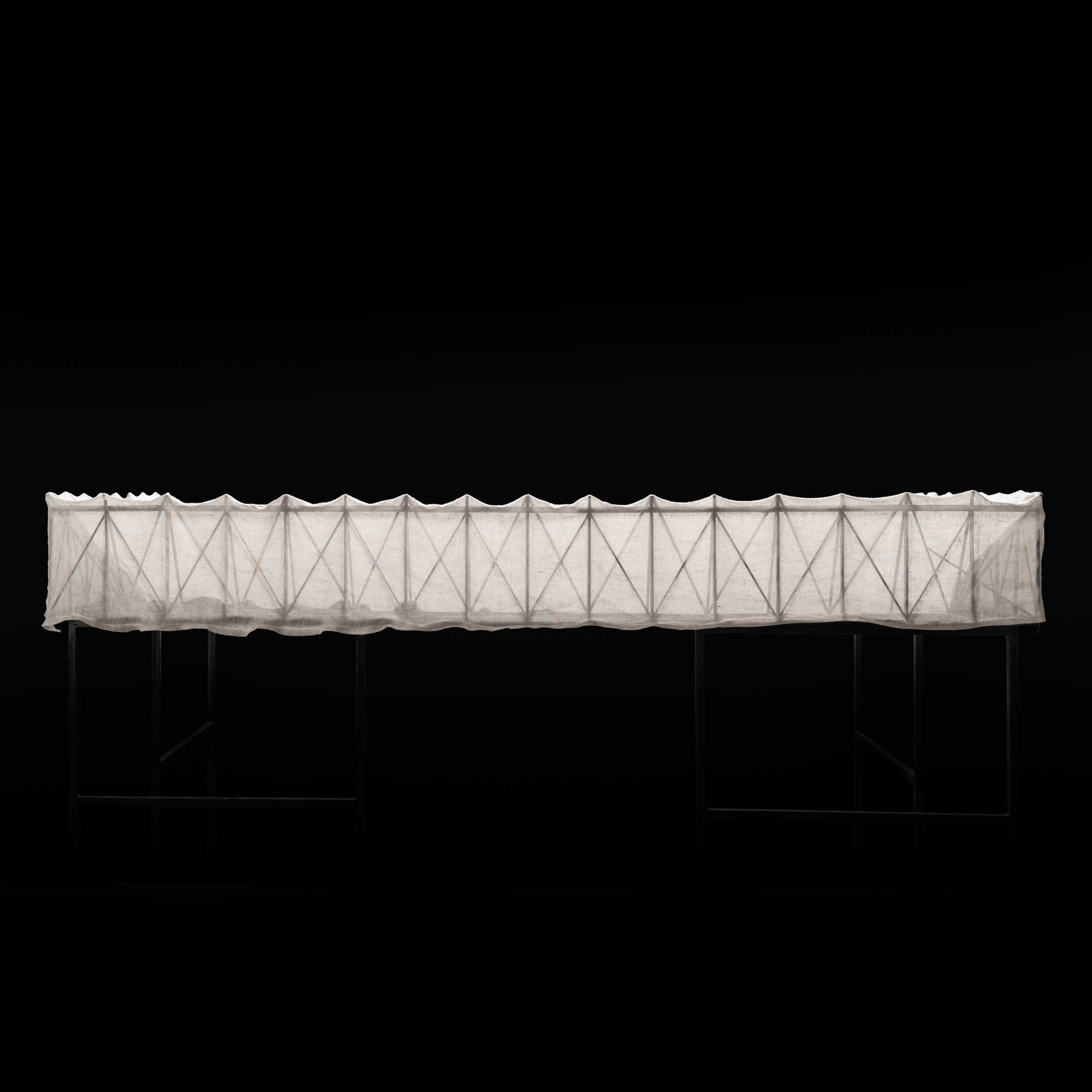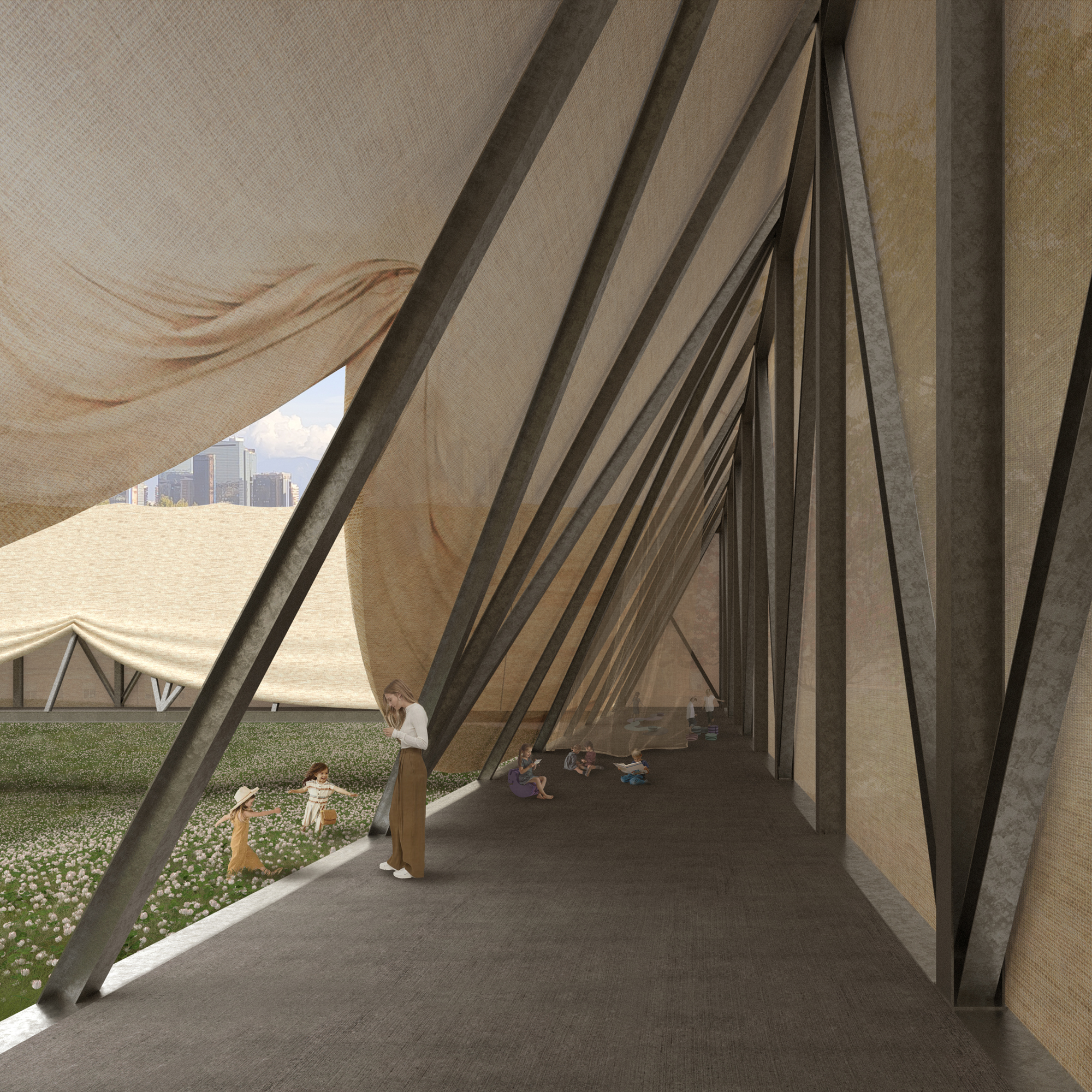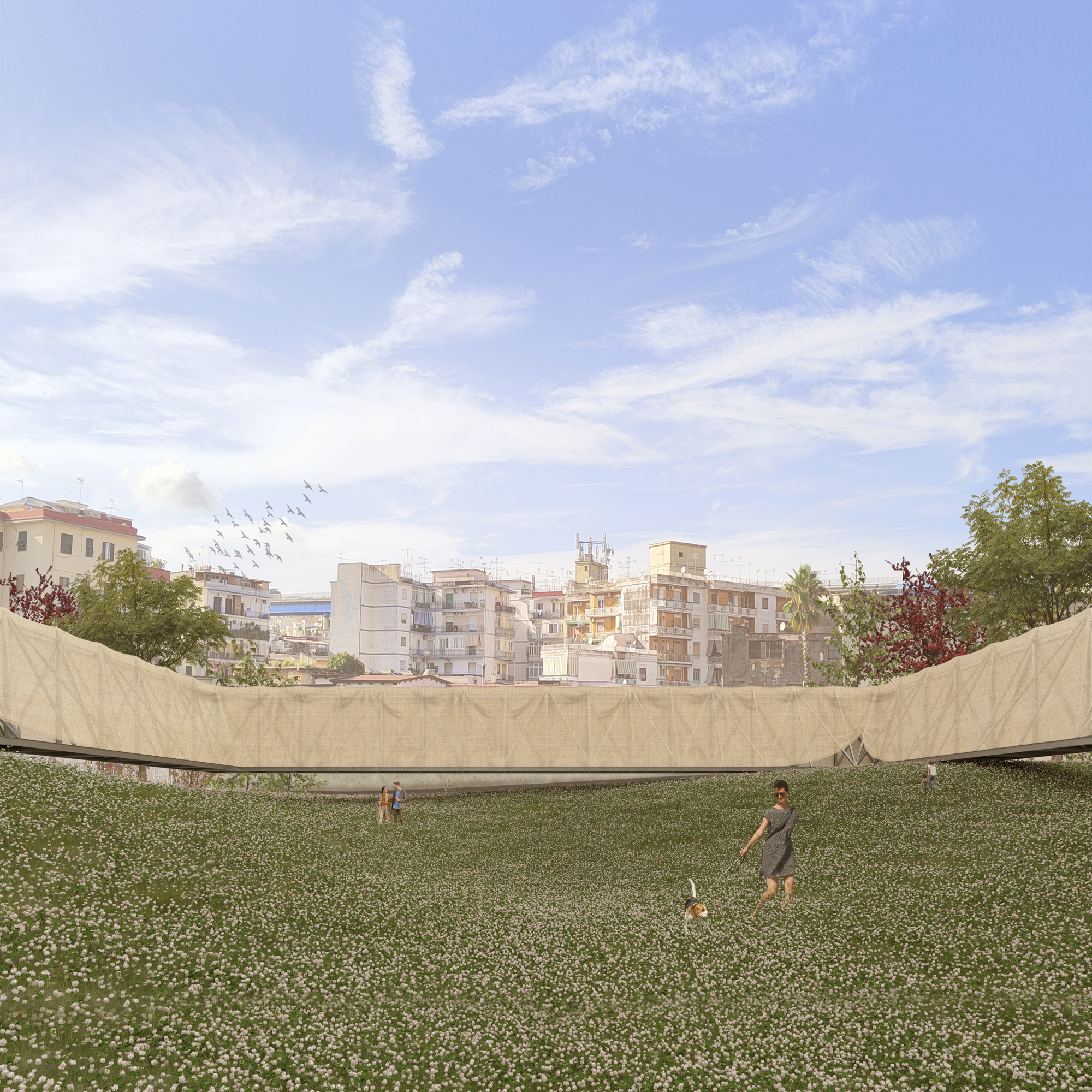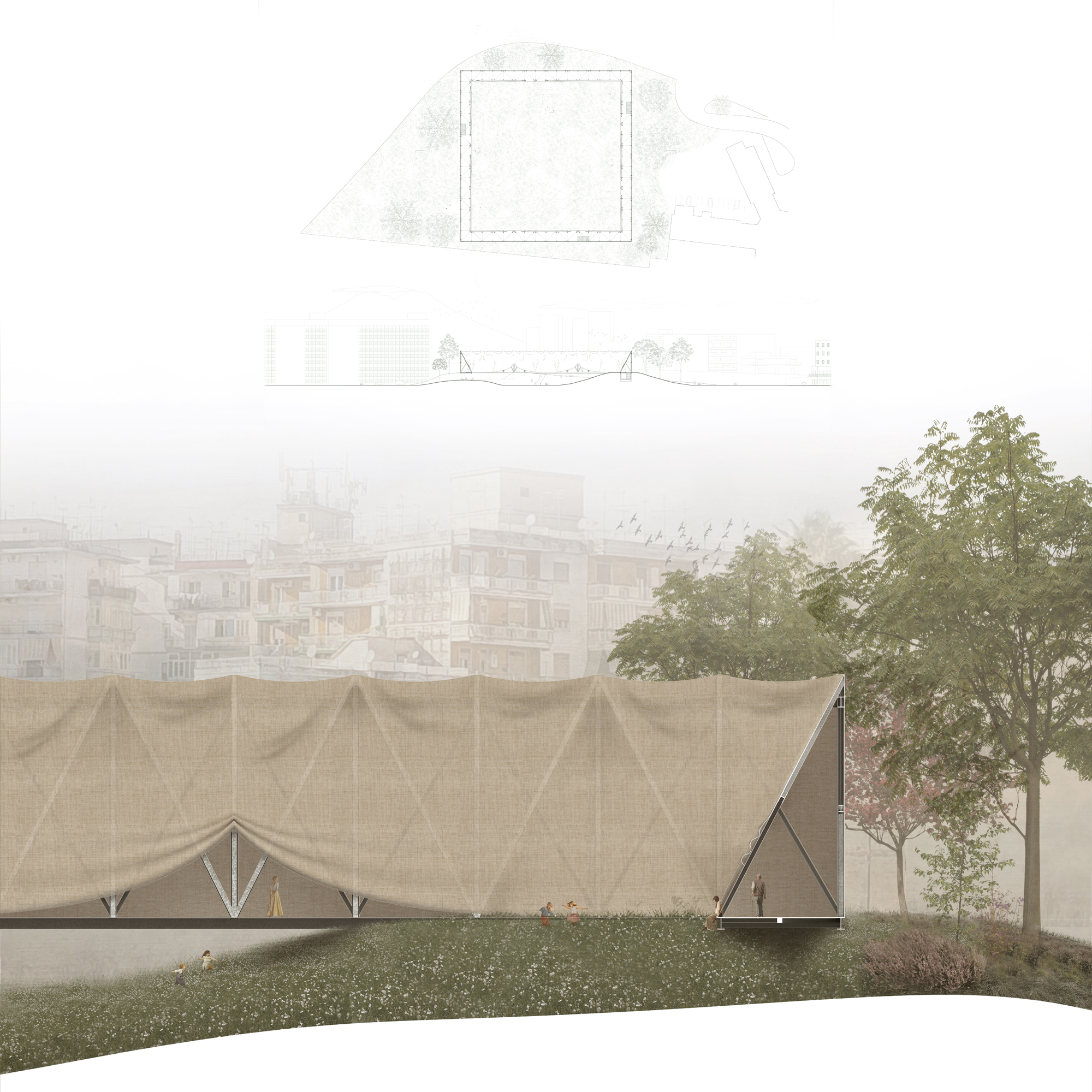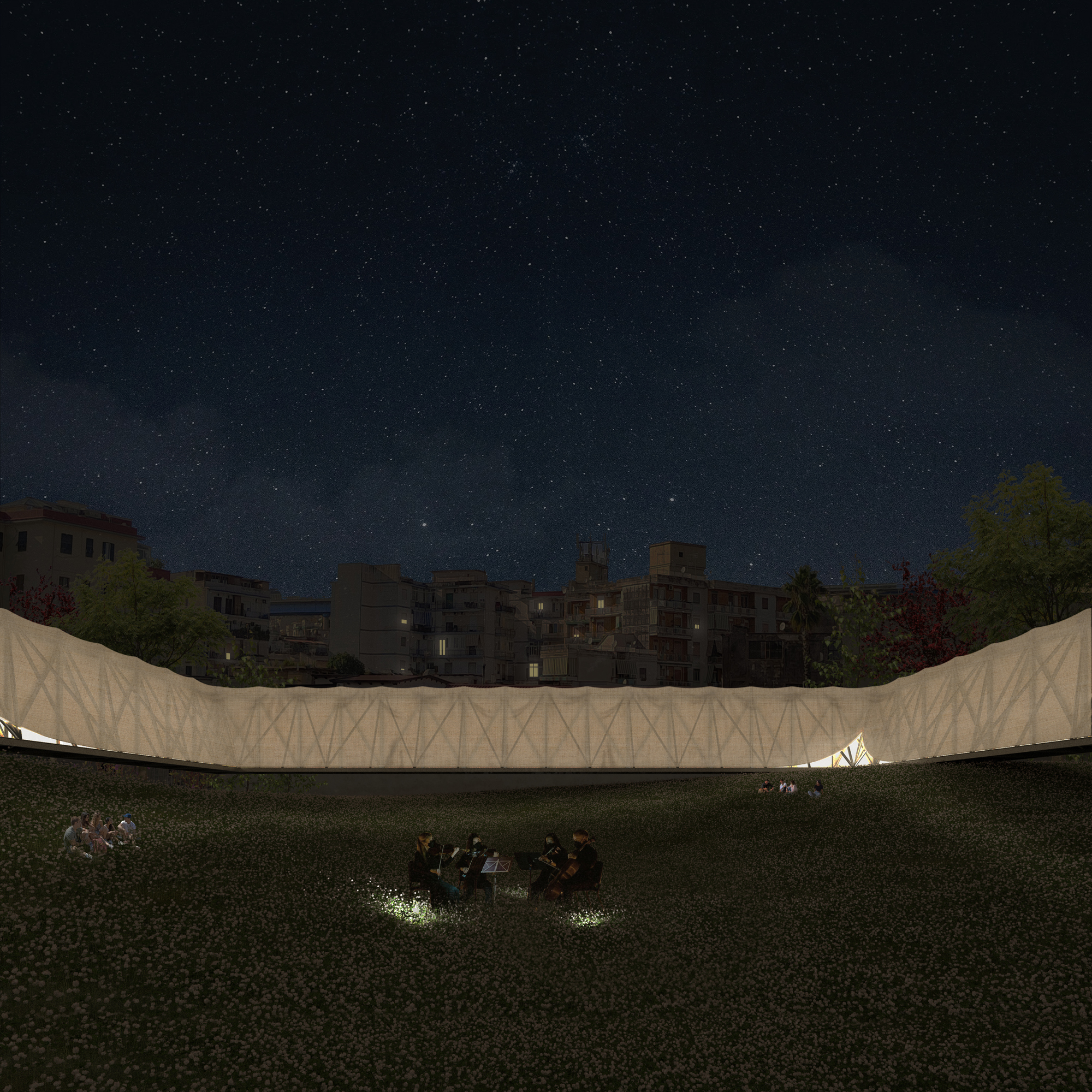 In such a delicate area in terms of density and social themes the community perceives the existing historical courtyards in the surroundings as landmarks for meeting places or spaces accessible to the poorest part of the population. The starting point of the project is a courtyard of the same size of the existing ones that can welcome the entire community and can be used for any function the neighbourhood needs as an open architecture. The building is a metal structure trellis supported by 3 artificial hills that hide the services and provide access to the building and creating a new park. The envelope is the result of the research on a material linked to the textile history of Naples: linen. It is used in all its forms for every non-structural part, linen fabric for the skin, a treatment with linseed oil for waterproofing and linen fibres for the fibre-reinforced cement of the floor. Linen husk can also be used as insulation. The curtains can be opened according to light and air requirements, but their permeability allows a translucent effect that lets in diffuse light during the day and at night, if used, the building lights up from the outside.