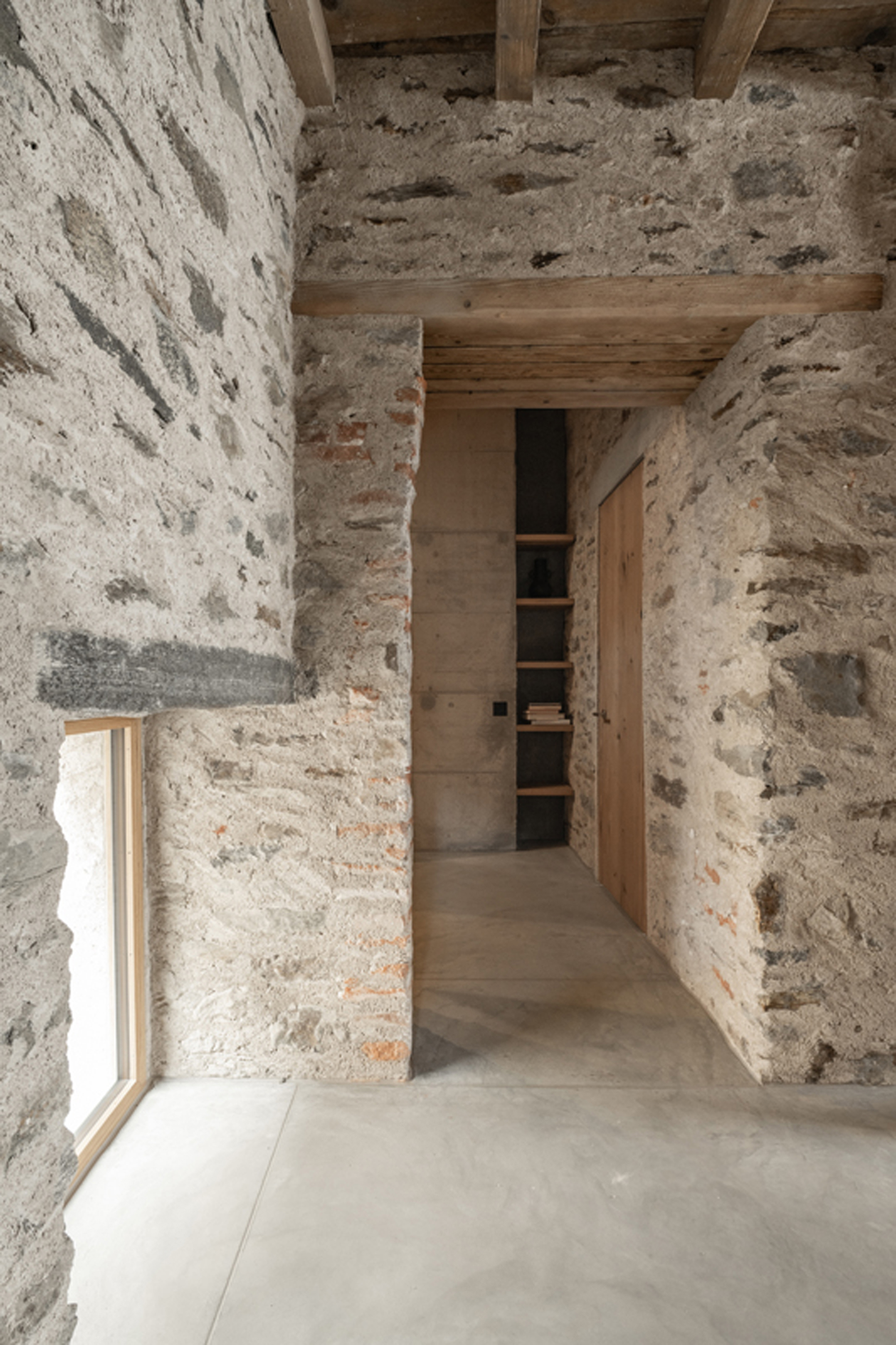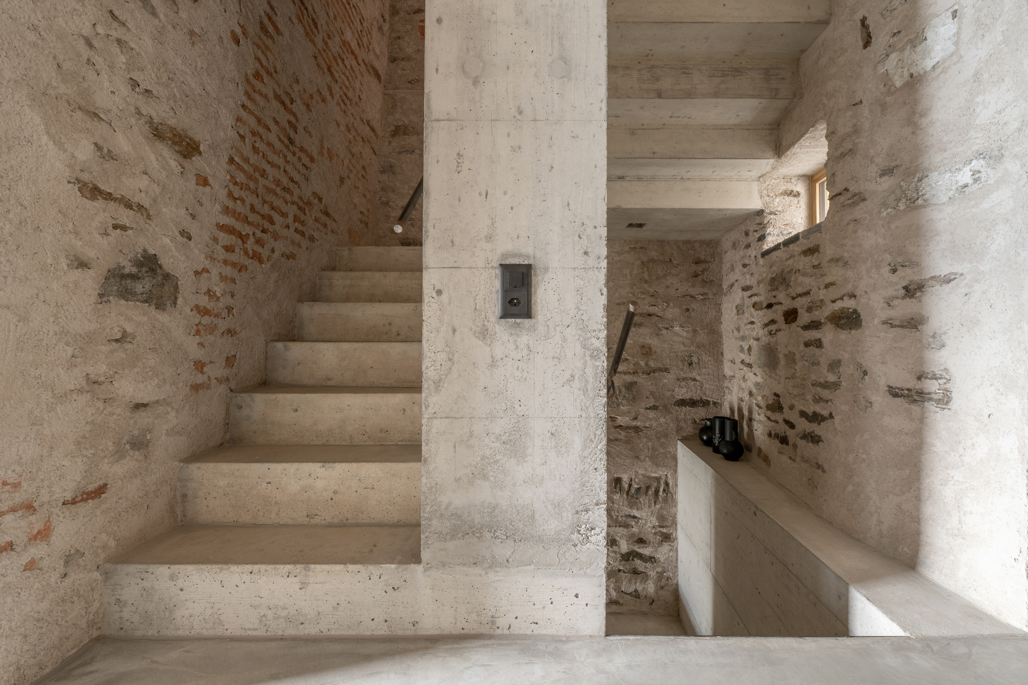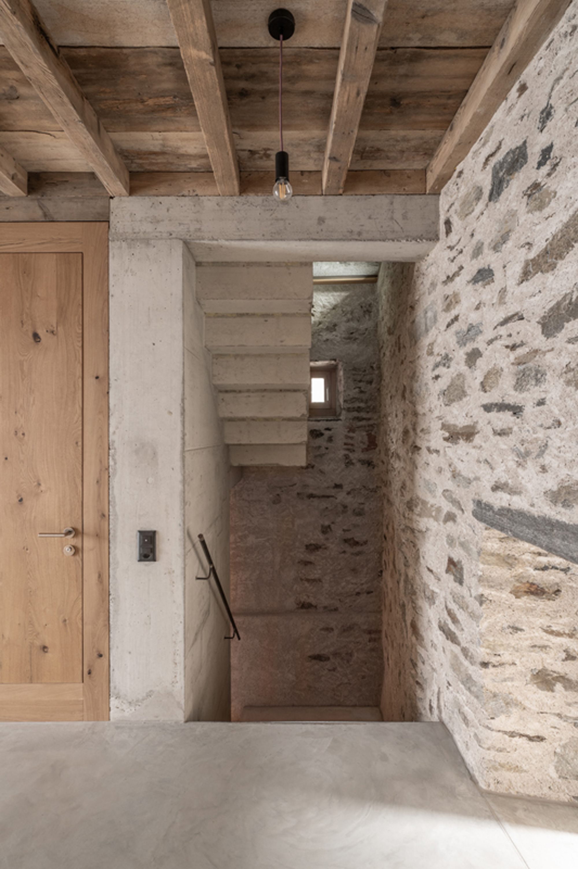 In the bathroom and in the staircase area on the upper floor, a visual connection to the very beautiful roof truss is created by removing the existing ceiling and installing a horizontal glazing. With these interventions, the roof truss can also be experienced on this floor. Whereas the window openings on the upper floors are essentially maintained, on the lowest floor (for the new living rooms and kitchen), three modern moderately dimensioned new openings offer better light and view. Two of these openings (kitchen and dining room) may have already been in the same place, they fit very naturally into the context. The non-historic plaster on all façades and on the old interior walls were removed and the natural stone walls underneath were exposed, only plastered partially, how it probably was originally and how as it is in many other houses in the village.