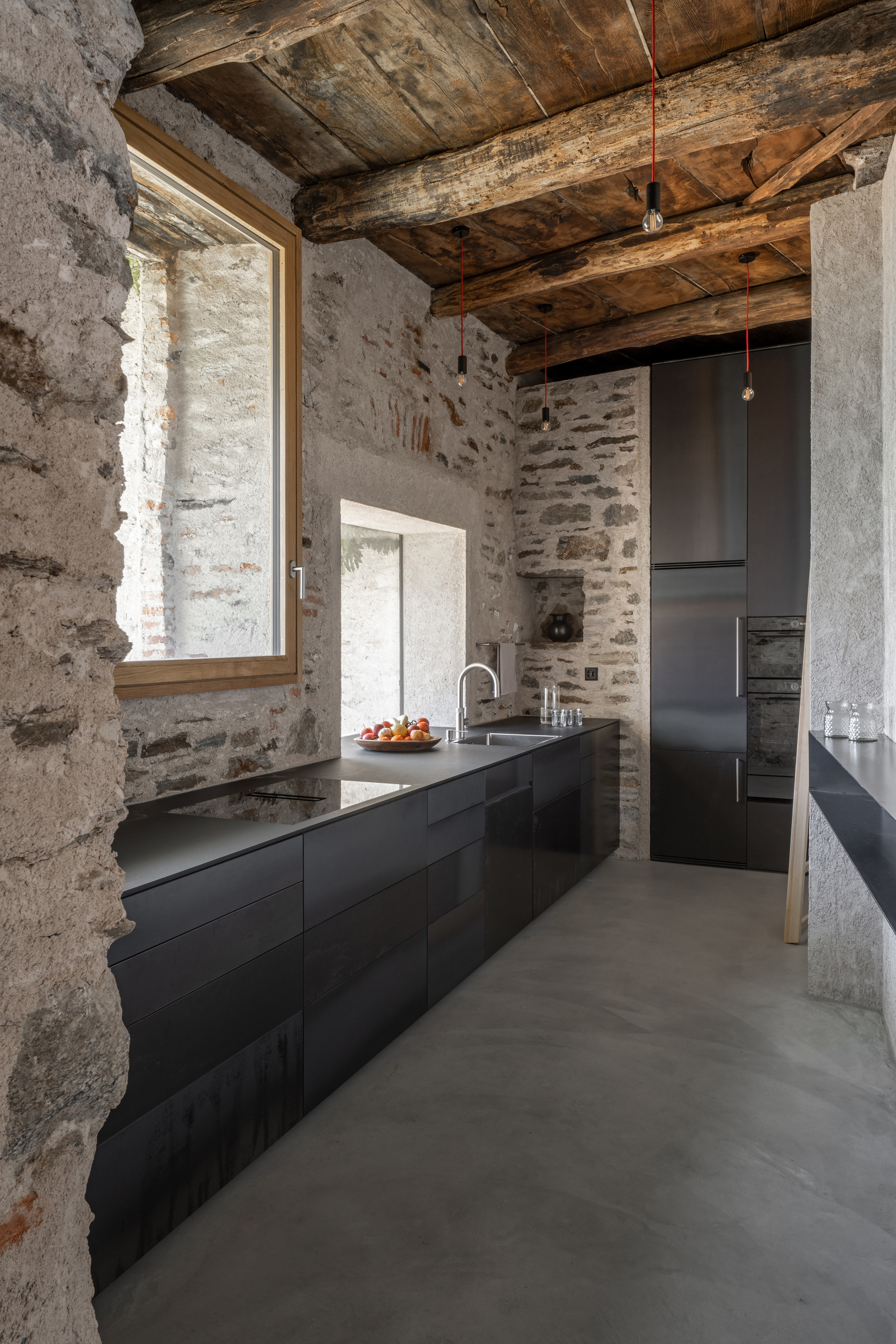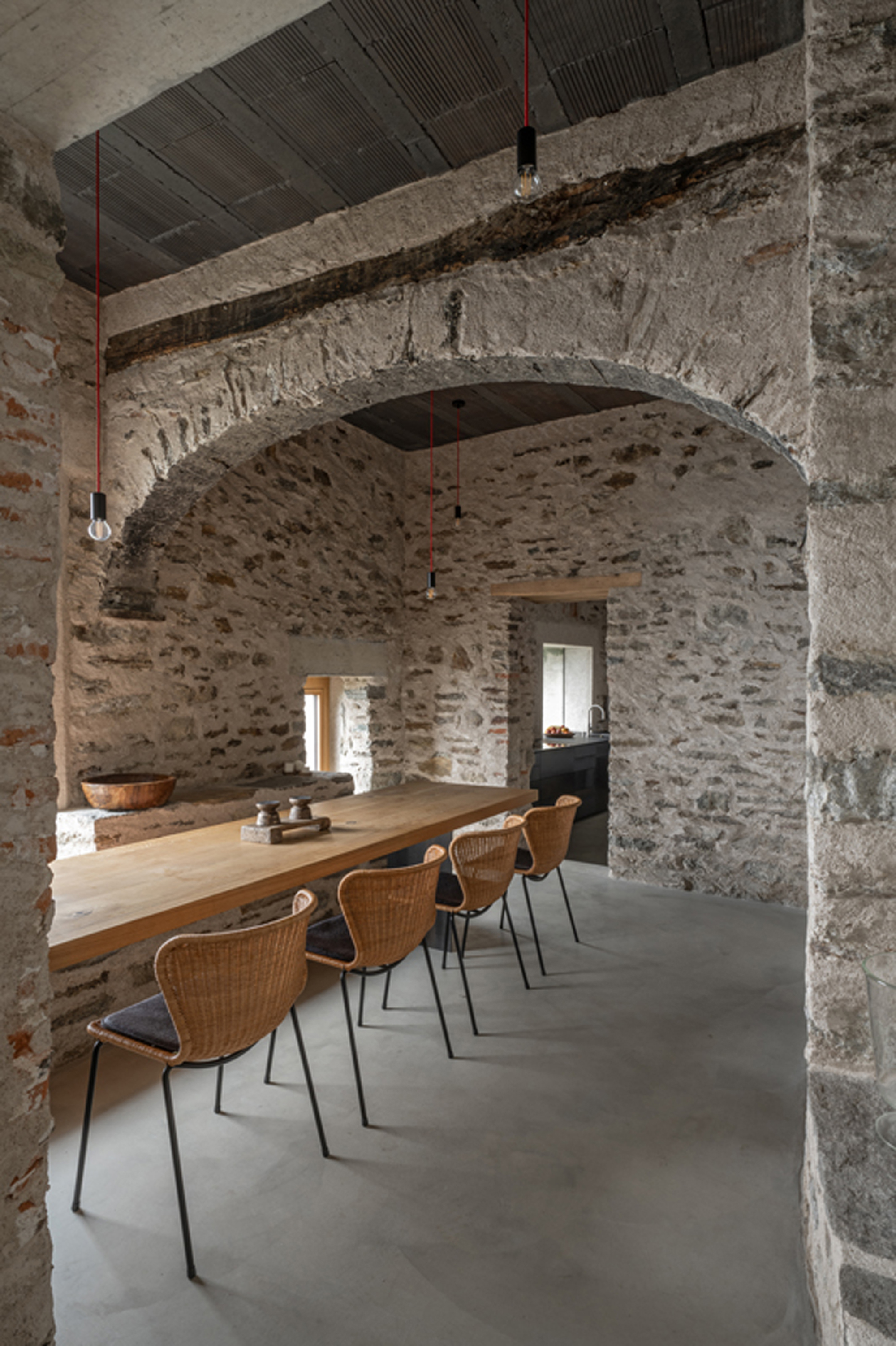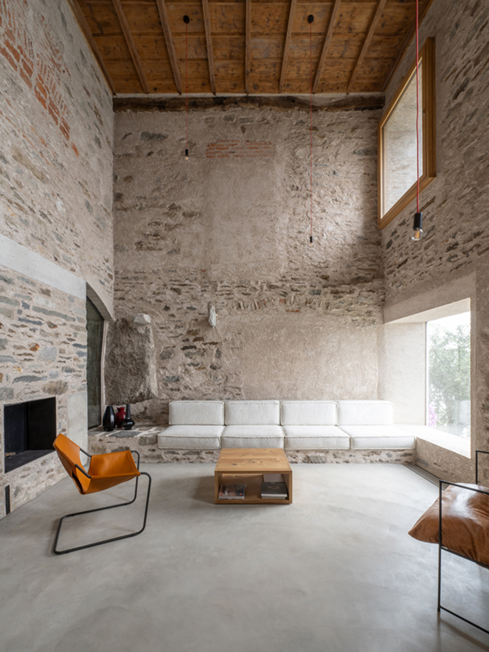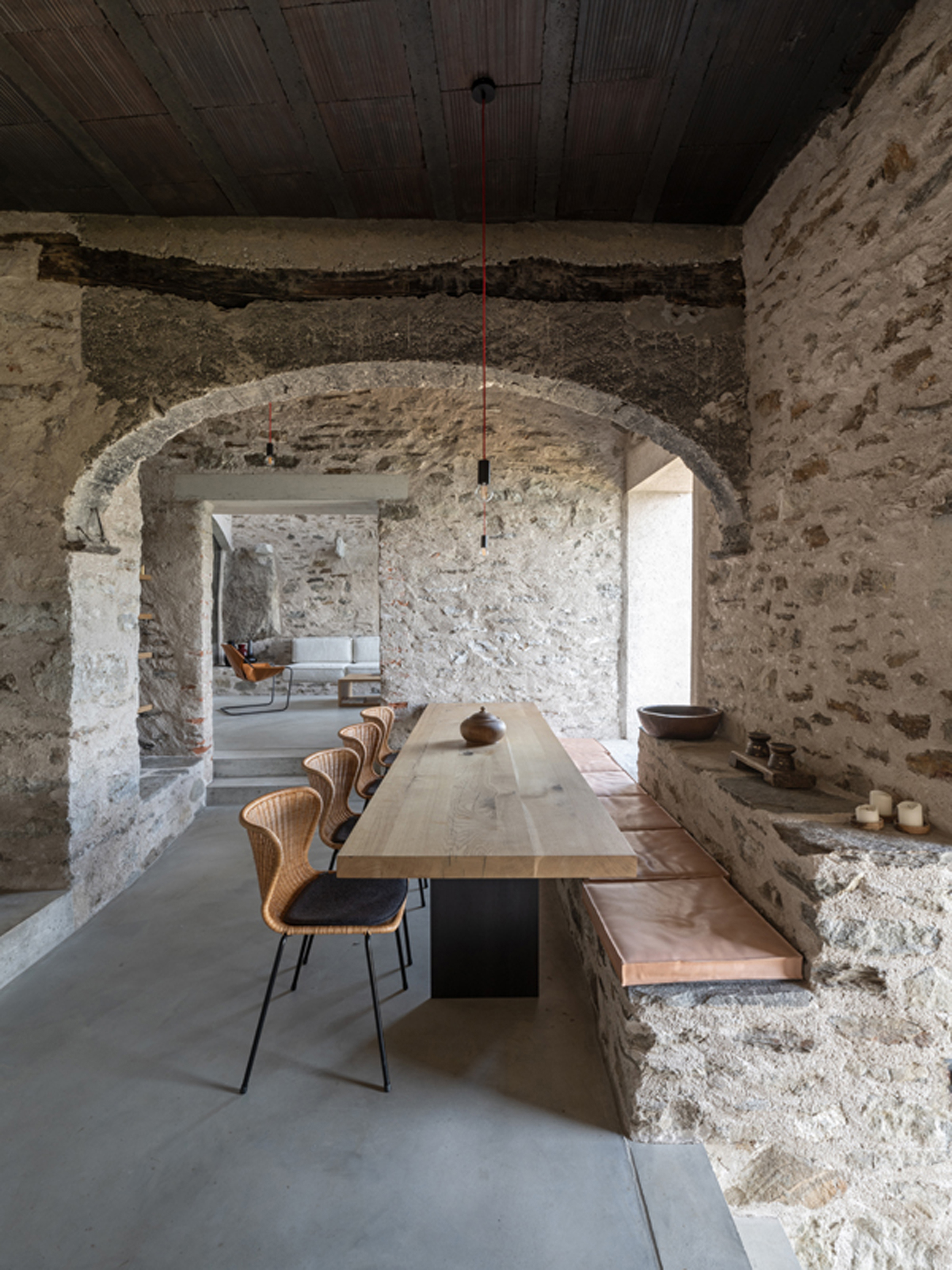 In the bathroom and in the staircase area on the upper floor, a visual connection to the very beautiful roof truss is created by removing the existing ceiling and installing a horizontal glazing. With these interventions, the roof truss can also be experienced on this floor. Whereas the window openings on the upper floors are essentially maintained, on the lowest floor (for the new living rooms and kitchen), three modern moderately dimensioned new openings offer better light and view. Two of these openings (kitchen and dining room) may have already been in the same place, they fit very naturally into the context. The non-historic plaster on all façades and on the old interior walls were removed and the natural stone walls underneath were exposed, only plastered partially, how it probably was originally and how as it is in many other houses in the village.
