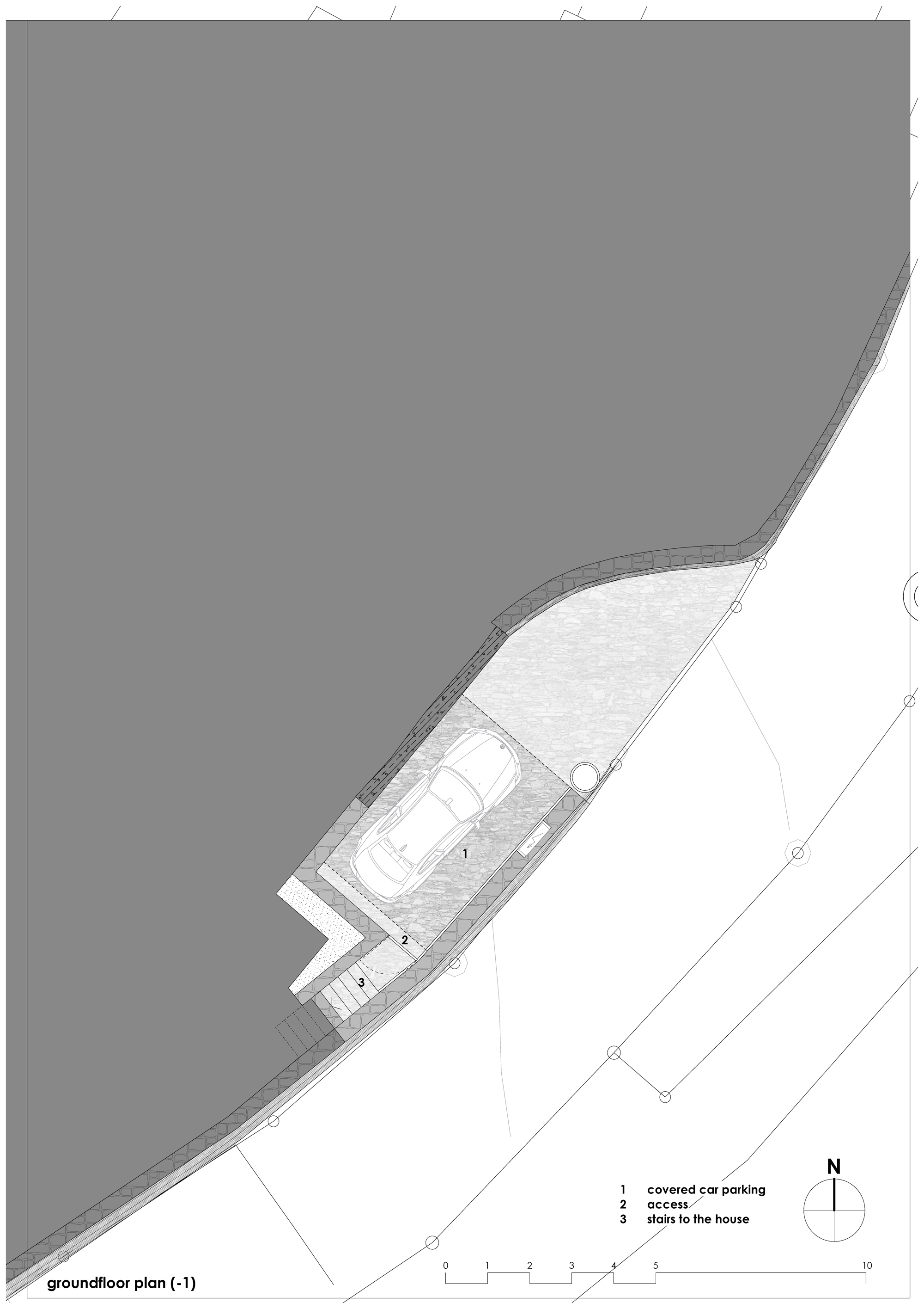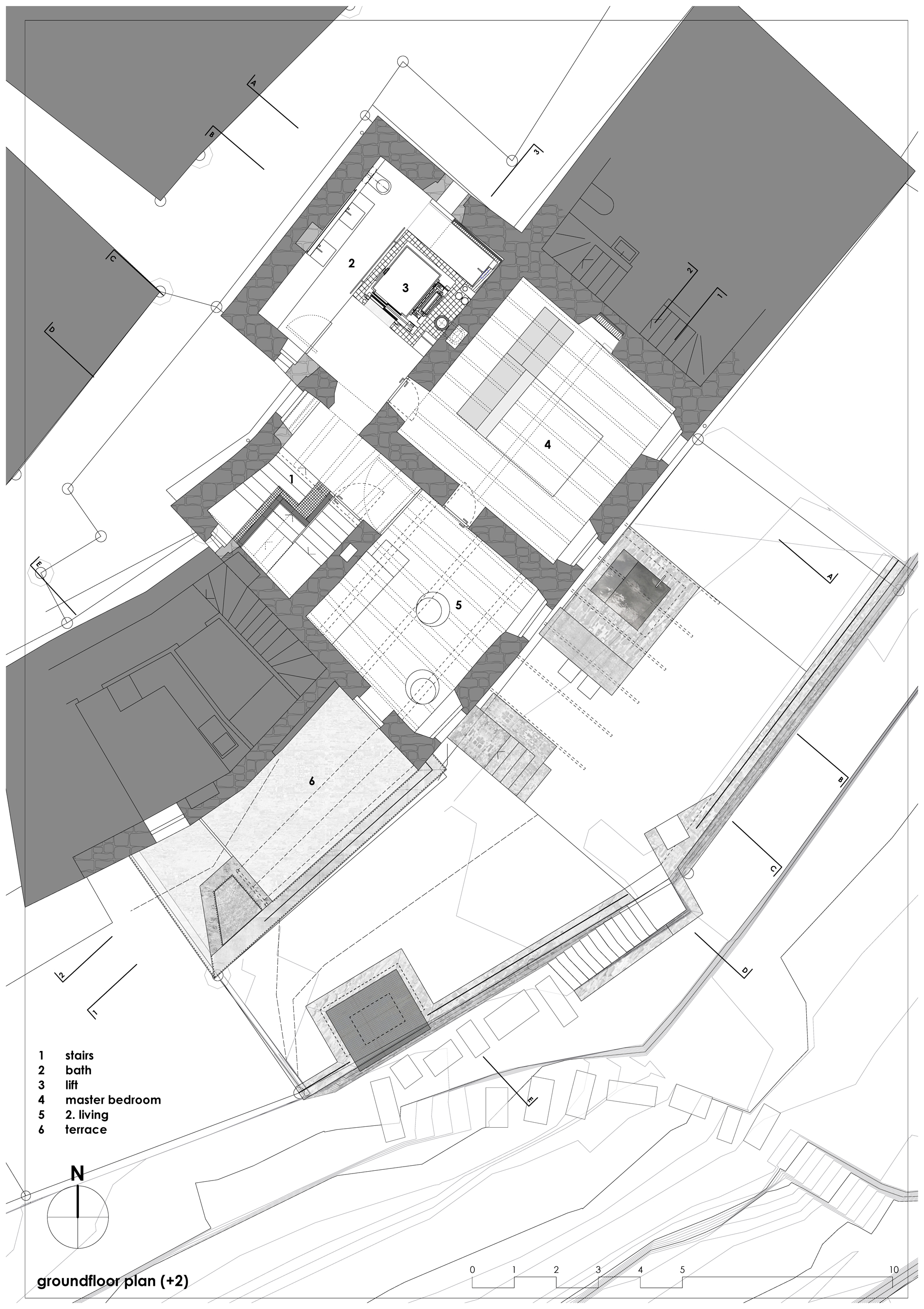 By moving the living room/dining room and kitchen to the basement, an immediate relationship to the garden is created, so that the inappropriate terrace on the upper floor can be removed. The creation of a 2-storey height in the living space generates an interesting spatial communication with the floors above and also optimal lighting with openings on different levels.