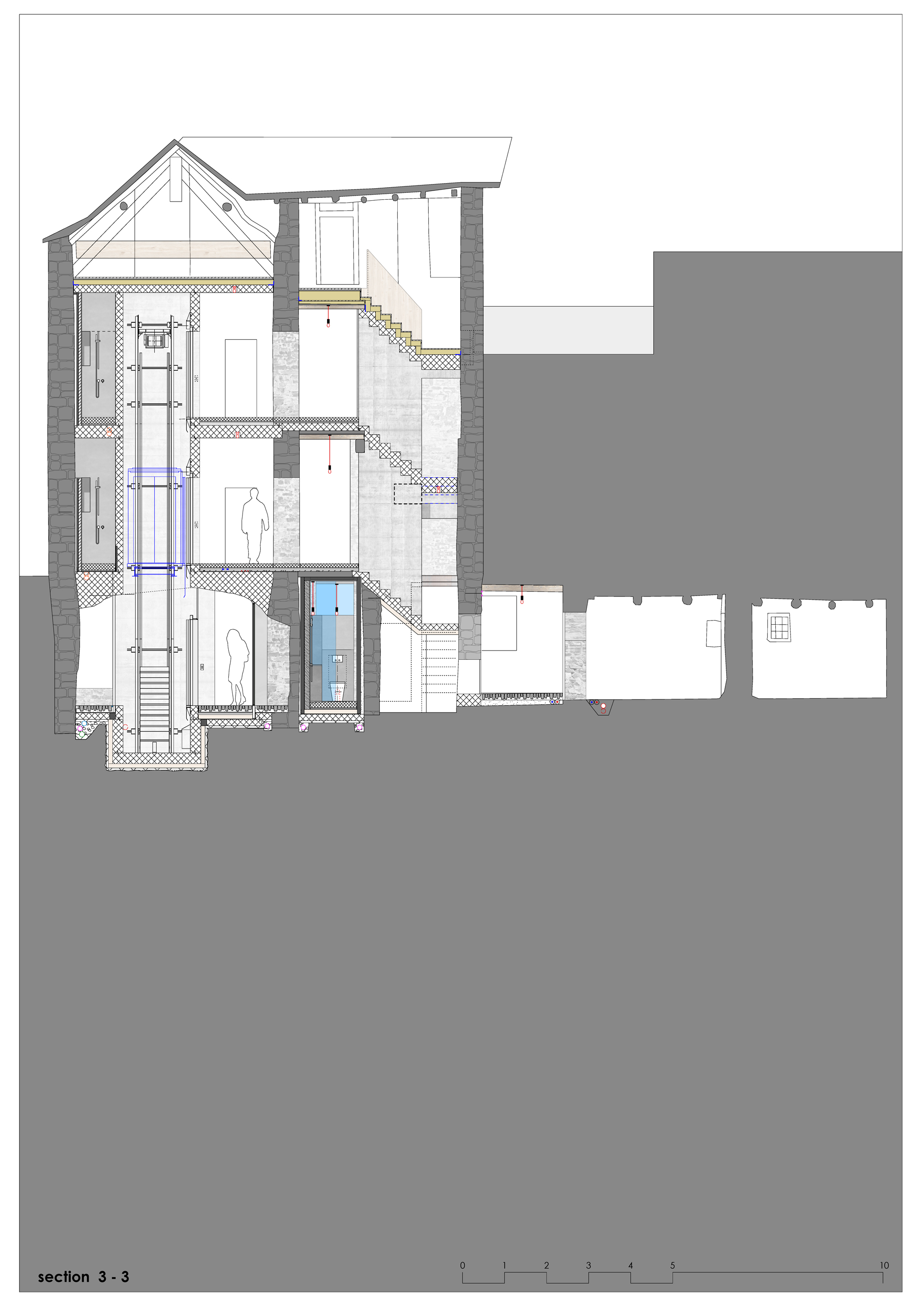 The new building elements such as windows, floors and walls, as well as the horizontal ceiling against the cold roof truss correspondent the current energy standards. All intermediate floors are preserved and the old wooden beams were exposed. The vaulted ceiling in the basement has been replaced by a concrete ceiling, because of the integration of the new lift.