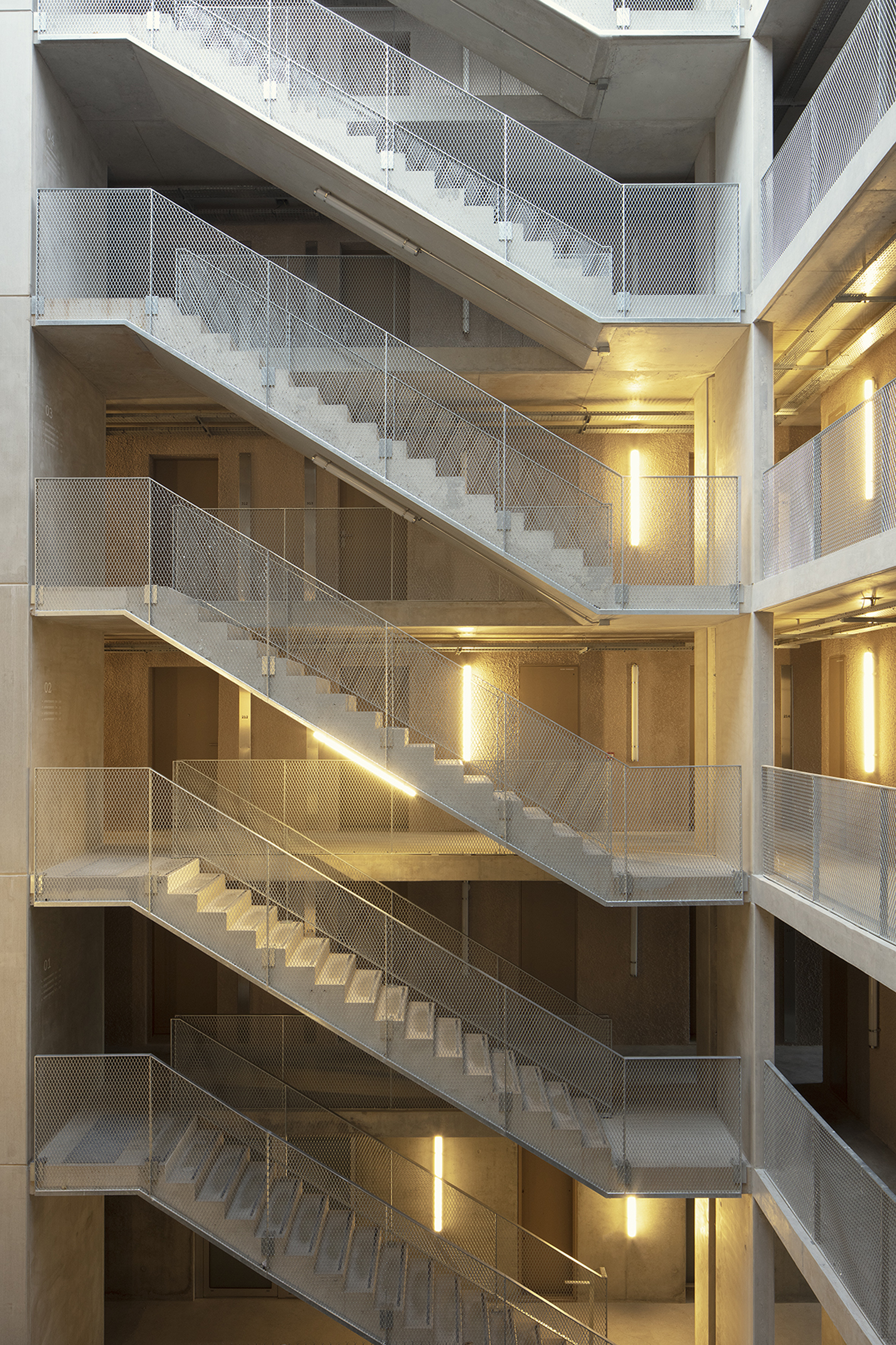 The natural light is subdued and soft, encouraging the use of the stairs and wide landings. They could become places for neighbors to meet and share, supporting varied and inventive uses.