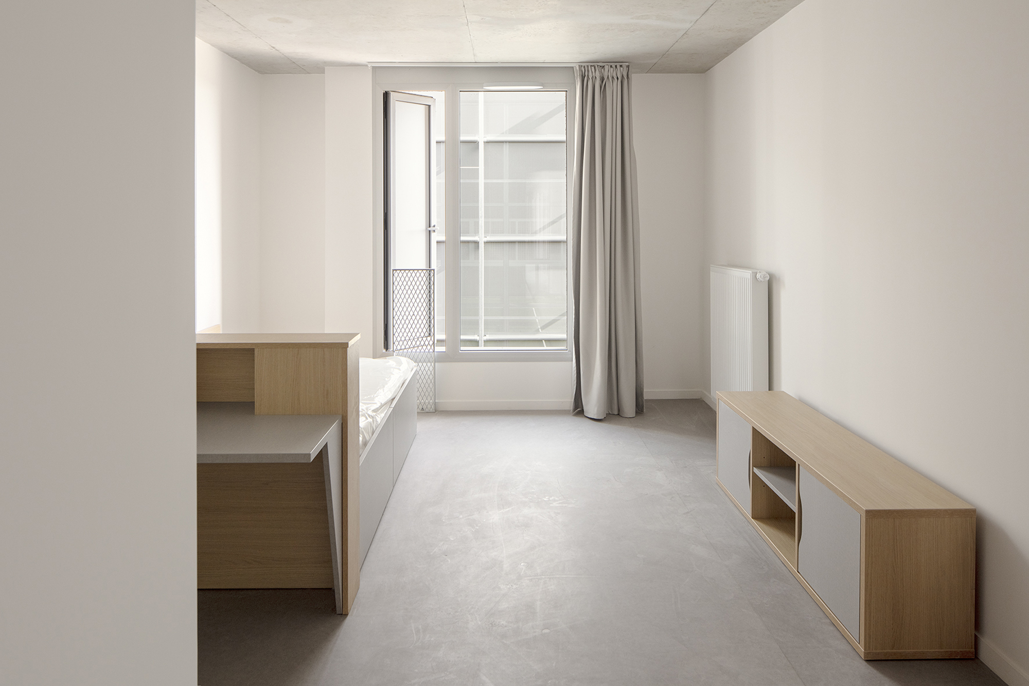 The rooms are therefore through and open both towards the street and towards the planted and shaded patio. It constitutes a real island of freshness for the benefit of students.