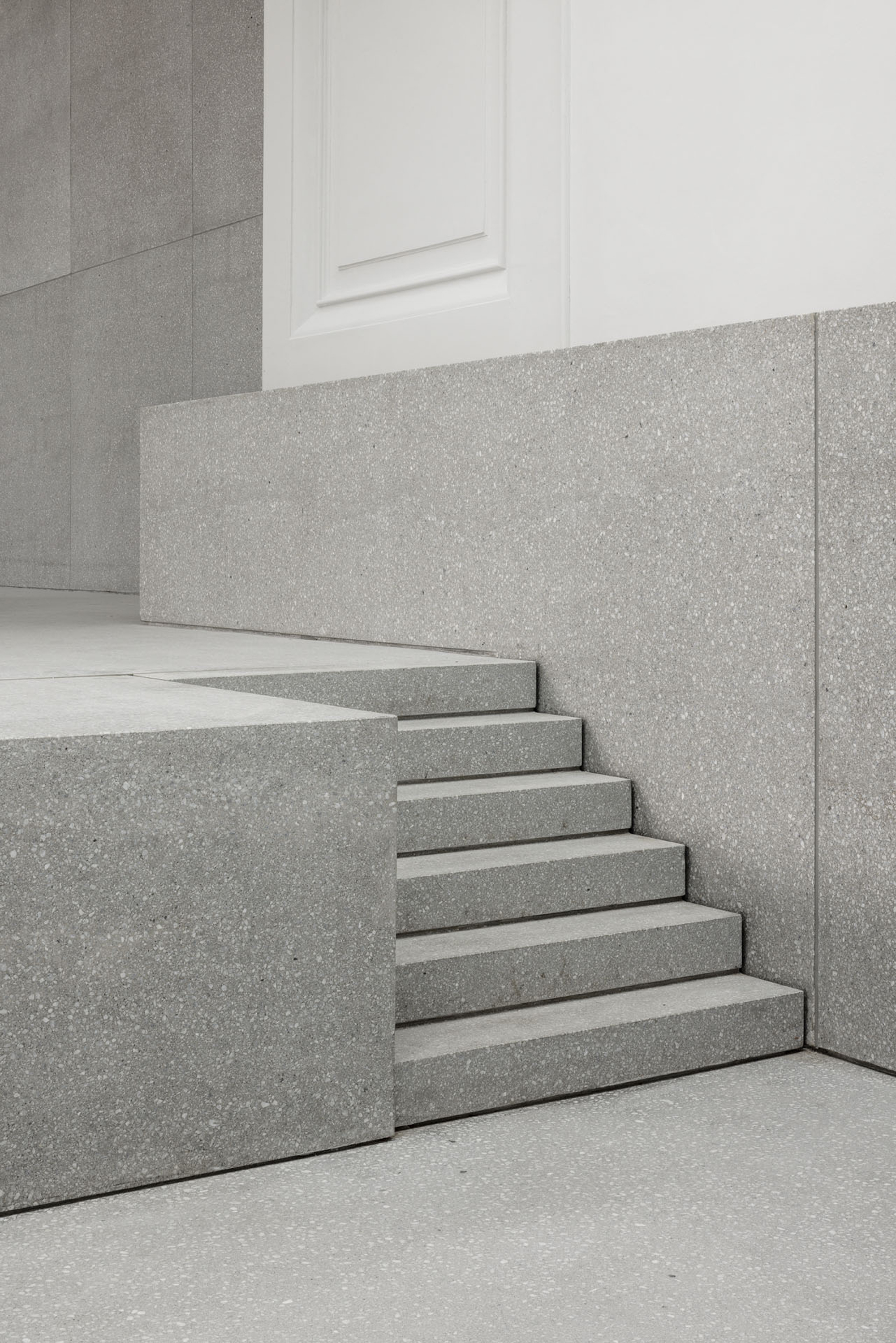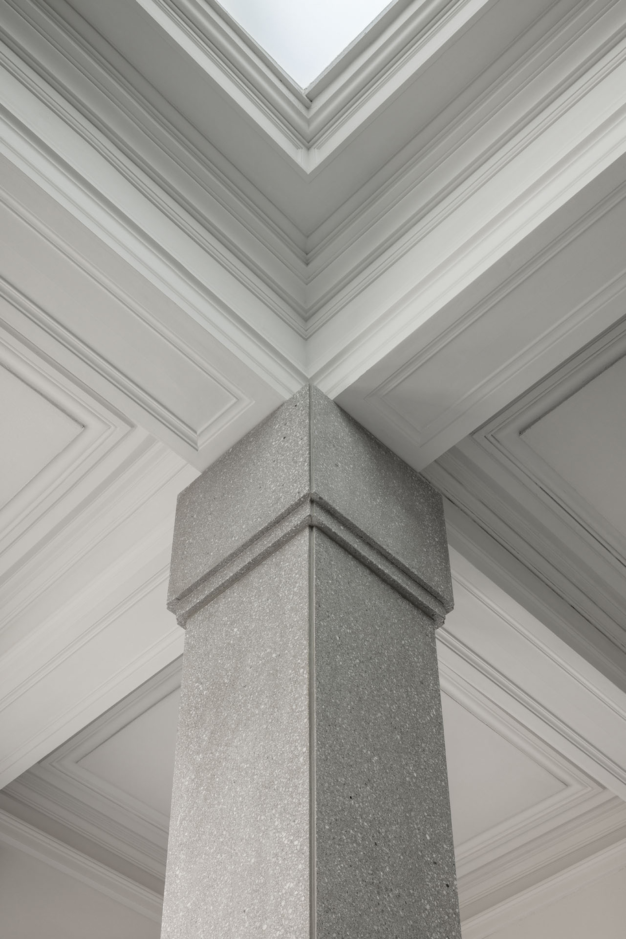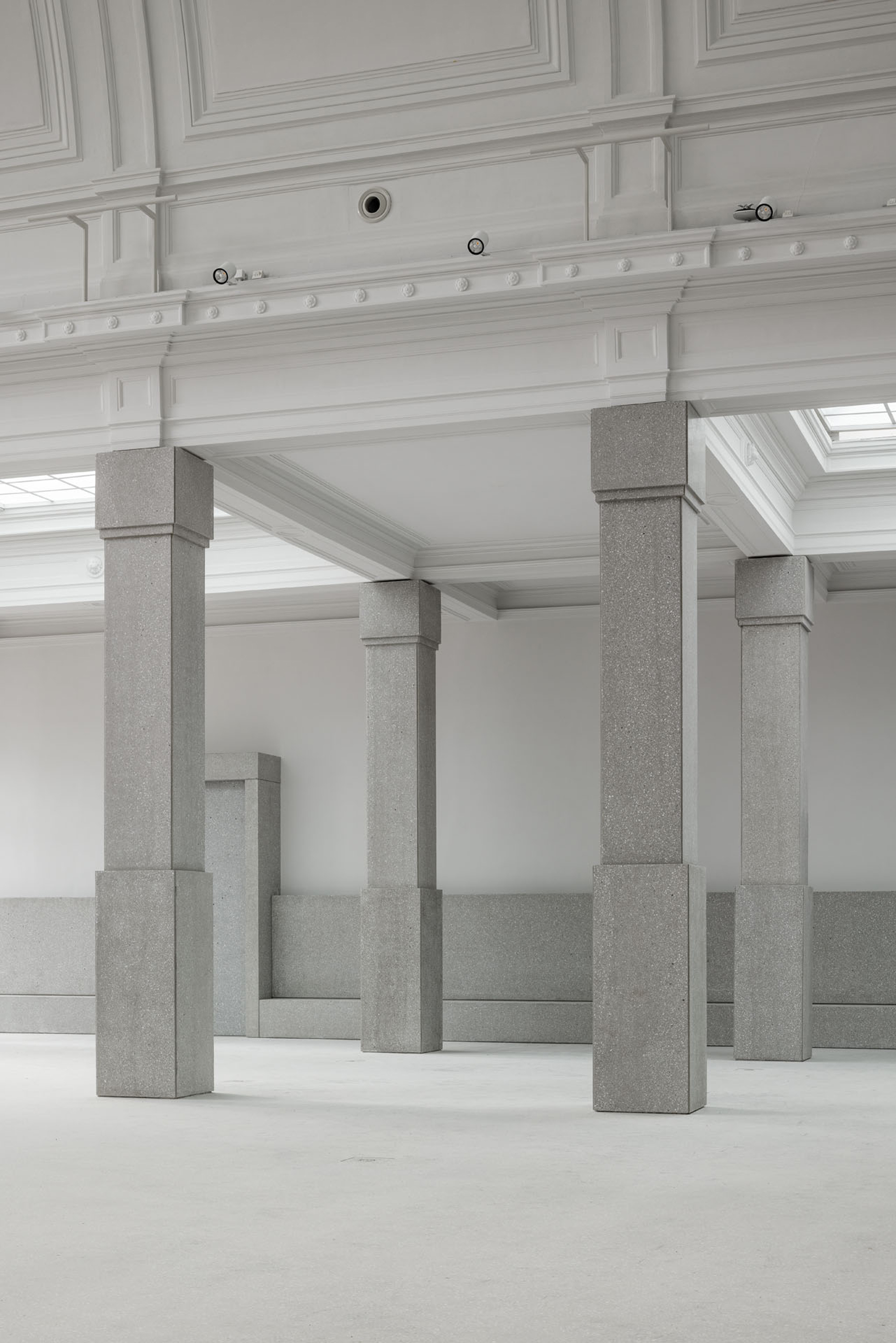 An attempt to further develop the original classicist idea was also made in the design of the interior. The suspended ceiling of the night club was removed, and the remaining stucco ceiling was exposed and extensively renovated. Since all the plaster ornaments below the ceiling had been chipped off in the 1970s and little information was available about the historic interior, it was decided not to reconstruct it. Instead, we combined the historic ceiling with a new interior in terrazzo which underlines clearly the historical transformation processes. This is an attempt to realise a new interpretation of a classicist hall with contemporary means. The floor, made of seamless terrazzo, forms a solid base. The existing wooden columns were covered with handmade terrazzo elements. Their abstracted cubic capitals appear traditional and contemporary at the same time. One accesses the hall through 4 m high double terrazzo doors, combined with terrazzo benches which backs also serve as wall cladding. These elements create a solemn setting and a visual reinforcement of the edges. The hall was also in need of acoustic renovation. This was achieved by integrating absorbent surfaces into the historic stucco ceiling on the one hand. A central sound screen was positioned on the podium on the other, both made of terrazzo. All technical elements, such as the ventilation system, smoke extraction, auditorium lighting and theatre technology, were integrated as carefully as possible into the historic spatial concept. The result is a very robust and elegant interior that radiates both historical continuity and time-boundness.