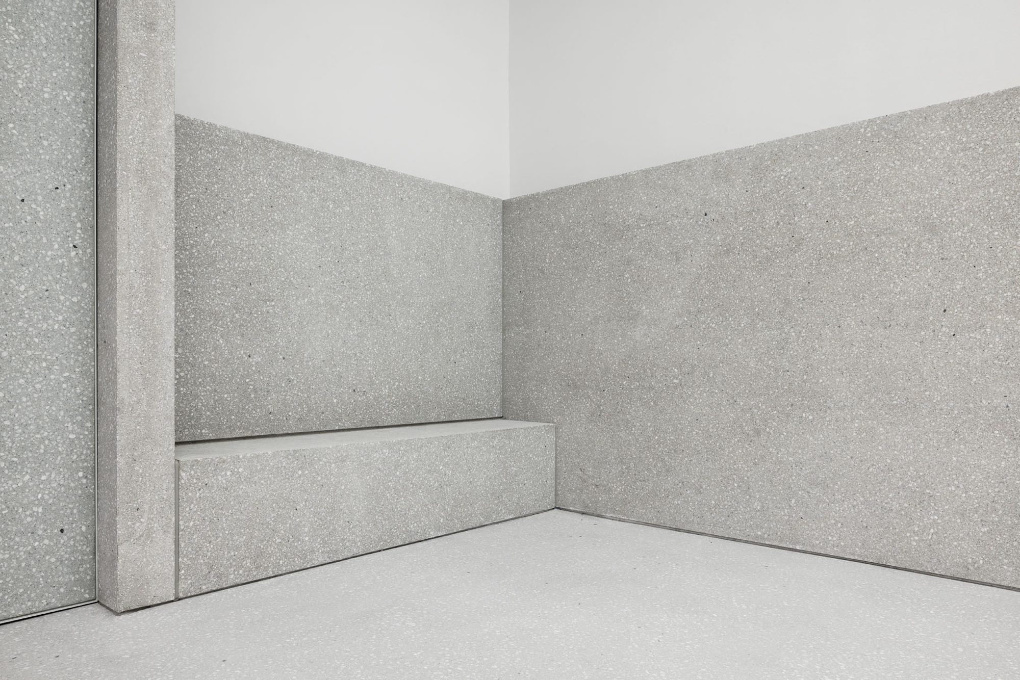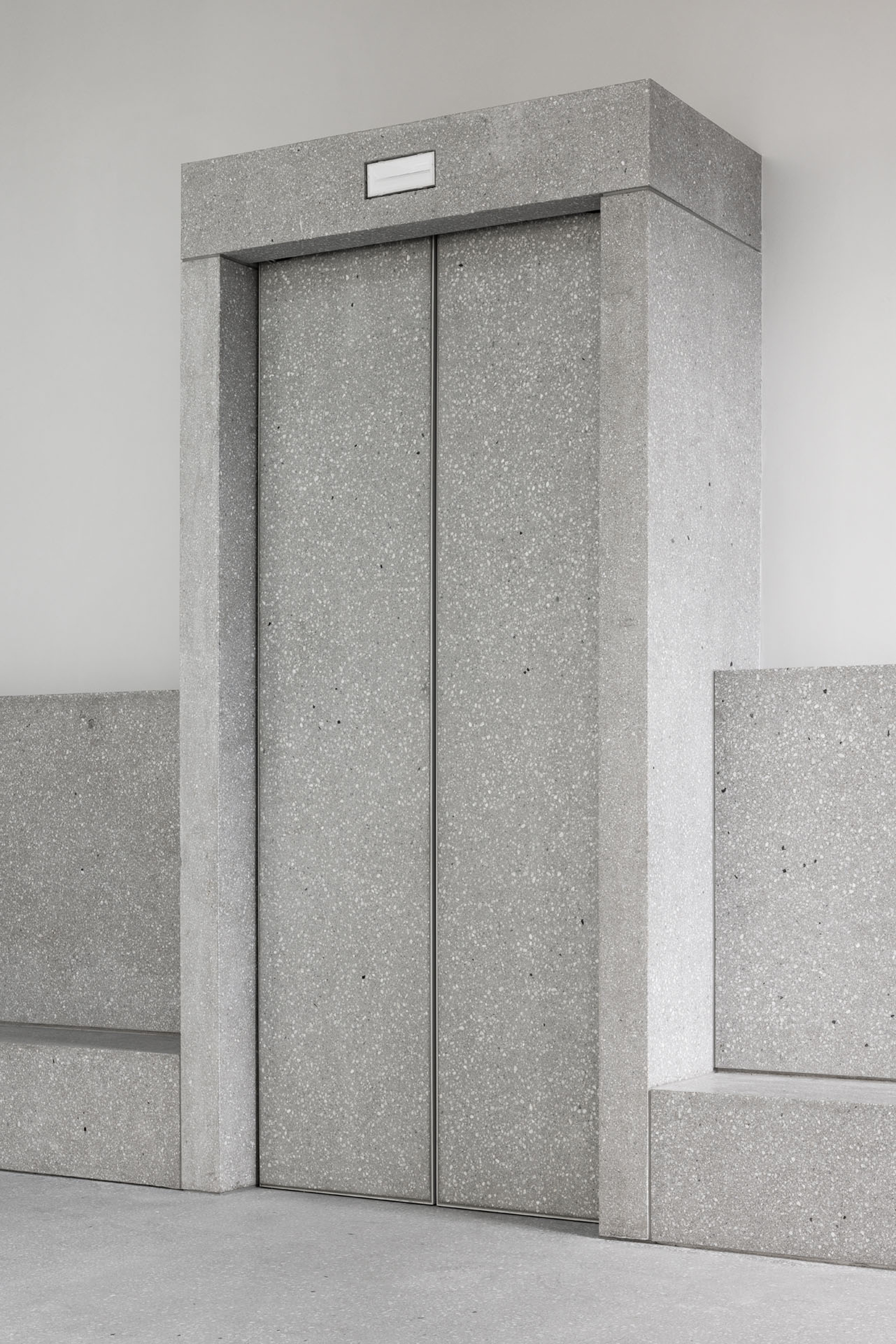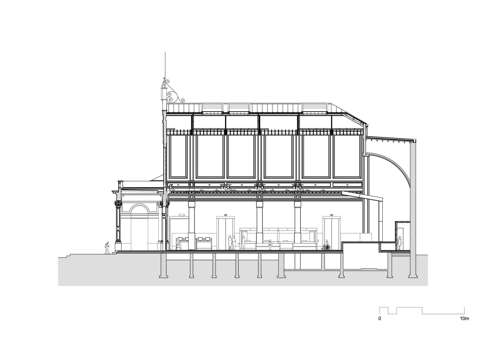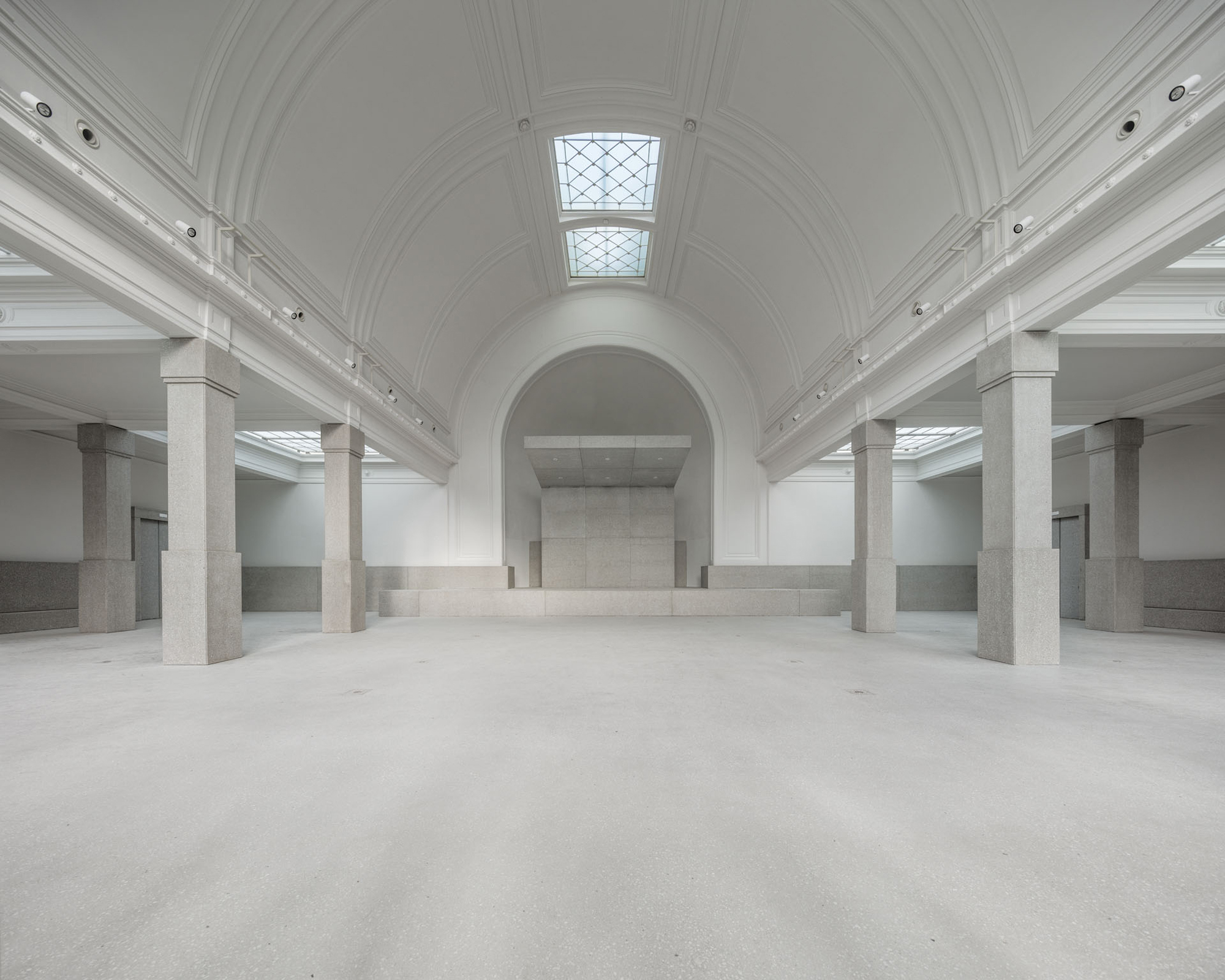 An attempt to further develop the original classicist idea was also made in the design of the interior. The suspended ceiling of the night club was removed, and the remaining stucco ceiling was exposed and extensively renovated. Since all the plaster ornaments below the ceiling had been chipped off in the 1970s and little information was available about the historic interior, it was decided not to reconstruct it. Instead, we combined the historic ceiling with a new interior in terrazzo which underlines clearly the historical transformation processes. This is an attempt to realise a new interpretation of a classicist hall with contemporary means. The floor, made of seamless terrazzo, forms a solid base. The existing wooden columns were covered with handmade terrazzo elements. Their abstracted cubic capitals appear traditional and contemporary at the same time. One accesses the hall through 4 m high double terrazzo doors, combined with terrazzo benches which backs also serve as wall cladding. These elements create a solemn setting and a visual reinforcement of the edges. The hall was also in need of acoustic renovation. This was achieved by integrating absorbent surfaces into the historic stucco ceiling on the one hand. A central sound screen was positioned on the podium on the other, both made of terrazzo. All technical elements, such as the ventilation system, smoke extraction, auditorium lighting and theatre technology, were integrated as carefully as possible into the historic spatial concept. The result is a very robust and elegant interior that radiates both historical continuity and time-boundness.