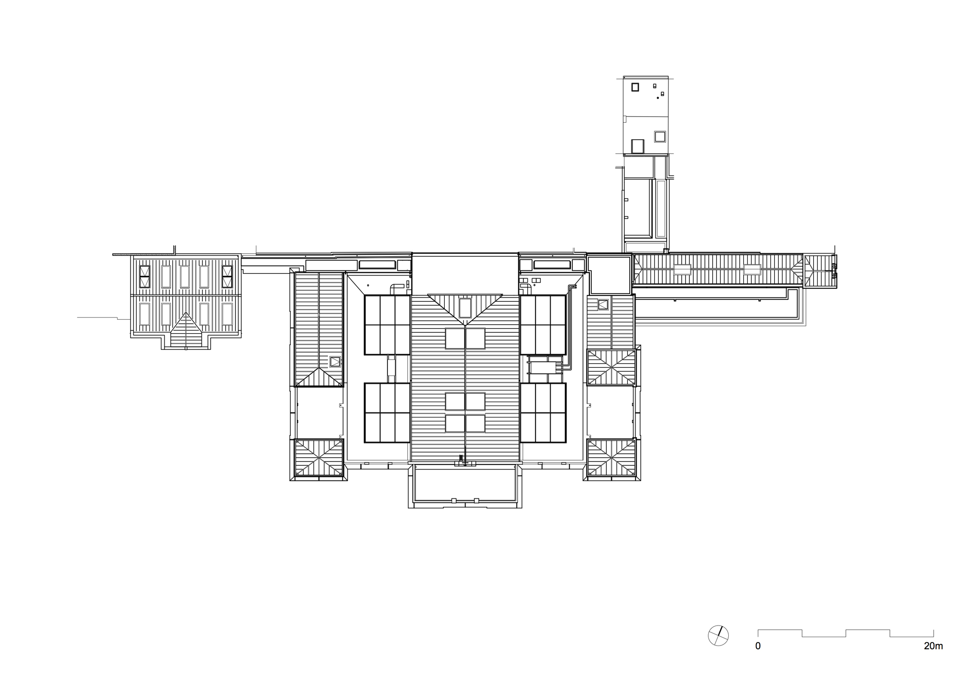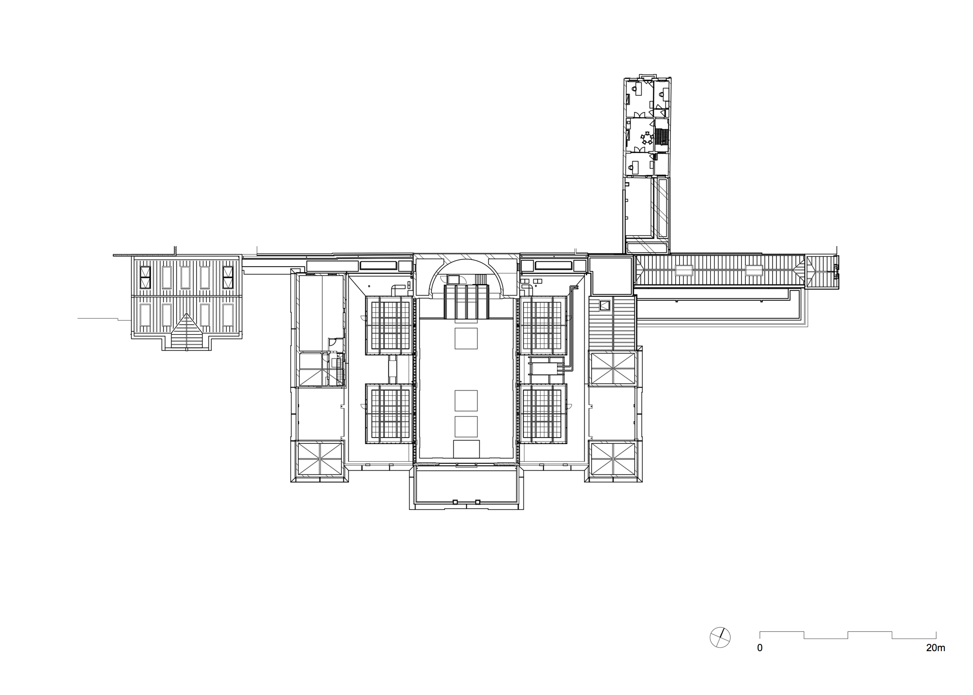 In order to connect the different buildings within the project into a new organism, the first step was to find a sensible overall organisation for the new complex. On the north side of the concert hall, an access structure was erected that effectively connects all functional areas with each other and enables their access to disabled people. This new west-east axis allows the historic complex to be divided into very different functional zones such as café, individual offices, landscape offices and meeting rooms. All the necessary ancillary rooms were also organised along this corridor in order to free the historic spaces as much as possible from new functional constraints. Architecturally, the connecting structure is only partially visible: between the Orangery and the Concert Hall as a new covered entrance hall, and on the east side of the complex as a conference pavilion. The connecting building forms a small, green courtyard towards the historic town house. The new development enabled a sensible reprogramming of the building complex and laid an important basis for a high-quality restoration of the historic interiors.