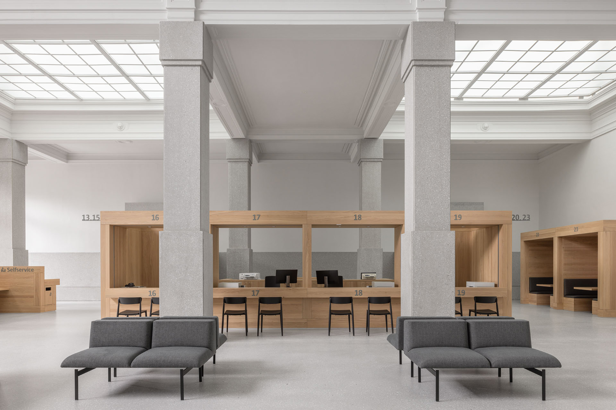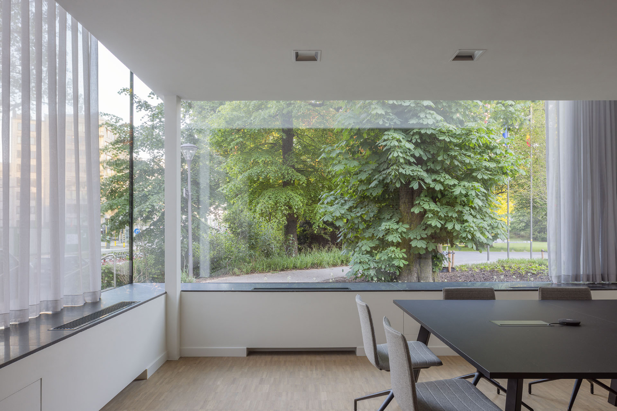 A citizen service centre requires specific furniture. Service points, conversation booths and counters for citizens meetings had to be added to the interior. Fitted furniture in light oak wood was designed in order to fit the classical style of the hall. The workstations can be locked in case needed, during concert use for instance. Some of these furnishing elements as well as the additionally required benches can be easily moved. The other rooms within the complex were designed with oak floors and combined with as restrained as possible furniture and curtains in order to emphasise the spatial effect and interaction with the outside space.