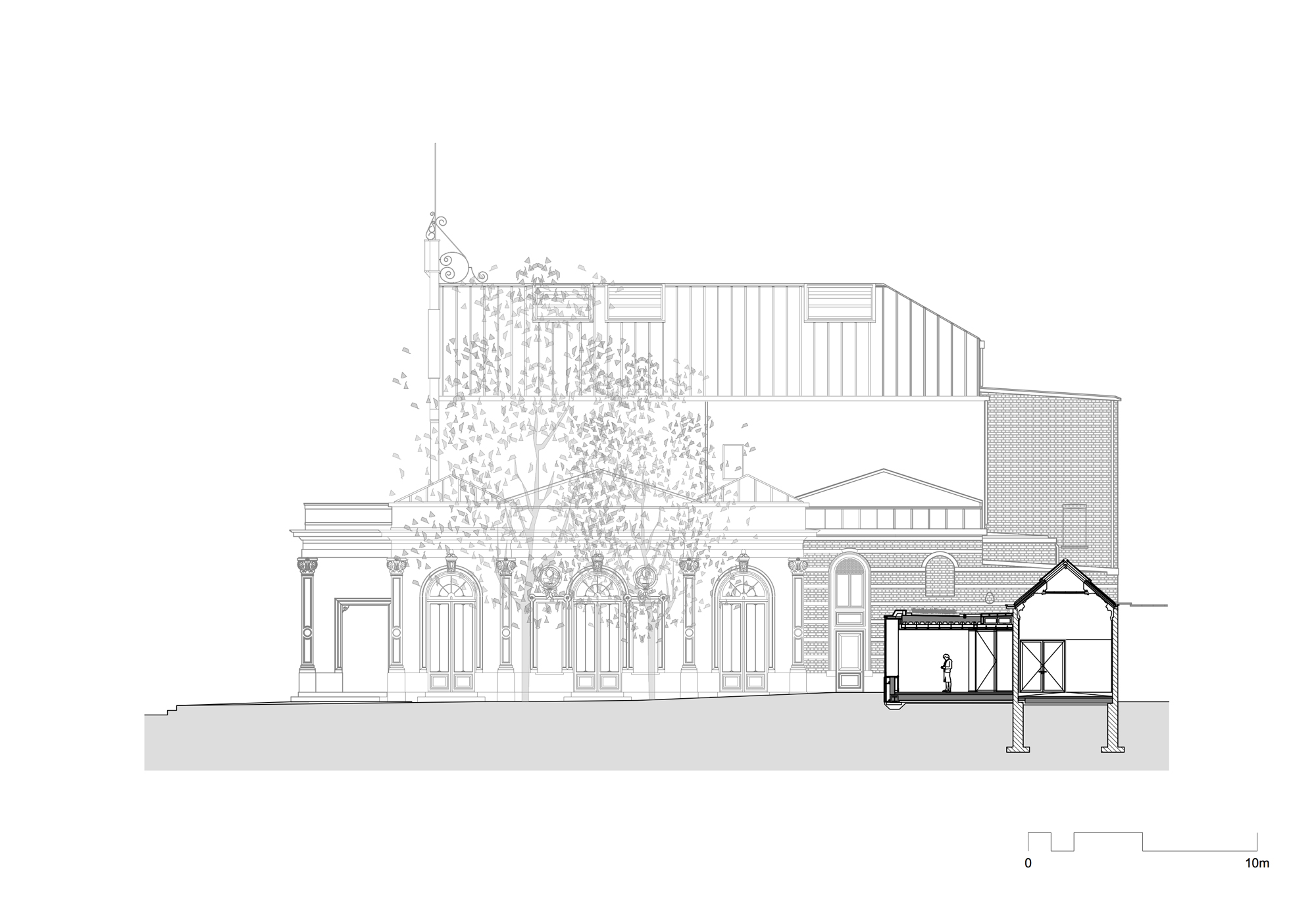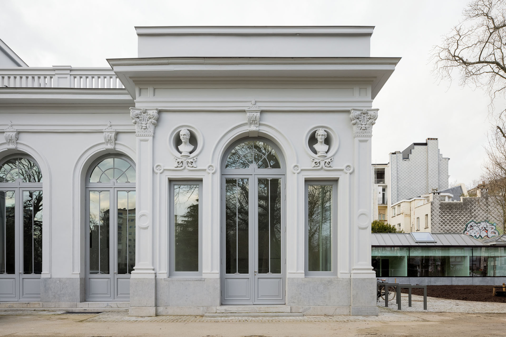 “De Harmonie” is the former summer concert hall of the music society “Société Royale d’Harmonie”, founded in 1814. The original project at the present location was the result of an architectural competition won in 1844 by the then 25-year-old Pieter Dens. In 1846, after only two years of planning and construction, the banqueting hall and its large private landscape garden were opened. The neo-classical building was characterised by a flowing relationship between the interior and exterior spaces, and also served as a festive setting for outdoor concerts. In 1890, the building was substantially rebuilt, doubling its volume. The reconstruction was characterised by a very indecisive fin de siècle design and rather poorly executed. From the beginning of the 20th century, there was a creeping decline in the concert business, which was exacerbated by the outbreak of the First World War. The garden and building were in 1922 transferred to the city. The landscaped garden was redesigned as a public park, and the concert house was used primarily as a flexible exhibition hall. After a chequered history of more than 50 years, the house was converted into a night club in 1977-1979. In an act of self-negation, the remaining historic interior was covered by acoustic suspended ceilings and partially knocked down, all façades were barricaded and the fluid relationship to the outdoor space was destroyed. The open call of 2010 offered the opportunity for a fundamental re-examination of the over 170-year-old ensemble “De Harmonie”. The existing building and outdoor space structures could be reinterpreted. On the one hand, it was necessary to determine how to proceed with the monumental ensemble and to what extent the complex should be restored. On the other hand, a multitude of functional, social and ecological wishes had to be integrated into the design in order to adapt the existing structures to new needs. After a process of more than eleven years long, the project was completed in 2021.