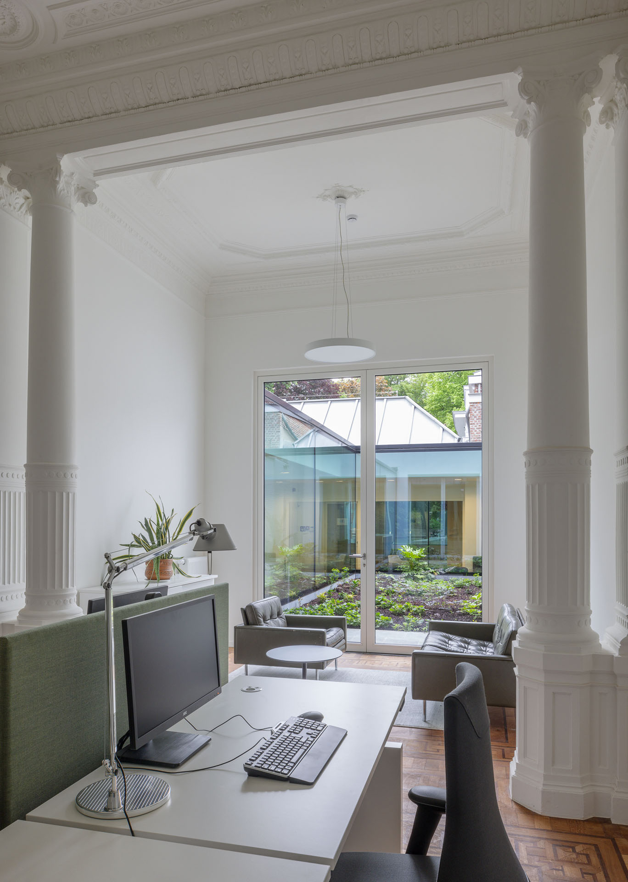 The project “De Harmonie” is a complex urban redevelopment project for the city of Antwerp. As a new public space and urban infrastructure, it takes on important tasks within the city centre and tries to serve the needs of the citizens in the best possible way. The project consists on the one hand in the redesign of the historic park De Harmonie, the restoration of the Peter Benoit fountain and the activation of the park. On the other hand, the existing concert hall “De Harmonie” has been converted into a new district centre with a large number of offices for the local authority, a large citizen service centre and an event space for small concerts, among other things. To make this possible, the concert hall is connected to an existing town house as well as the Orangerie, also a historic building, and extended with a small meeting centre. Originally the project was an answer to the Flemish Government Architect open call of 2010, aiming to convert the concert house into a “Silent Room” – a non-confessional celebration hall. In 2013, due to local government shift, it was decided to develop the house as a district centre.