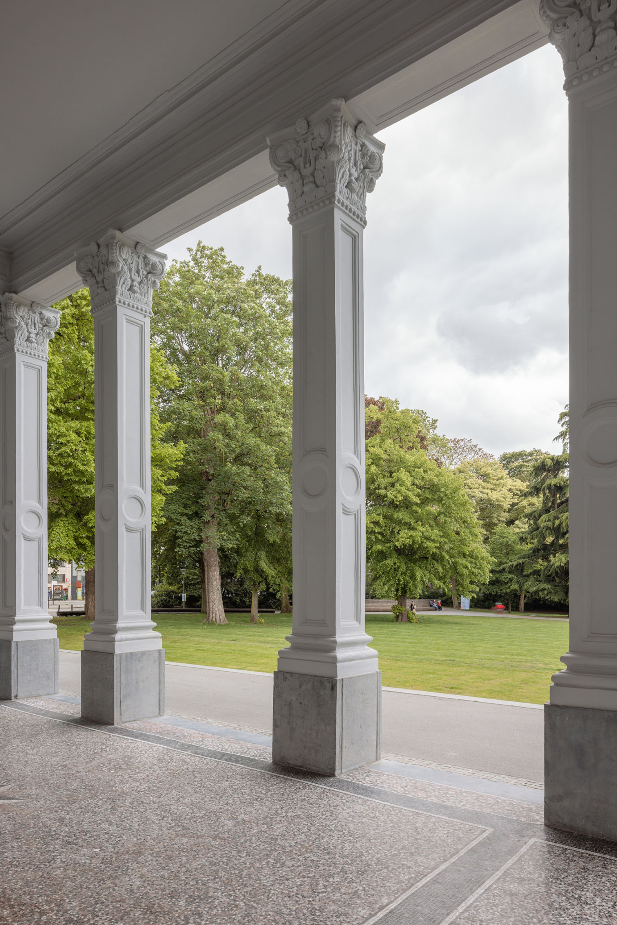 The starting point for the project was to make the original classicist character of the concert hall as much as possible visible again. After consultation with the monument conservation authorities and with the setting of a good foundation in mind, the demolition of a glass pergola from 1890 located directly in front of the main façade was decided. This cleared the volume structure of the building. The lost balustrades on the flat roof were reconstructed in a simplified form. The roofs were insulated and covered with zinc sheeting and new skylights were integrated. The upper side facades of the hall were also insulated. The classic mass effect was streamlined by removing the historic shingle façade and replacing it with a plaster one. Since the original windows had largely been lost we achieved, an abstracted neoclassical reinterpretation of the facade by placing 4 m high double glazed doors. All busts were carefully cleaned, lost ornaments – when it was sensible within the overall idea – were reconstructed. The colour scheme was based on a classicist colour spectrum. Light grey plaster and medium grey windows were combined with the existing dark grey limestone plinth made of “Belgian granite”. This way the building does not create a glare effect in the park but blends discreetly into the somewhat grey Flemish sky. The new glass access structure blends naturally into the new overall composition.