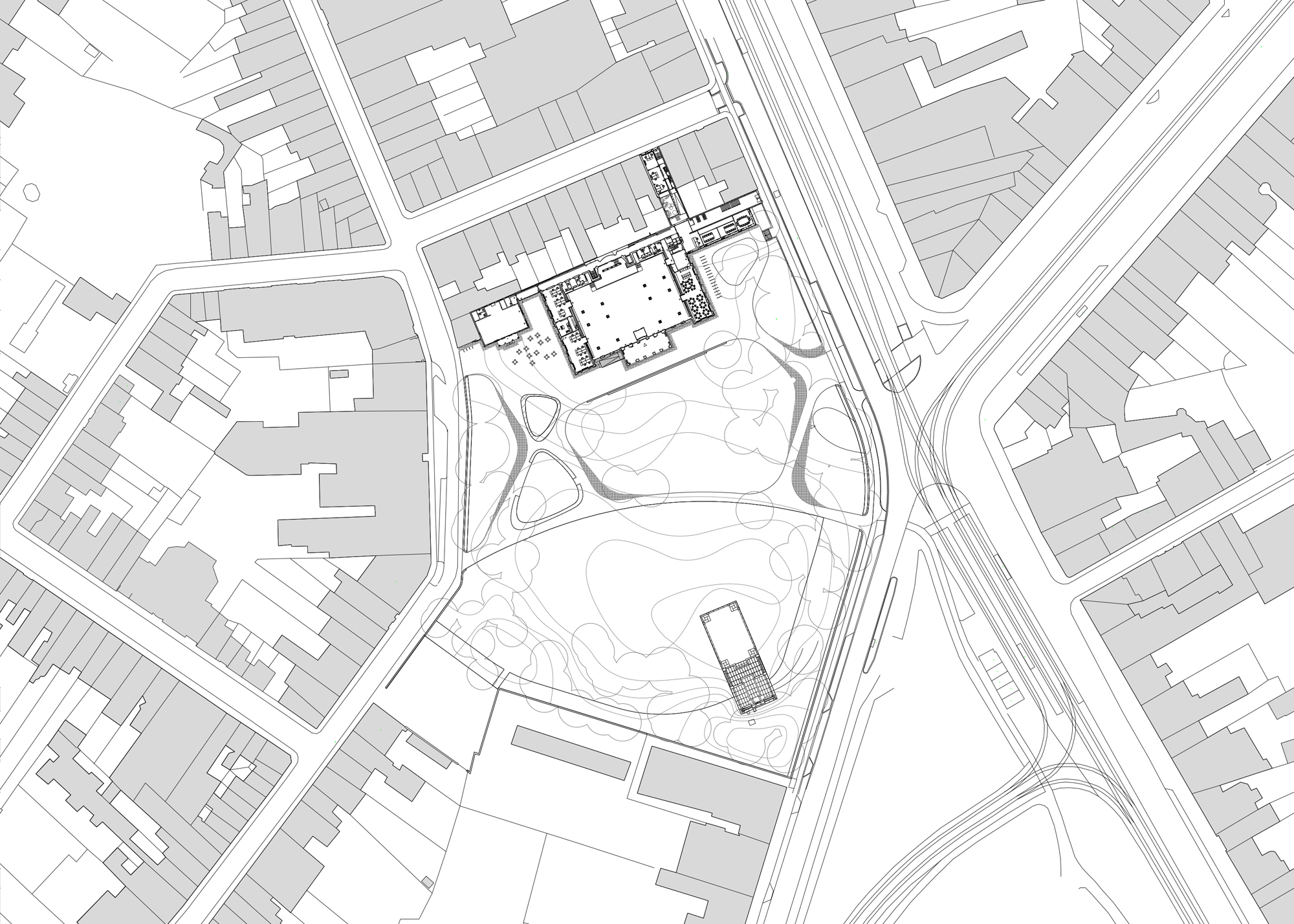 The starting point for the design consisted in the restoration and redesign of the existing park according to the model of an English landscape garden. A number of large trees were felled in the park, shrubs and fences were removed in order to offer more open play and movement areas and to strengthen the spatial sight lines. At the same time, the edges of the park were planted more intensively to create safety and intimacy. It also visually hides the surrounding streets, some of which are very busy. The existing network of paths was completely removed in order to offer as much unsealed space as possible. A new, more meandering figure of narrow paths was created within the park and emphasized by long curved benches. At the same time, the desired play areas for small children were integrated in a natural way within the path figure. The terrain profile was lowered in the area of the former concert house to create an additional natural stone threshold between the park and the building. It visually anchors the house firmly within the landscape and enhances its monumental effect. At the same time, the house was opened up towards the park to restore the flowing relationship between inside and outside. The orangerie with its impressive open roof structure, has been restored and converted into a café, providing a pleasant revival. In the park lays the Peter Benoit Fountain by Henry van der Velde from 1934. The redesigned contemplative city park forms an intensively used green oasis and invites a variety of social activities.