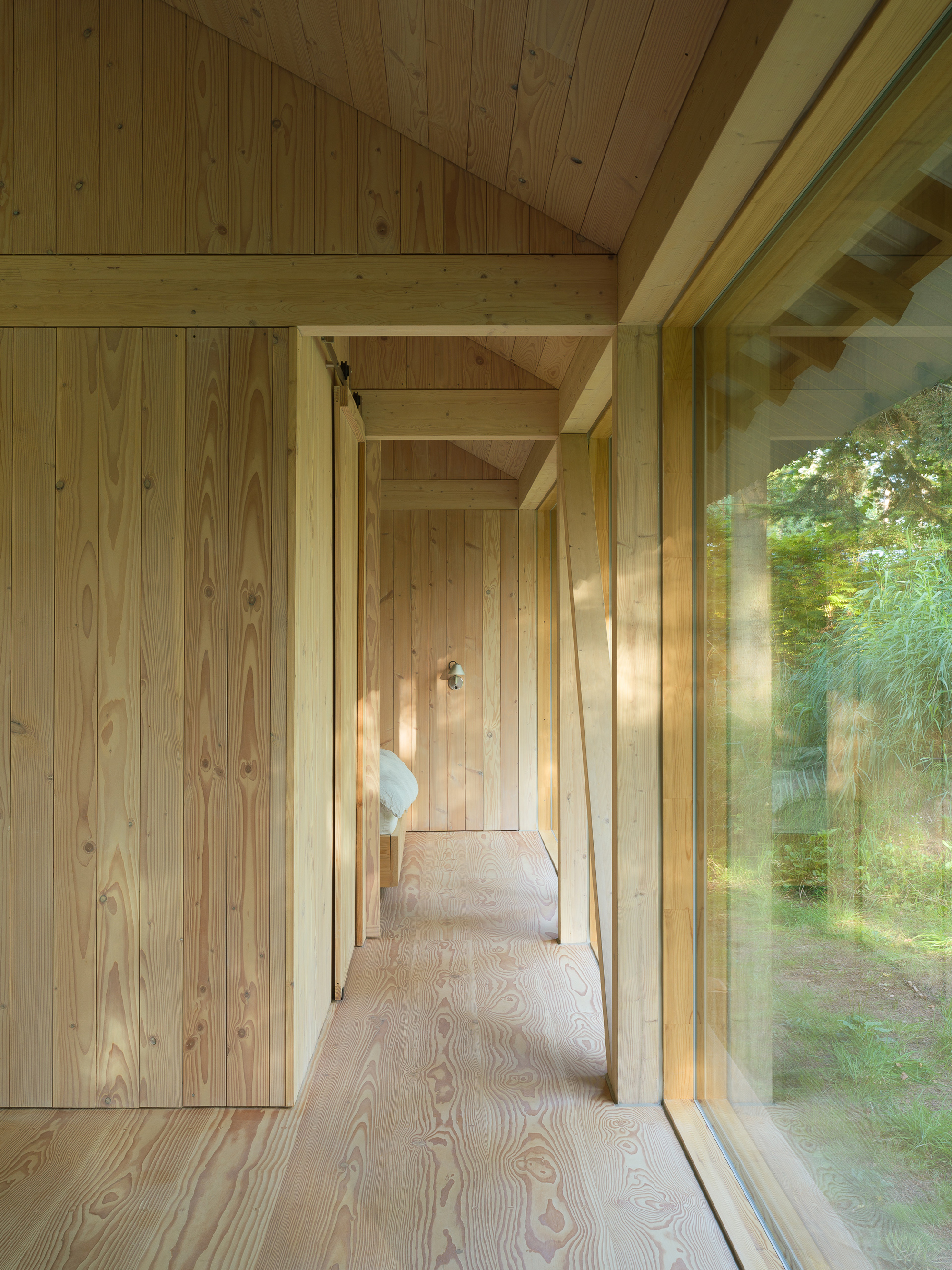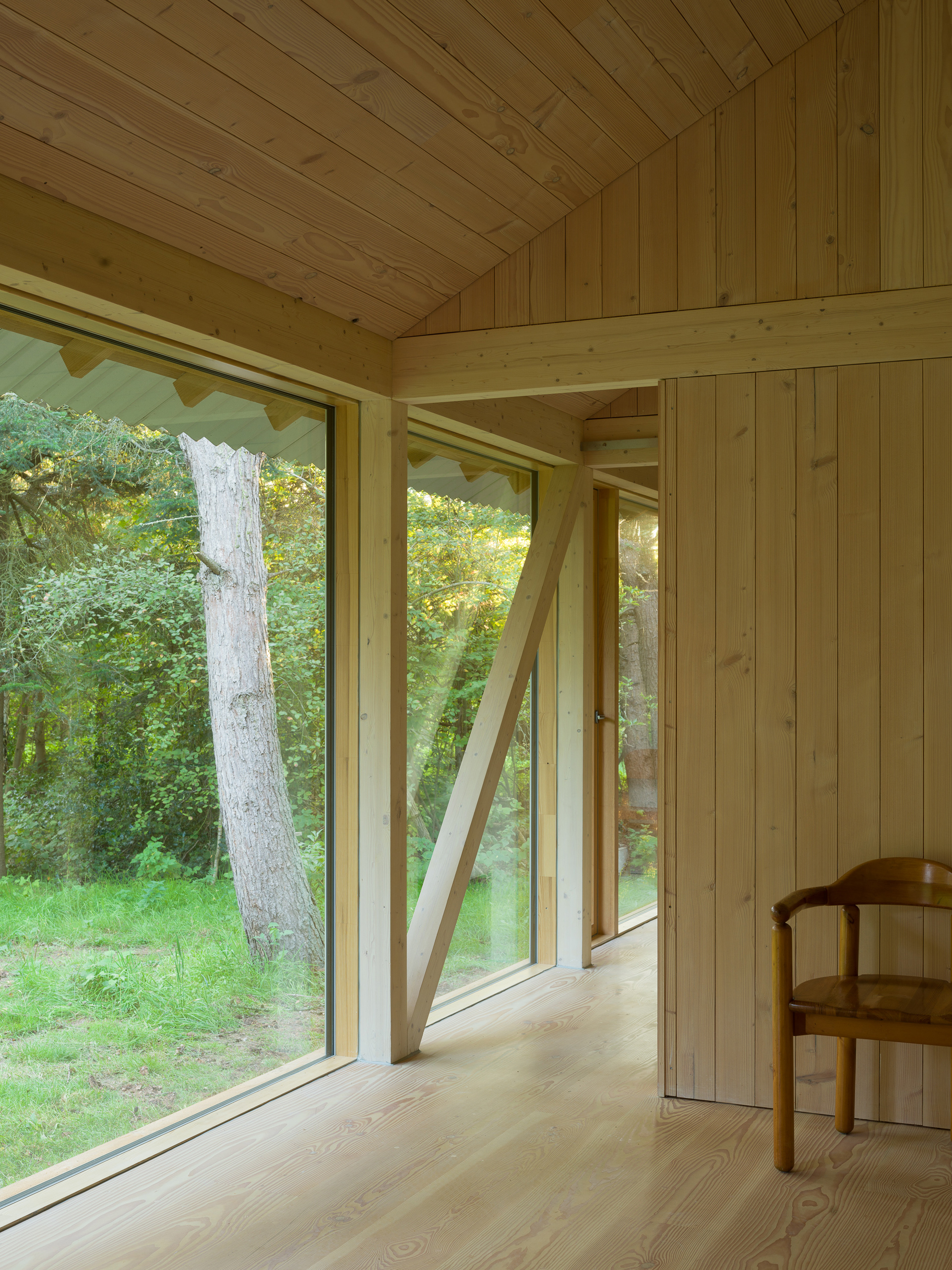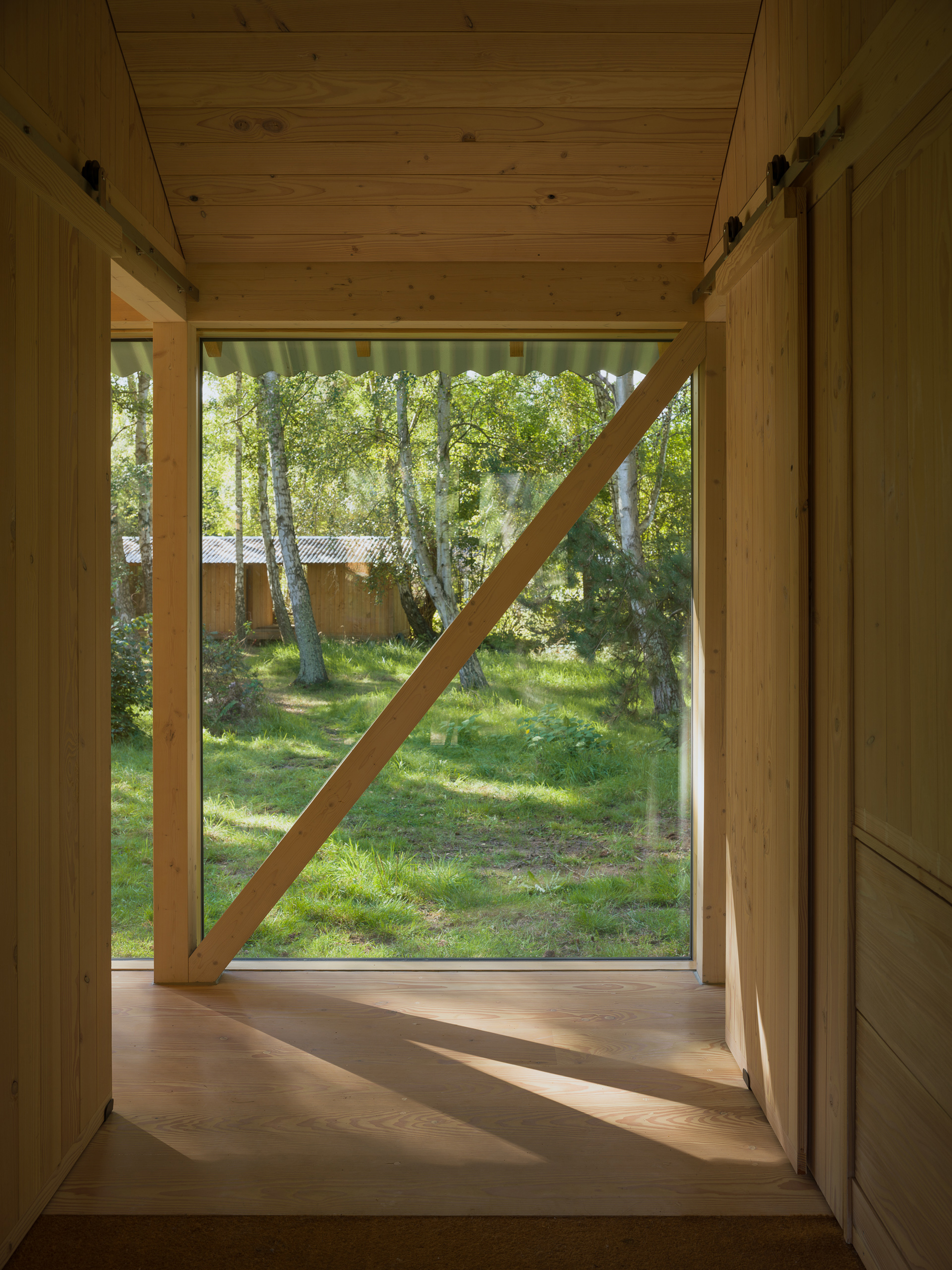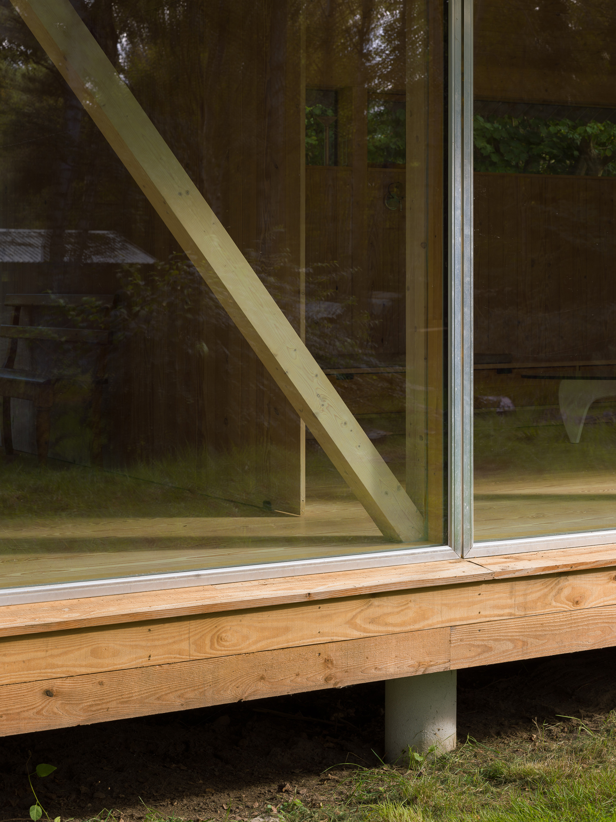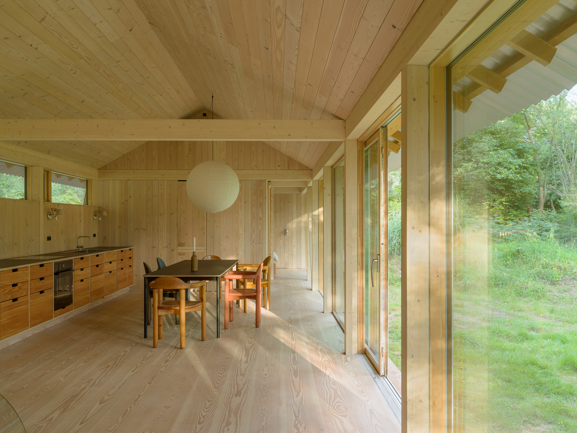 The summer house is an interpretation of a traditional longhouse typology and the vernacular architecture found in the area with the characteristic barns clad in wood. The construction is designed around a grid made of glulam, which rests on cast point foundations. The intention has been to anchor the house more gently and be able to preserve the old trees on the site and hopefully create the impression that it rests on tree trunks and that the architecture does not oppress its natural surroundings and the forest floor.