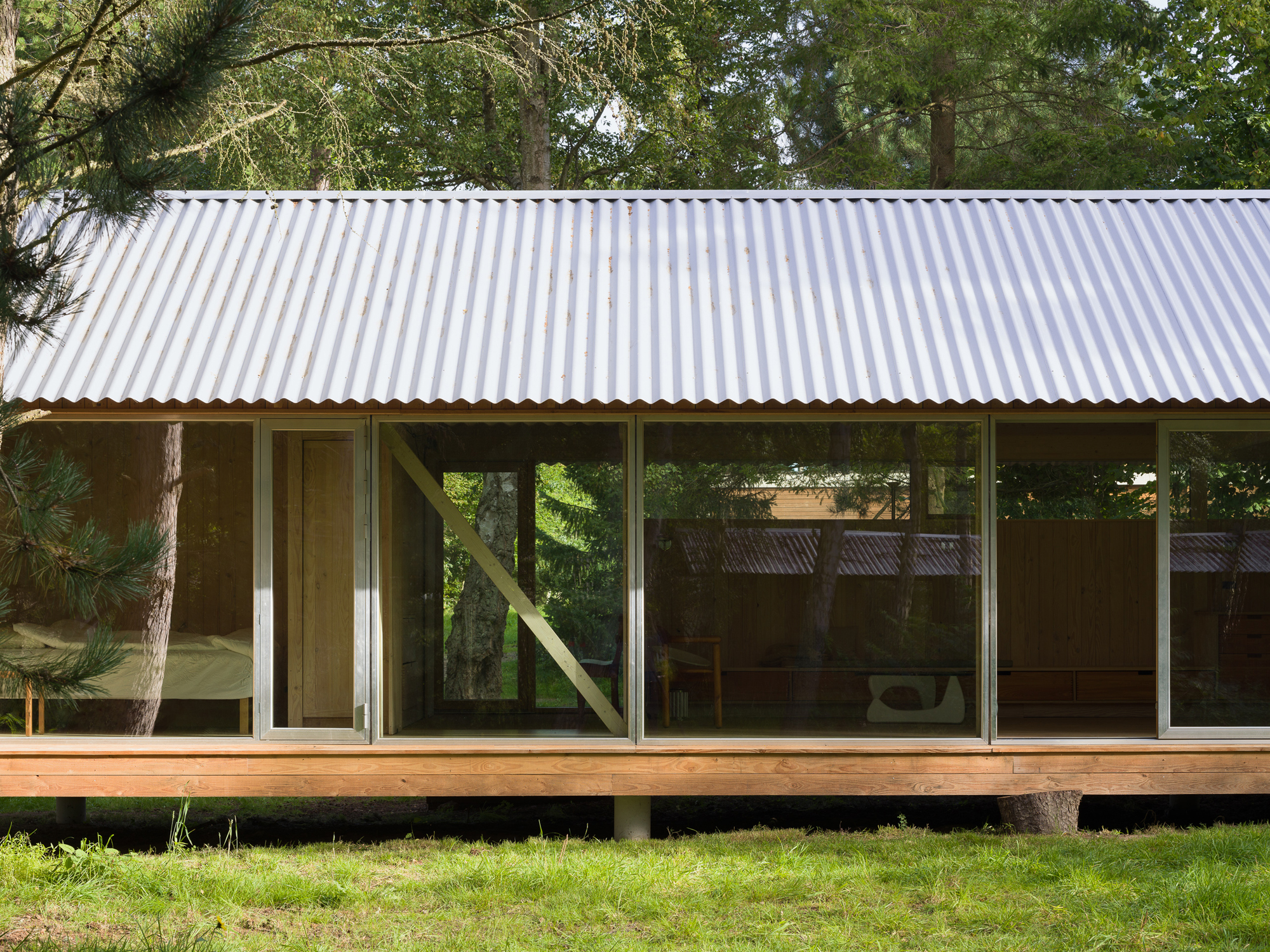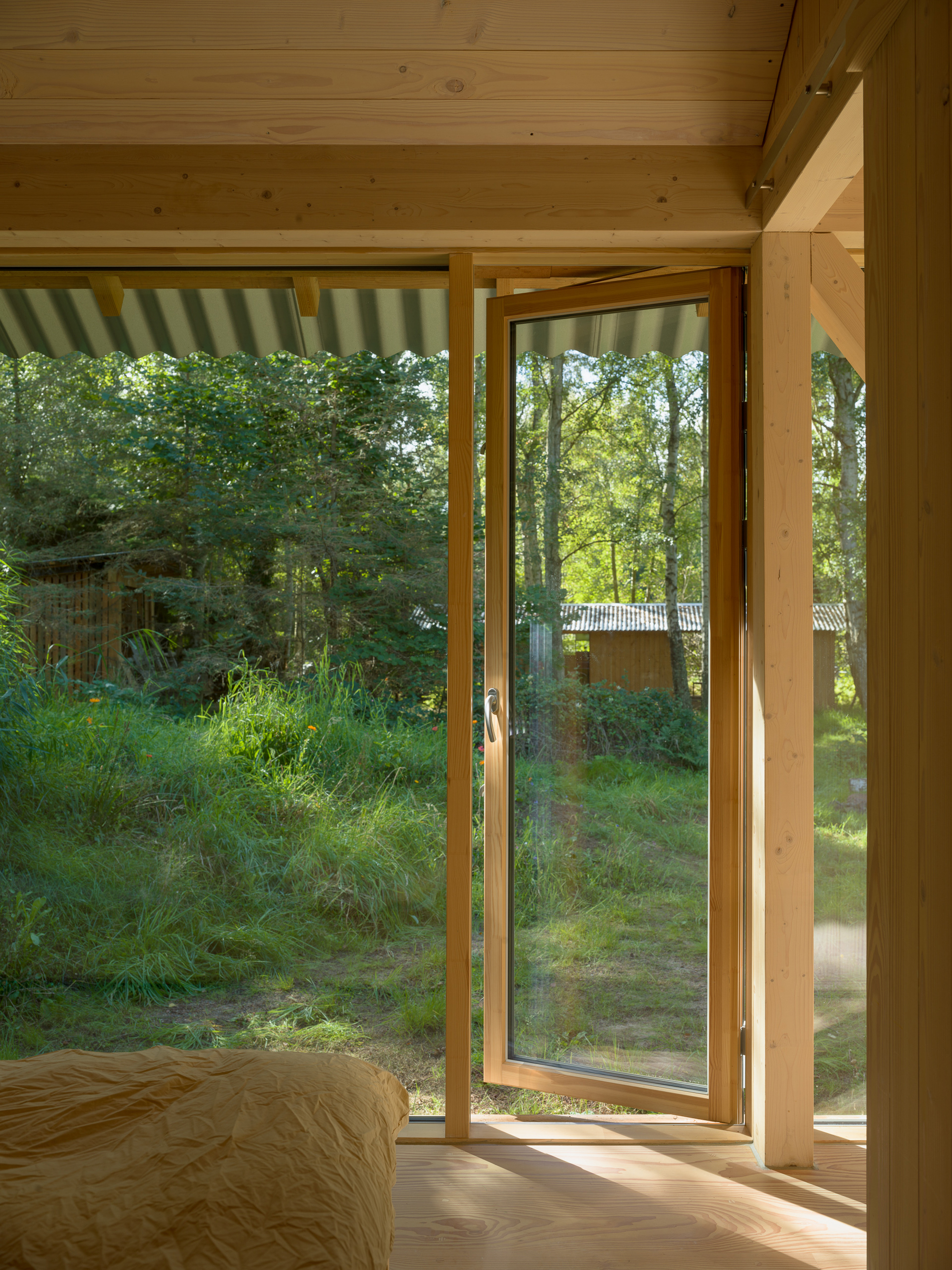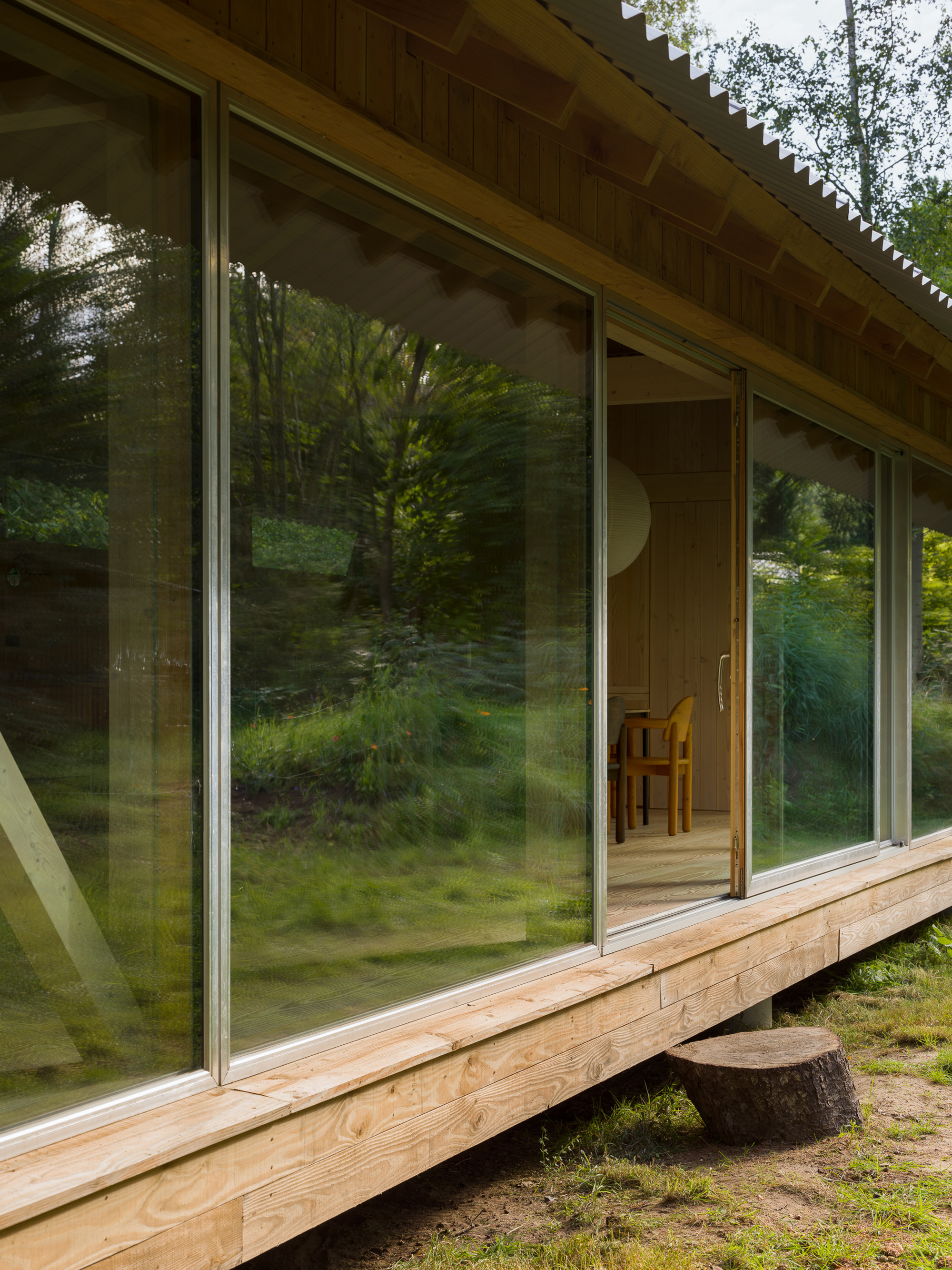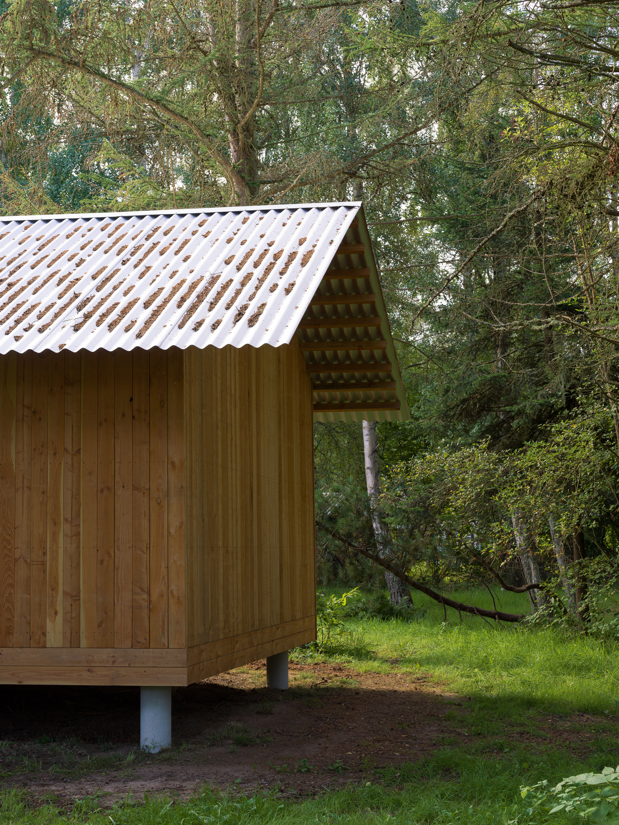 The summer house is an interpretation of a traditional longhouse typology and the vernacular architecture found in the area with the characteristic barns clad in wood. The construction is designed around a grid made of glulam, which rests on cast point foundations. The intention has been to anchor the house more gently and be able to preserve the old trees on the site and hopefully create the impression that it rests on tree trunks and that the architecture does not oppress its natural surroundings and the forest floor.