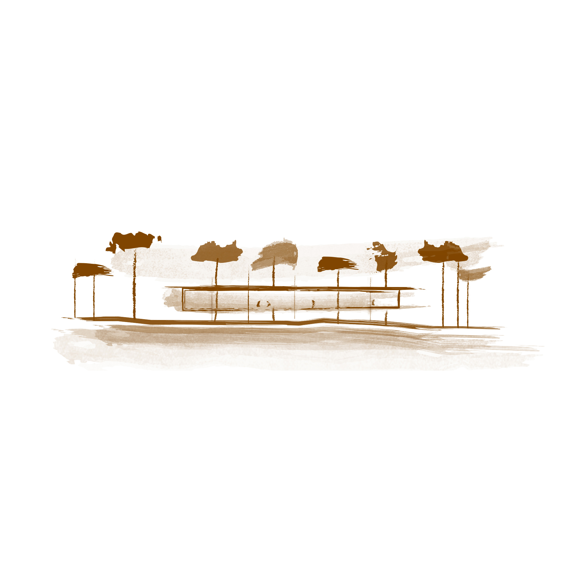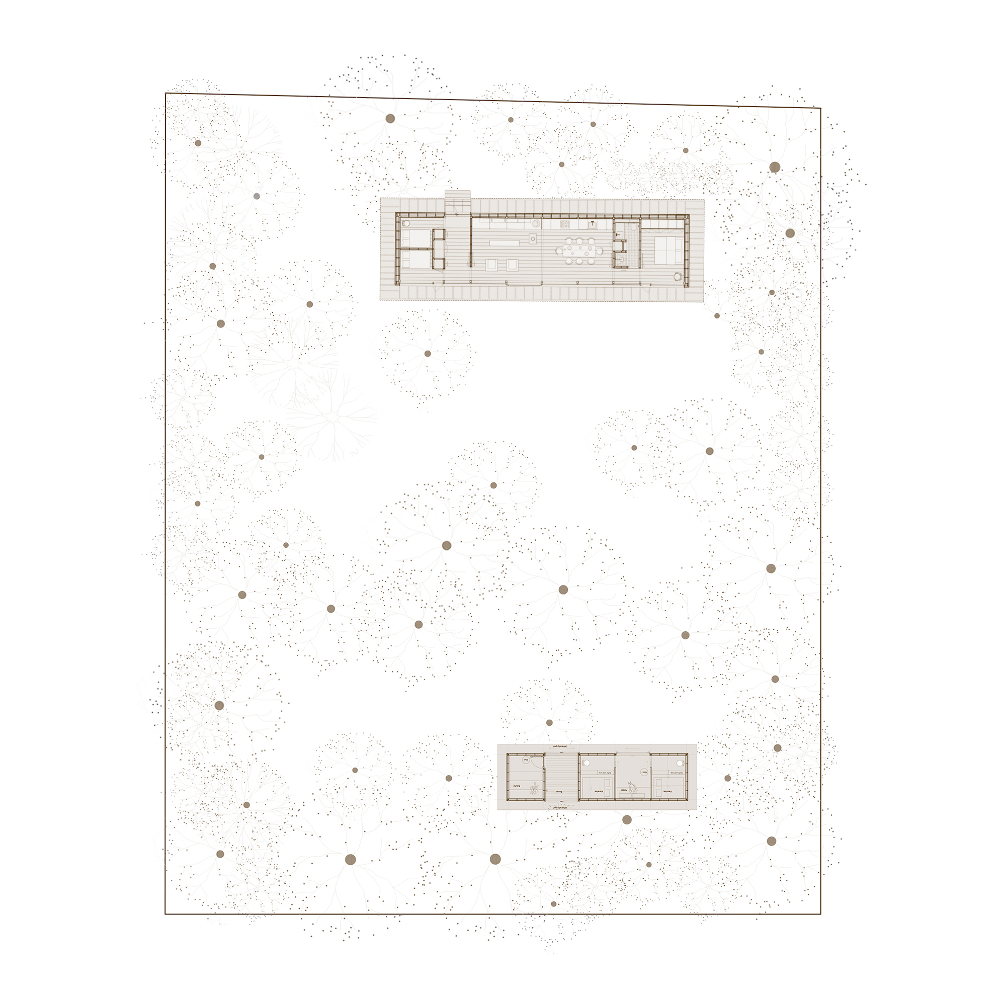 Contrasting with the windswept coast is the space under the vertical old birch and pine trees. It is intended to enhance the sense of tranquility, residing here, with a house that is therefore horizontal and elongated and which complement the sculptural tree trunks in the background. The elongated building shields the view of the nearby cottages and frames a clearing in the forest. This is achieved with a north facade, facing the public areas, that is more closed and a south facade that opens up to the trees with large glass sections that capture the filtered forest light. All activity in the house takes place along the facade, so you experience that inside and outside merge and become part of the forest fauna and flora.
