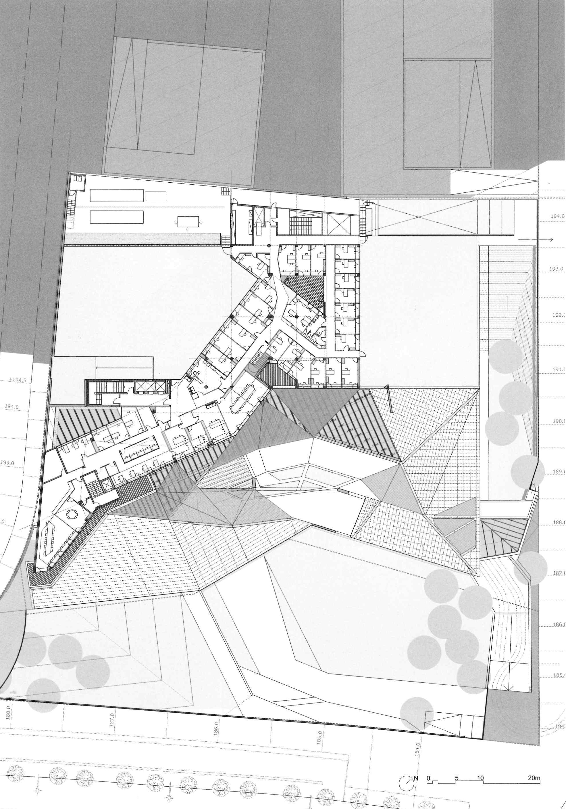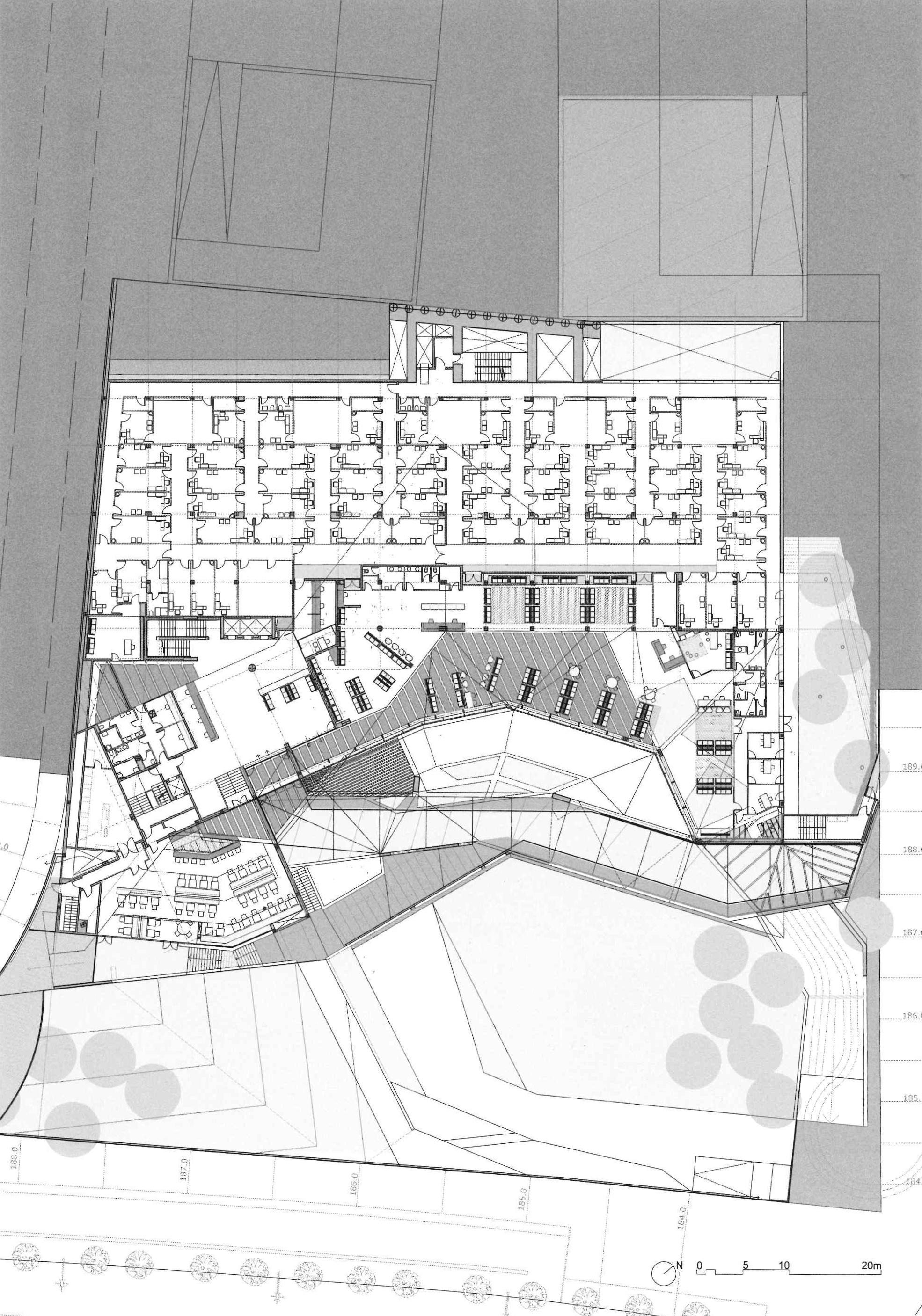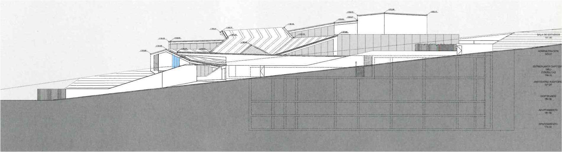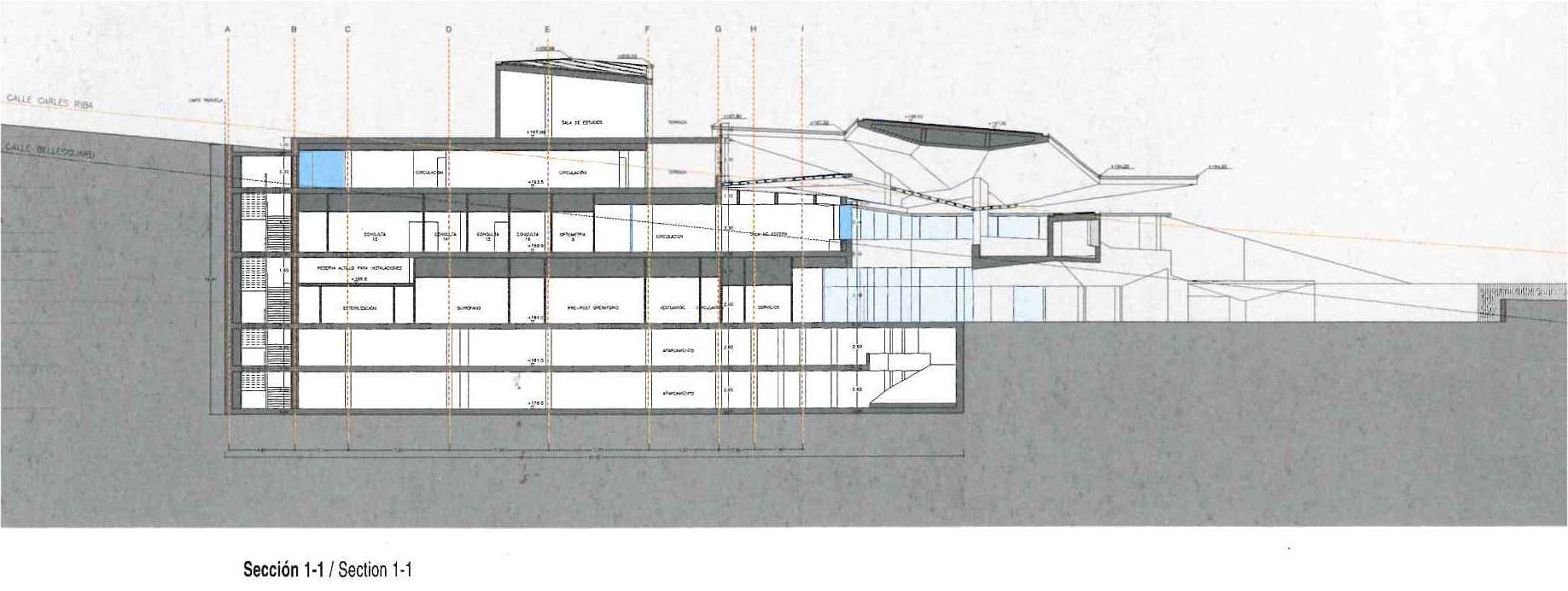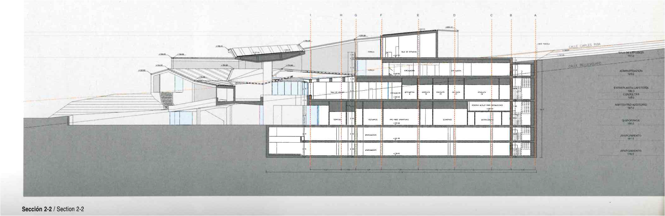 From these considerations. the idea of the competition is expressed in the section: a large part of the bulding is embeded in the ground and only emerges to face the entrance, waiting rooms, administration areas, offices and library off-limits to patients towards the city (with extraordinary views over Barcelona and the sea).