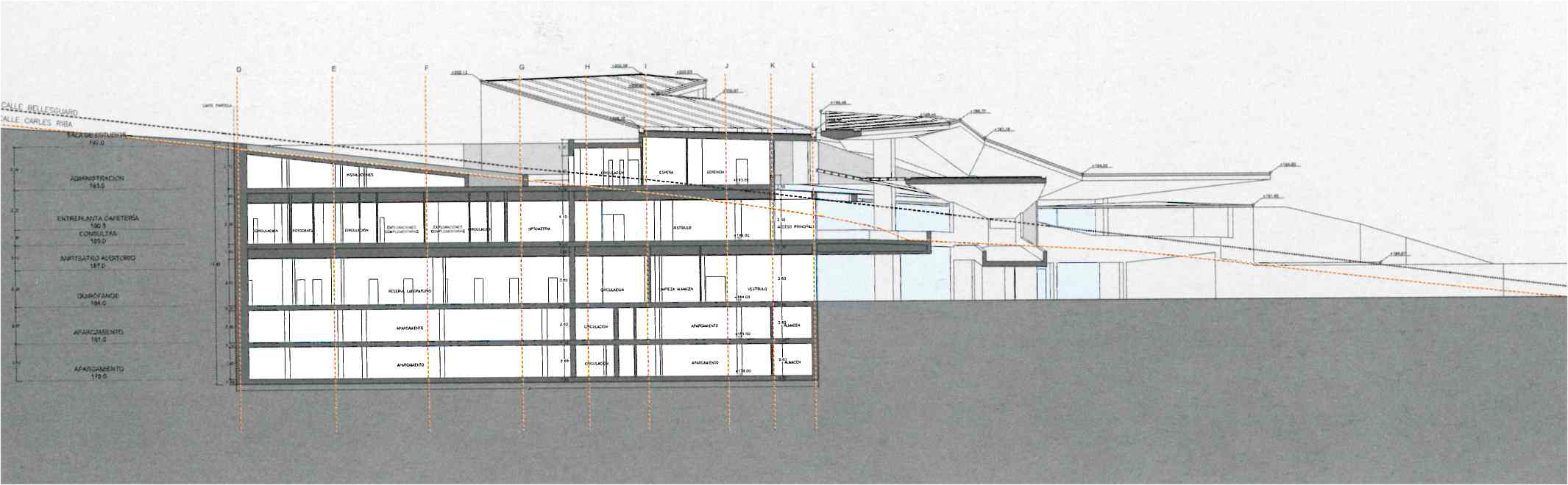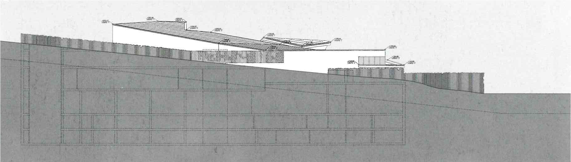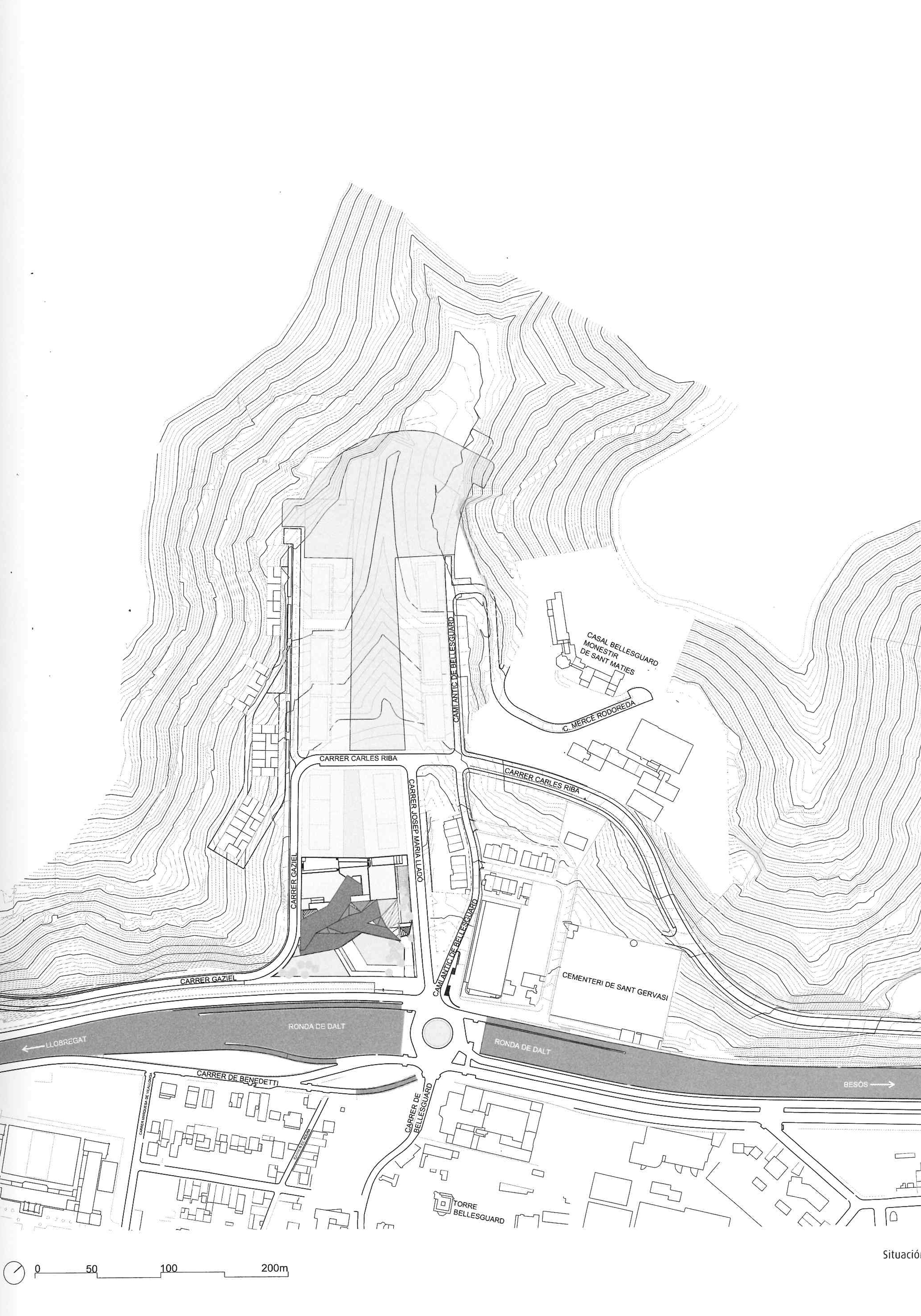 The Ronda de Dalt ring road separating Barcelona from the Sierra de Collserola has been always regarded as a traffic and access route but above all as the boundary between the city and the mountains, between built-up and natural land. This appreciation is not entirely accurate because the city has colonized part of this natural land (as in our case). but Ronda of Dalt nevertheless still marks a sort of city limits, to the west of which the natural territory predominates over the built-up territory. This dominion is transferred physically to the land on a considerable slope that should undoubtedly quality the building that covers it.